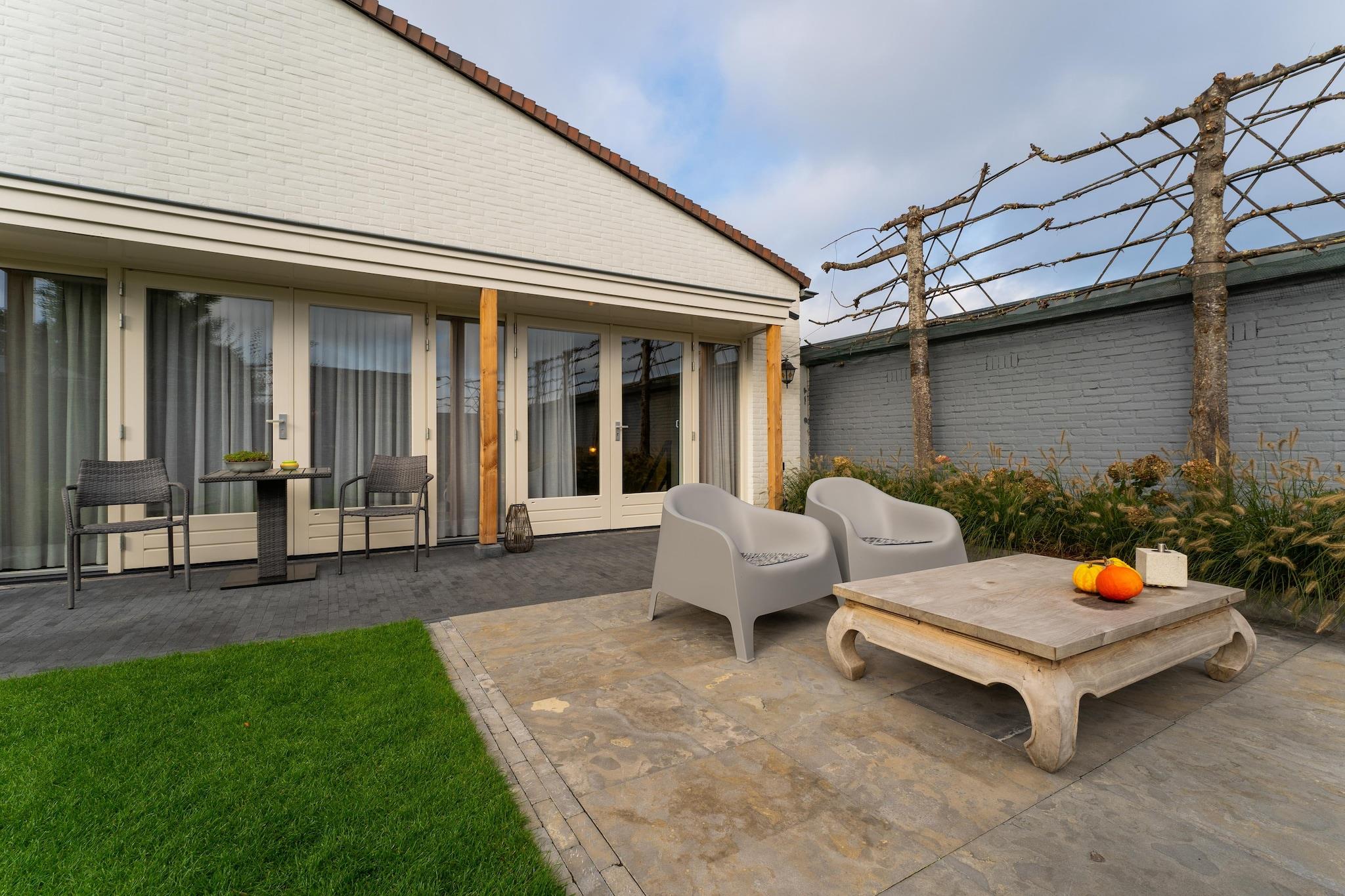 Parterre: (Wohnzimmer(TV(smart TV), Esstisch, Sitzecke), offene Küche(Kochplatte(elektrisch), Wasserkocher, Dunstabzugshaube, Kaffeemaschine, Kombi-Mikrowelle, Spülmaschine, Kühlschrank), Schlafzimmer(Doppelbett(Boxspring, 180 x 210 cm)), Badezimmer(Dusche(ebenerdige Dusche), Waschbecken, Toilette)) Nebengebäude: (Hottub) Heizung(Fußbodenheizung), Innenhof, Garten, Gartenmöbel, Parkplatz