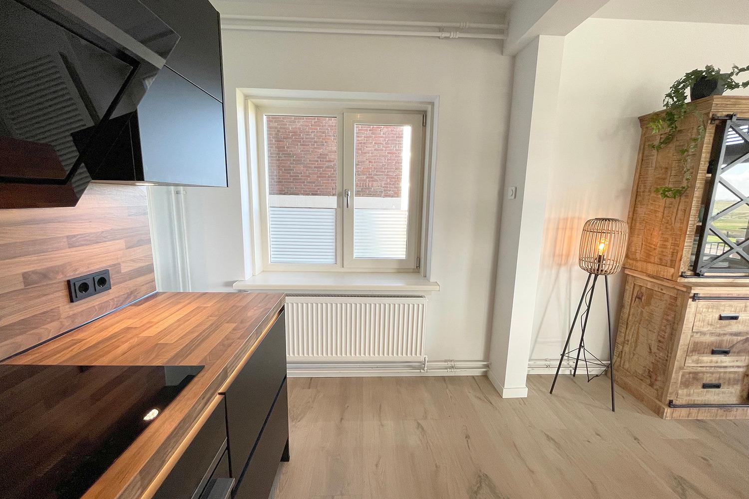 Das Wohnzimmer ist schön hell durch viele große Fenster und mit viel Liebe zum Detail eingerichtet, wie z.B. die dekorativen Kissen und die Bepflanzung im Zimmer. Ein Esstisch mit 6 Stühlen bietet Platz, um abends ein Spiel zu spielen, aber auch, um ein ausgiebiges Abendessen gemeinsam zu genießen. Die Küche ist mit allen modernen Geräten wie einer Kombi-Mikrowelle und einem Geschirrspüler für die einfache Zubereitung von Mahlzeiten ausgestattet.