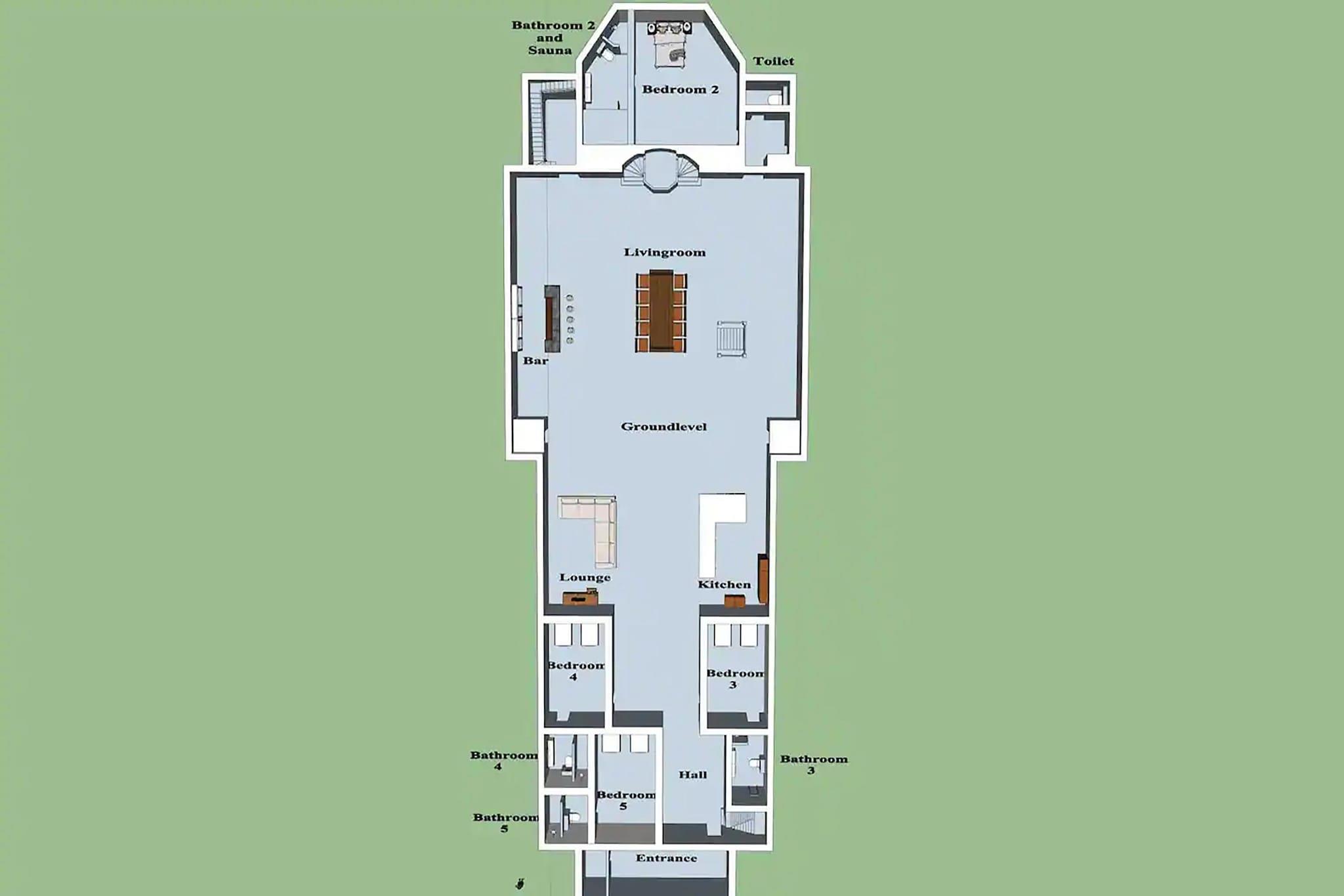Parterre: (Eingangshalle(Toilette), offene Küche(Kochplatte(6 Kochplatten, Gas), Kaffeemaschine(Filter), Kaffeemaschine(Filter), Backofen, Backofen, Spülmaschine, Spülmaschine, Kühlschrank, Tiefkühlschrank), Wohn/Esszimmer(TV, Esstisch, Herd, Sitzecke, Bar), Schlafzimmer mit Badezimmer(Doppelbett(180 x 200 cm), TV, Dusche, Sauna, Waschbecken, Toilette), Schlafzimmer mit Badezimmer(Einzelbett, Einzelbett, TV, Dusche, Waschbecken, Toilette), Schlafzimmer mit Badezimmer(Einzelbett, Einzelbett, TV, Dusche, Waschbecken, Toilette), Schlafzimmer mit Badezimmer(Einzelbett, Einzelbett, TV, Dusche, Waschbecken, Toilette)) In der 1. Etage: (Schlafzimmer mit Badezimmer(Doppelbett(180 x 200 cm), TV, Whirlwanne, Dusche, Toilette, Balkon), Empore) Trockner, Waschmaschine, Whiteboard, Klimaanlage, Terrasse, Garten, Gartenmöbel, Parkplatz