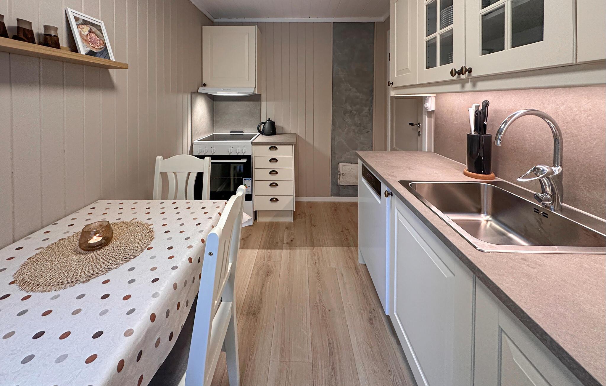 Dieses Ferienhaus ist die ideale Wahl für alle, die ein authentisches Westnorwegen-Erlebnis suchen – mit Ruhe, Natur und echtem Fjordleben im Mittelpunkt. Hier können Sie ruhige Tage mit Panoramablick und unmittelbarer Nähe zur Natur genießen. Bereiten Sie in der kompakten Essküche Ihre Urlaubsmahlzeiten zu und kommen Sie in der gemütlichen Sofaecke zu gemütlichen Stunden mit Ihren Liebsten zusammen.