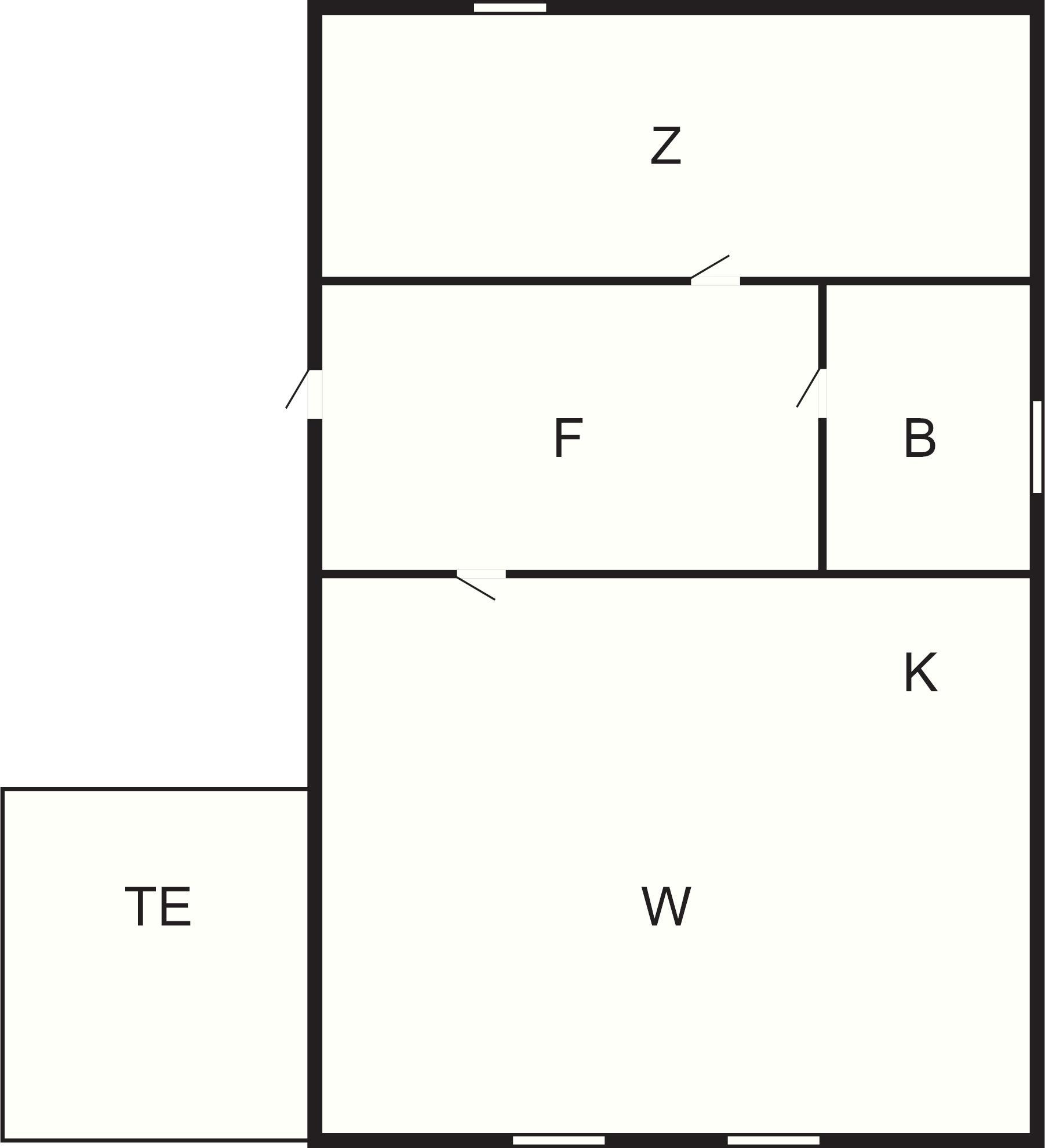 Das Ferienhaus hat einen offenen Küchen-/Wohnbereich und ein Schlafzimmer mit Doppelbett sowie Etagenbett mit zwei Kojen. Im Außenbereich kleine Terrasse.