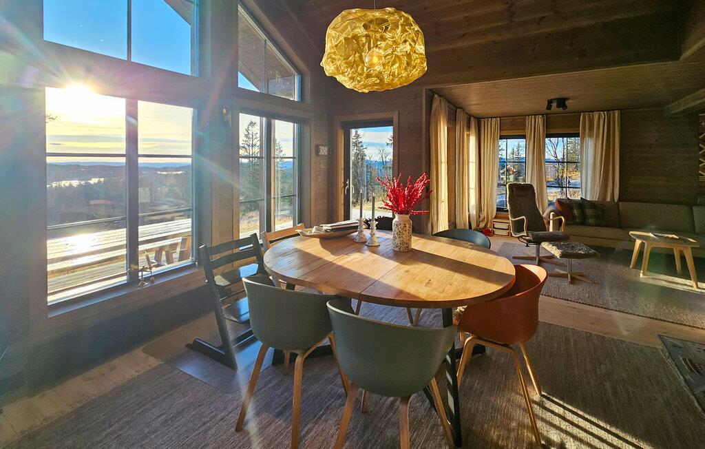 Spüren Sie im hellen Wohnbereich sofort das harmonische Zusammenspiel von Design und Gemütlichkeit. Entspannen Sie sich auf dem weichen Sofa oder nehmen Sie am eleganten Holzesstisch Platz, während Ihr Blick durch die großen Fenster weit über das Tal schweift. Der Kaminofen sorgt an kühlen Tagen für wohlige Wärme. In der offenen Küche können Sie ein gemütliches Abendessen zubereiten.
