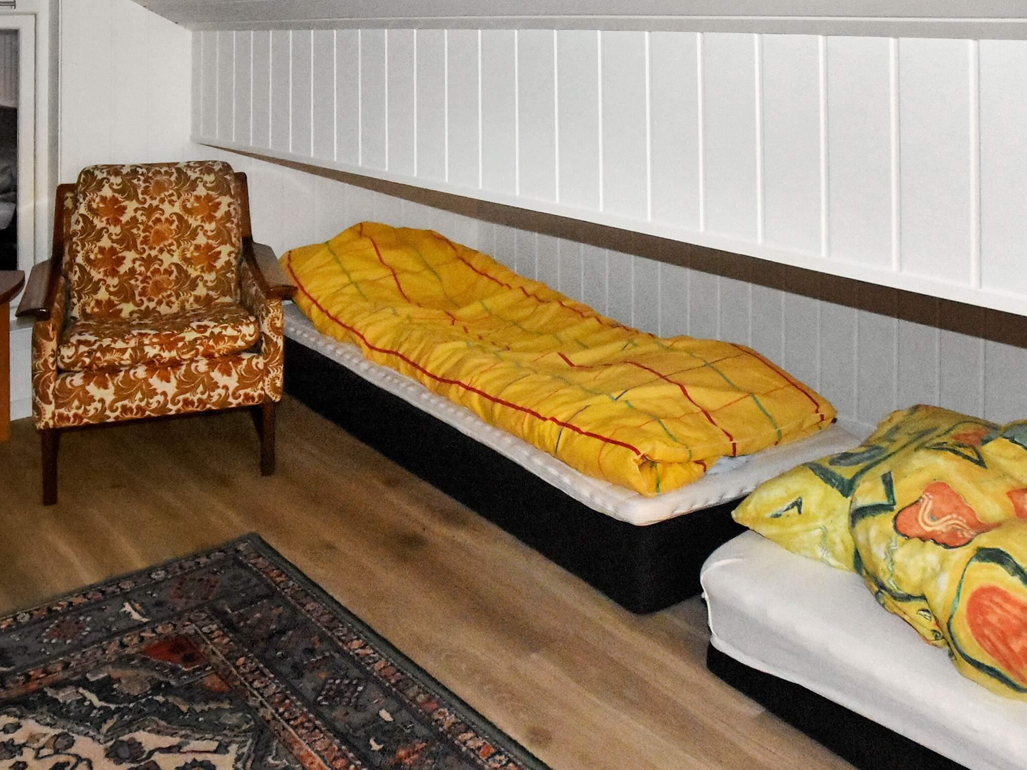 In einem der drei Schlafzimmer steht ein 120 cm breites Einzelbett. Gute Treppe hinauf zum geräumigen Schlafhems mit zwei Einzelbetten, die ggf. zusammengestellt werden können.