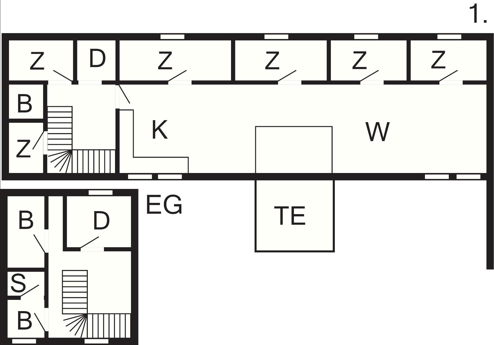6 Schlafz.: (1DB)+(1DB+1K)+(1DB+2B)+(2B)+(2B)+(2B), Kinderbett