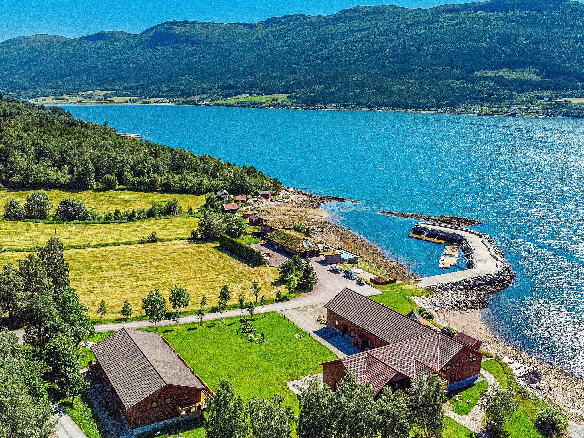 Schönes Resort mit Gemeinschaftspool, direkt am Fjord und umgeben von einer fantastischen Fjord- und Berglandschaft.