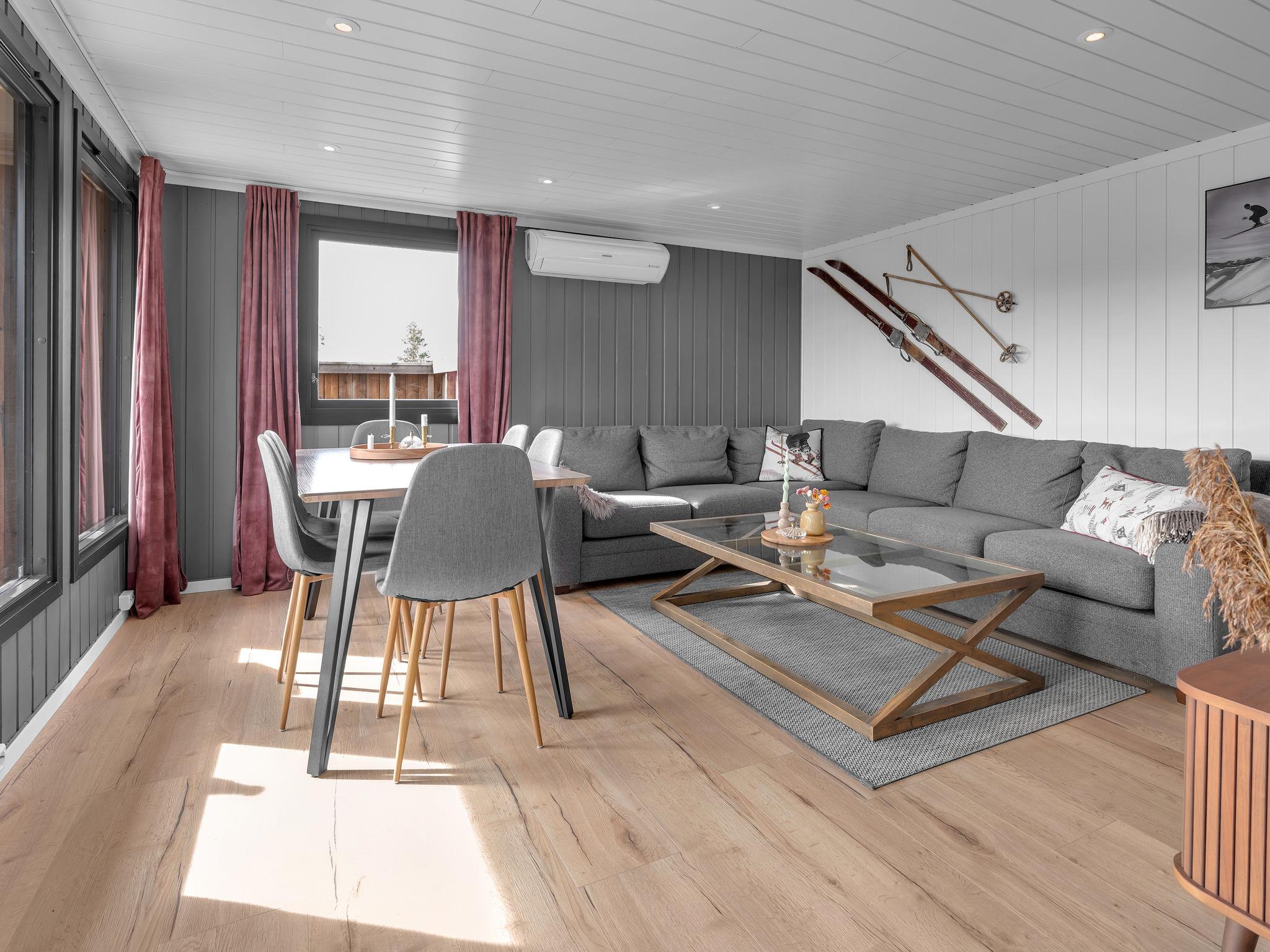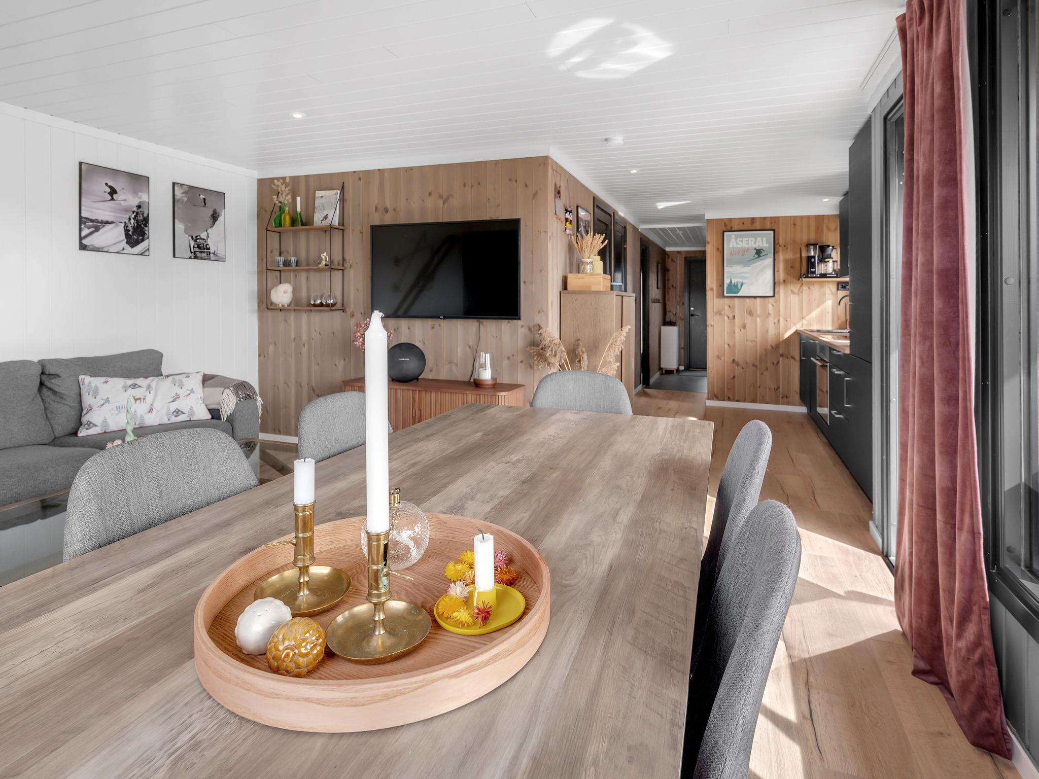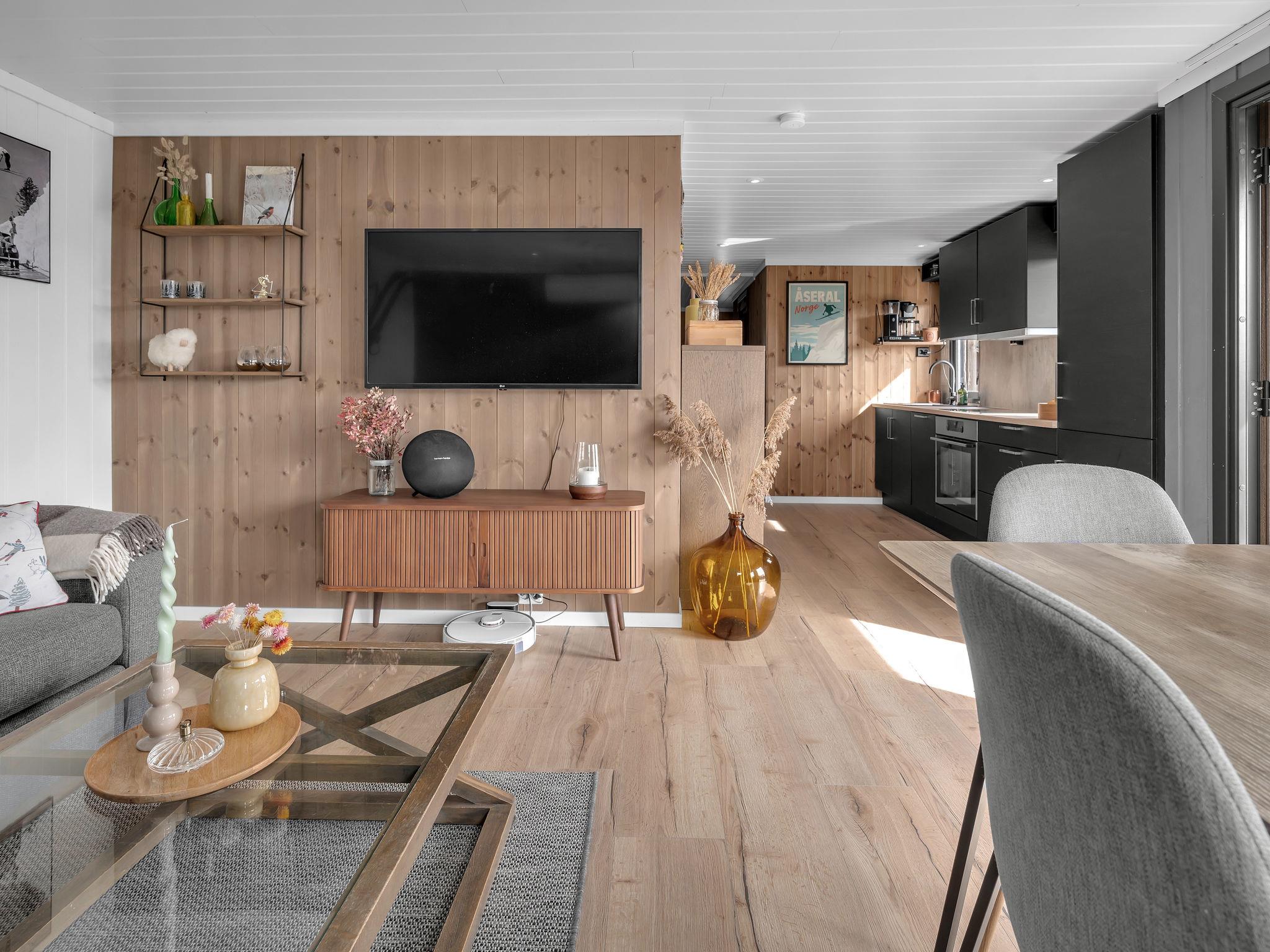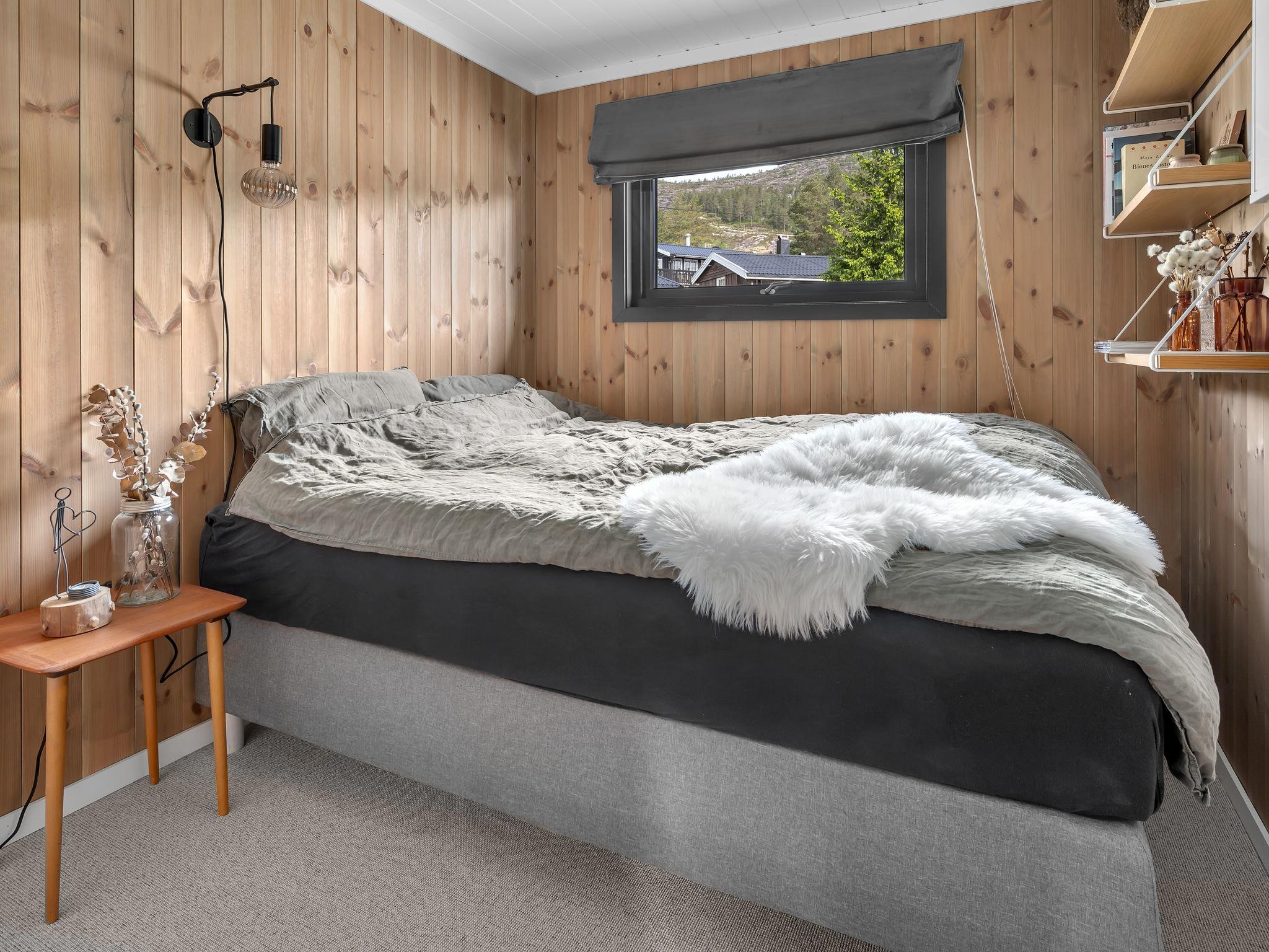 "Kosetoppen", 4-Zimmer-Haus 50 m2. Hell, vollständig renoviert im Jahre 2022, modern und mit viel Holz eingerichtet: offenes Wohn-/Esszimmer mit Esstisch und TV. Ausgang zur Terrasse. 1 Doppelzimmer mit 1 Doppelbett (150 cm, Länge 200 cm). 2 Zimmer, jedes Zimmer mit 1 x 2 Etagenbetten (75 cm, Länge 200 cm). Küche (Backofen, Geschirrspüler, 4 Induktionskochplatten, Toaster, Wasserkocher, Tiefkühler, elektrische Kaffeemaschine). Dusche/WC. E-Heizung, Warmluftheizung, Fussbodenheizung. Terrassenmöbel, Gartengrill (mobil). Schöne Panoramasicht auf den See und die Berge. Bitte beachten: Nichtraucher-Haus. 924531169