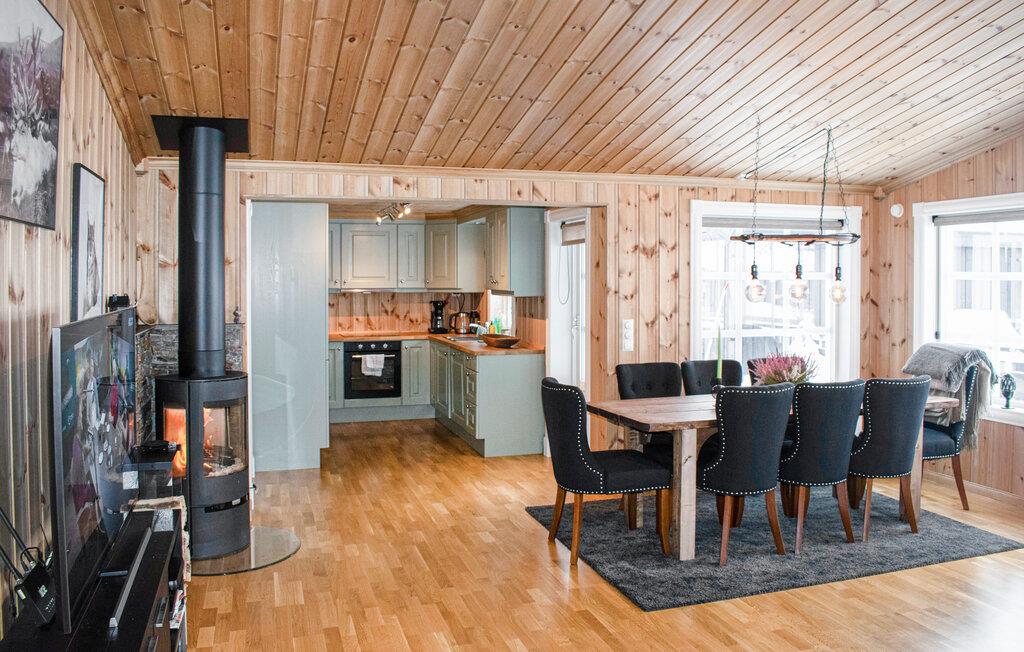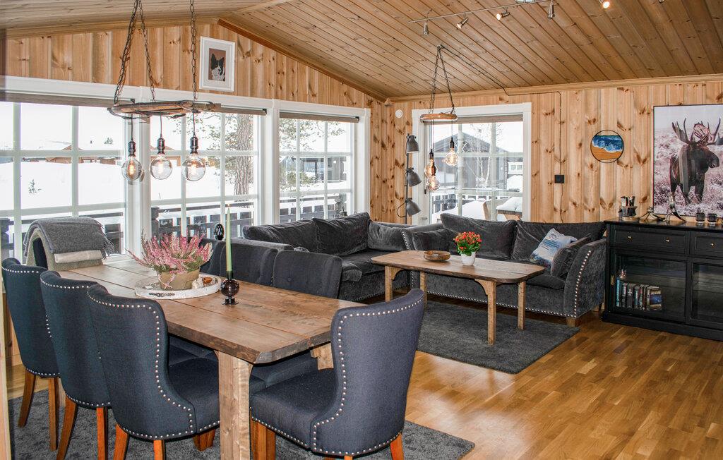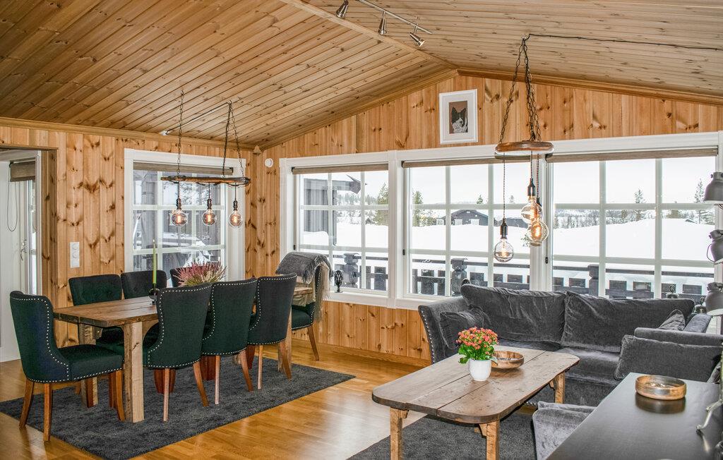 Herzlich willkommen in diesem familienfreundlichen Ferienhaus. Das warme Holzambiente gepaart mit den ansehnlichen Sitzmöbeln schafft eine behagliche Stimmung und eine sorglose Atmosphäre. Gehen Sie den Tag in aller Ruhe mit einem schönen Frühstück an. An dem schönen Holzesstisch ist Platz für gemeinsame Mahlzeiten, während im Hintergrund das Feuer im Kaminofen für Wärme und Gemütlichkeit sorgt. Legen Sie in den weichen Sofas die Beine hoch und lesen Sie Ihren Kindern ein Buch vor. Oder schauen Sie aus dem Fenster und genießen Sie die Aussicht auf die umliegende Landschaft. Draußen erwartet Sie eine große Veranda und Ihre eigene Grillhütte mit Blick auf den Fjell. Verbringen Sie viel Zeit an der frischen Luft und vergnügen Sie sich bei einem gemeinsamen Grillabend.