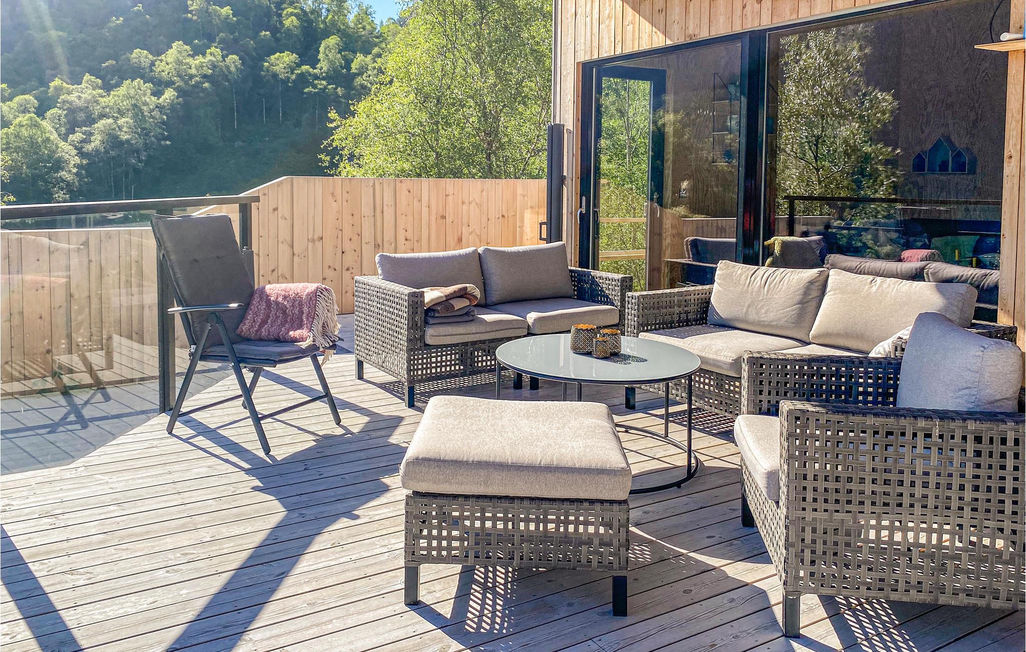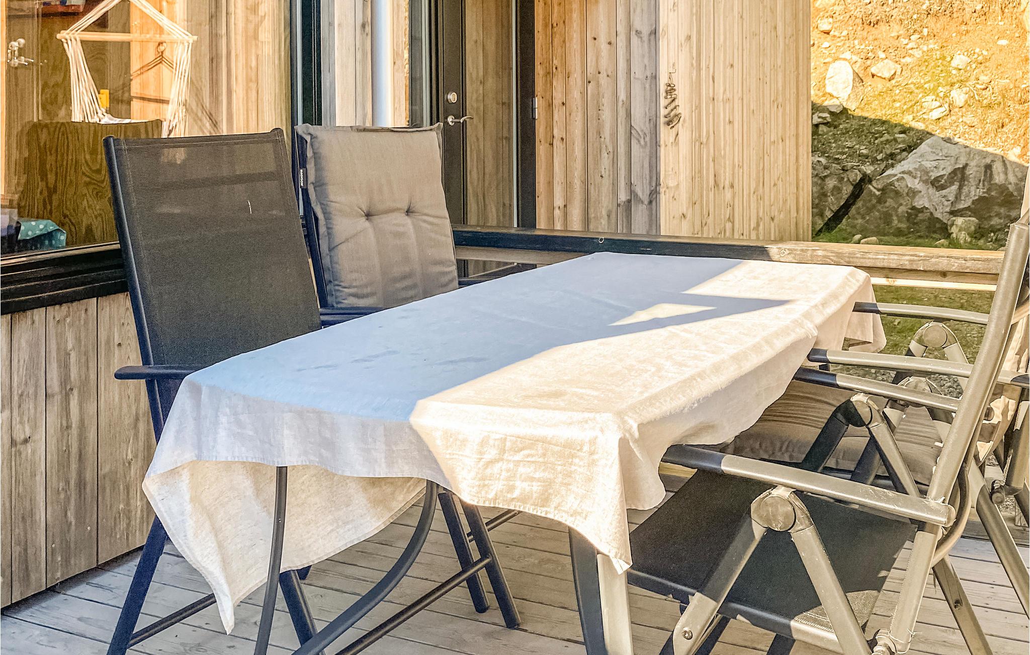 Vom Esszimmer aus gelangt man auf eine große und teilweise überdachte Terrasse, auf der Sie sich von der Sonne bescheinen lassen, Zeit in eine Lektüre investieren oder gemeinsam Mahlzeiten einnehmen können. Die Terrasse bietet einen fantastischen Blick über den Tysfjord, einen Teil des Erfjords.