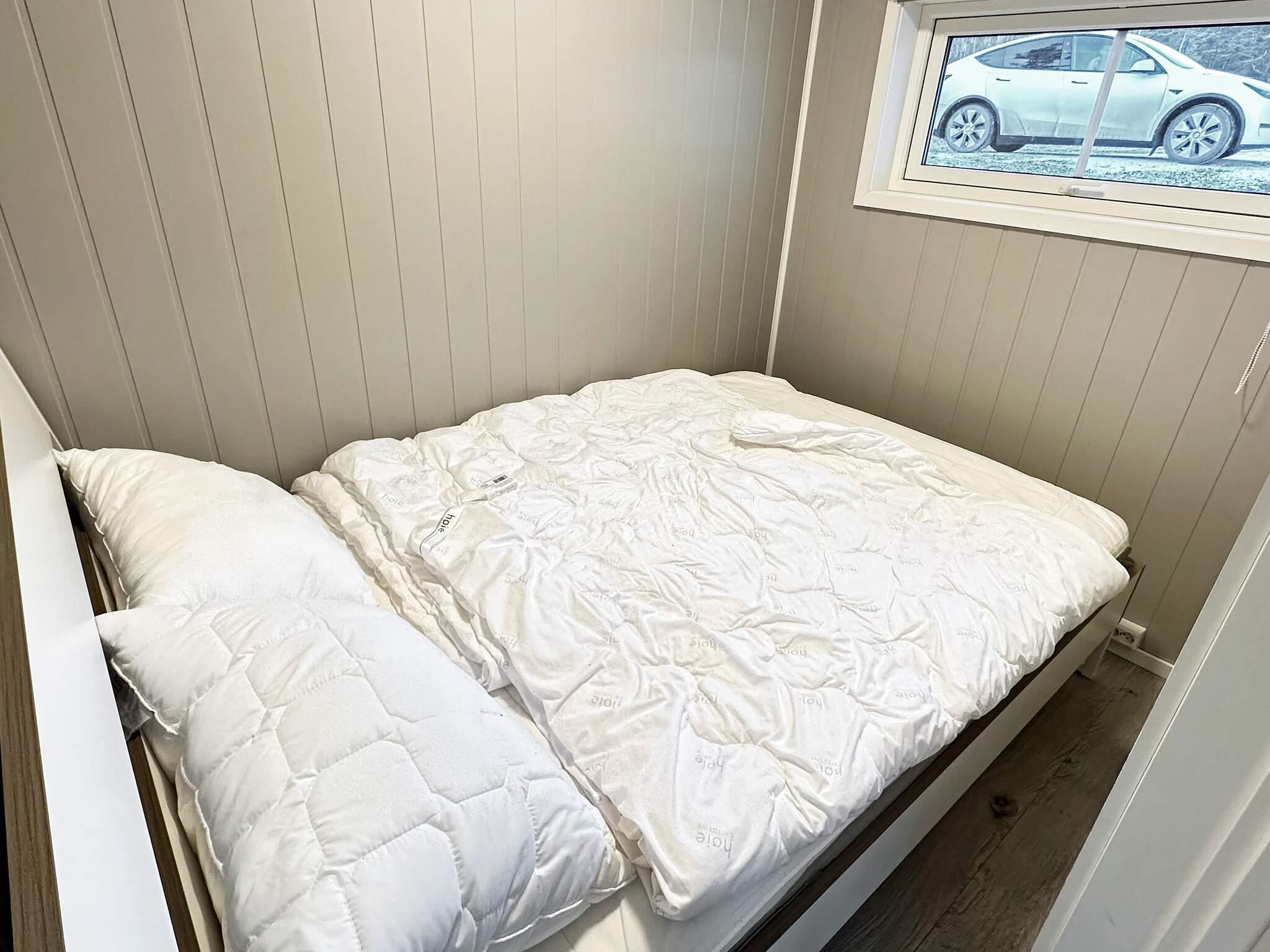 Das Ferienhaus verfügt über zwei kleine Schlafzimmer, beide mit bequemem Doppelbett ausgestattet. Das Wohnzimmer ist geschmackvoll eingerichtet und bietet u.a. über eine bequeme doppelte Schlafcouch sowie große Fenster mit Panoramablick zum Fluss. Der offene Grundriss zwischen Wohnzimmer und Küche vermittelt ein luftiges Raumgefühl und ist ideal für geselliges Beisammensein. Die Küche ist komplett mit modernen Geräten ausgestattet, sodass Sie problemlos köstliche Mahlzeiten für die Familie zubereiten können. Essbereich mit toller Aussicht. Schönes Badezimmer mit Dusche und WC.