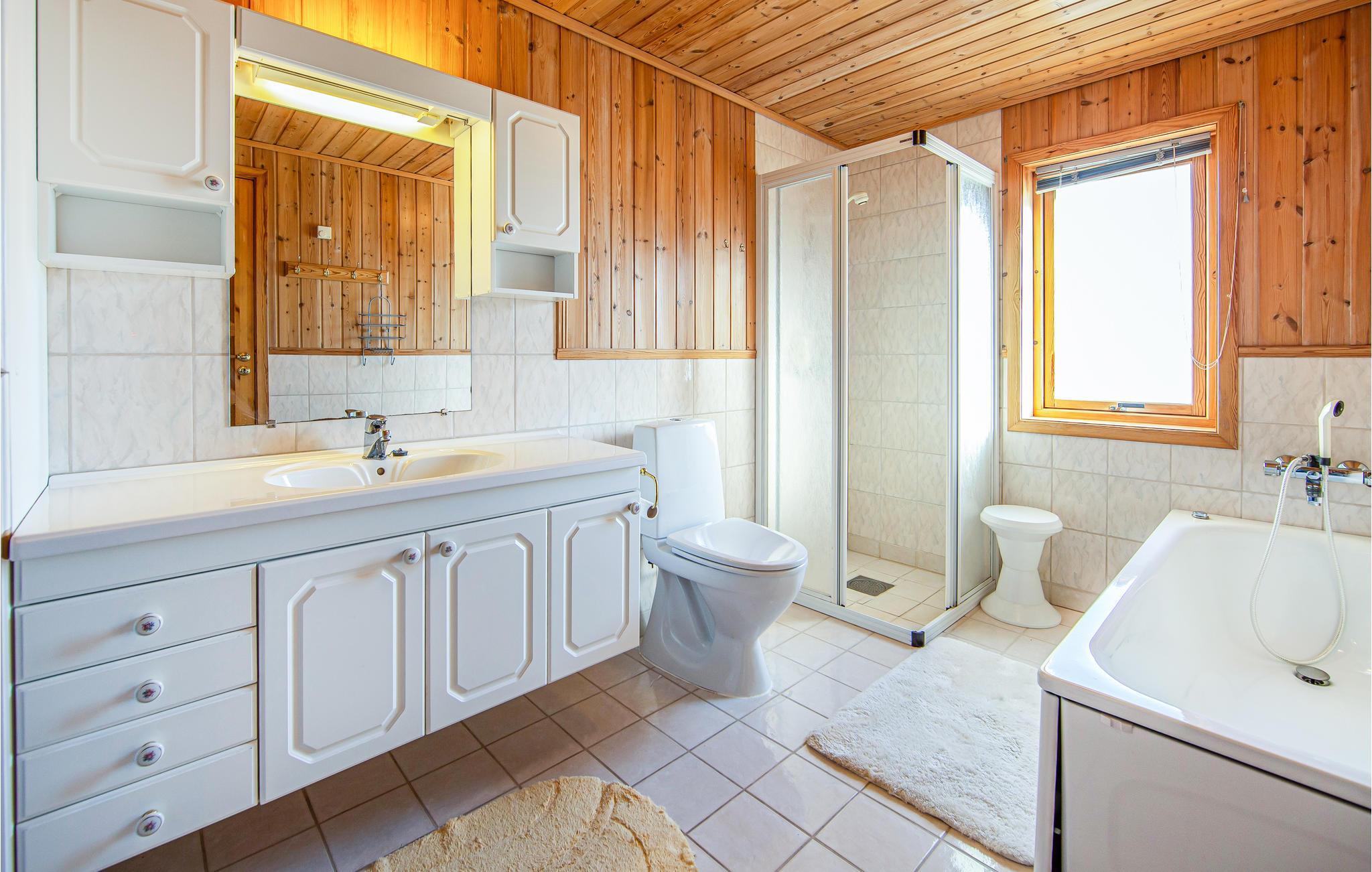 Badezimmer (nr. 1) - WC. Warmes und kaltes Wasser. Handdusche, Wanne und Dusche