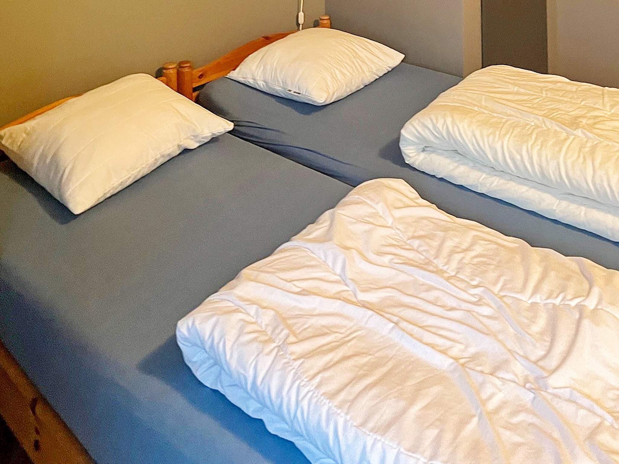 Vom Erdgeschoss führt eine Treppe hinauf in die 1. Etage, wo sich ein Flur und 4 Schlafzimmer befinden; eines davon mit einem Doppelbett und drei weitere mit jeweils zwei Einzelbetten.