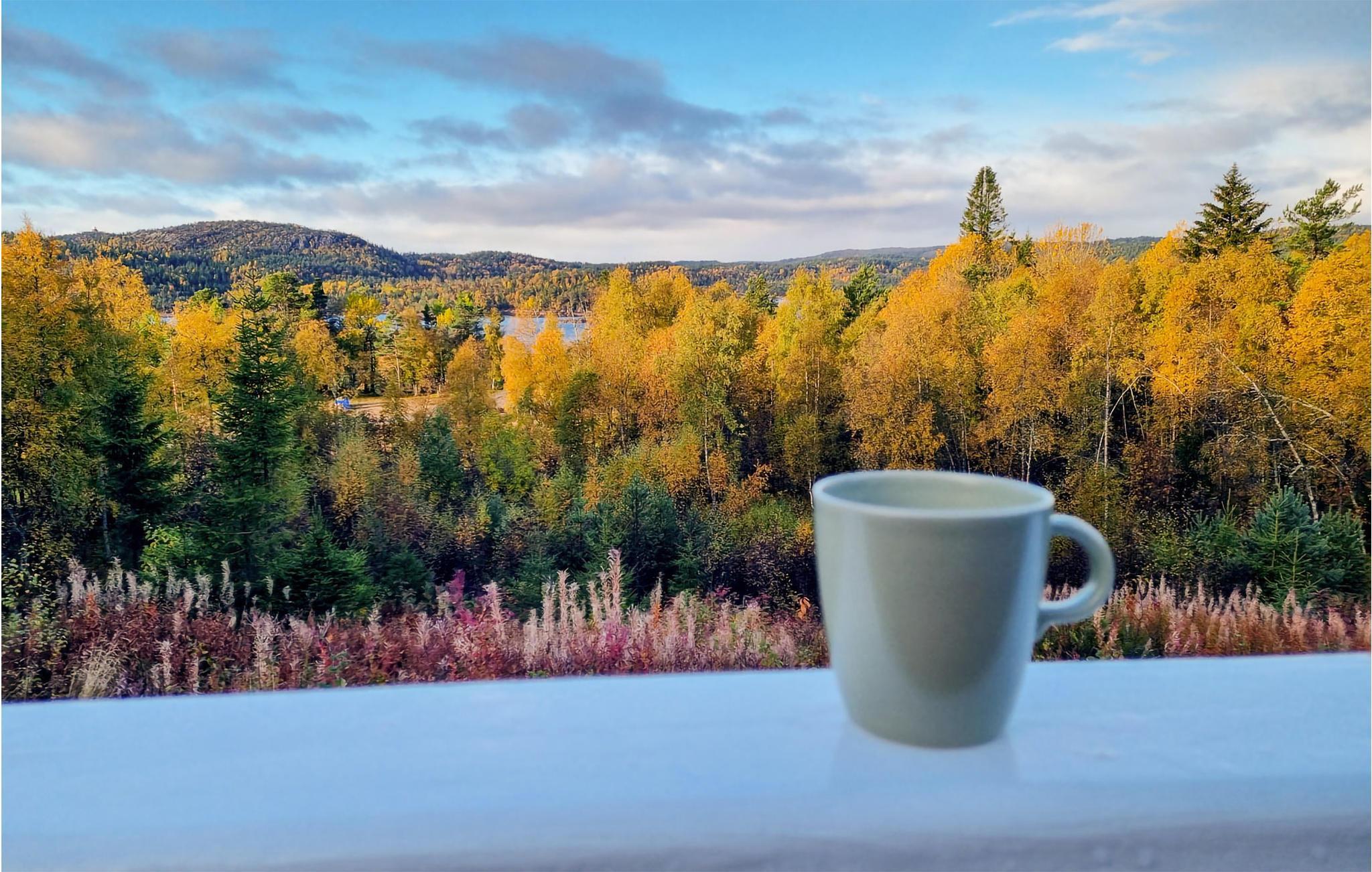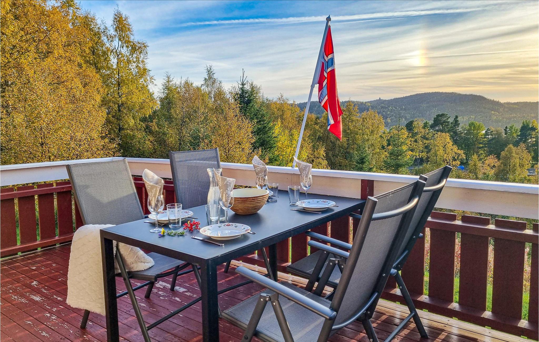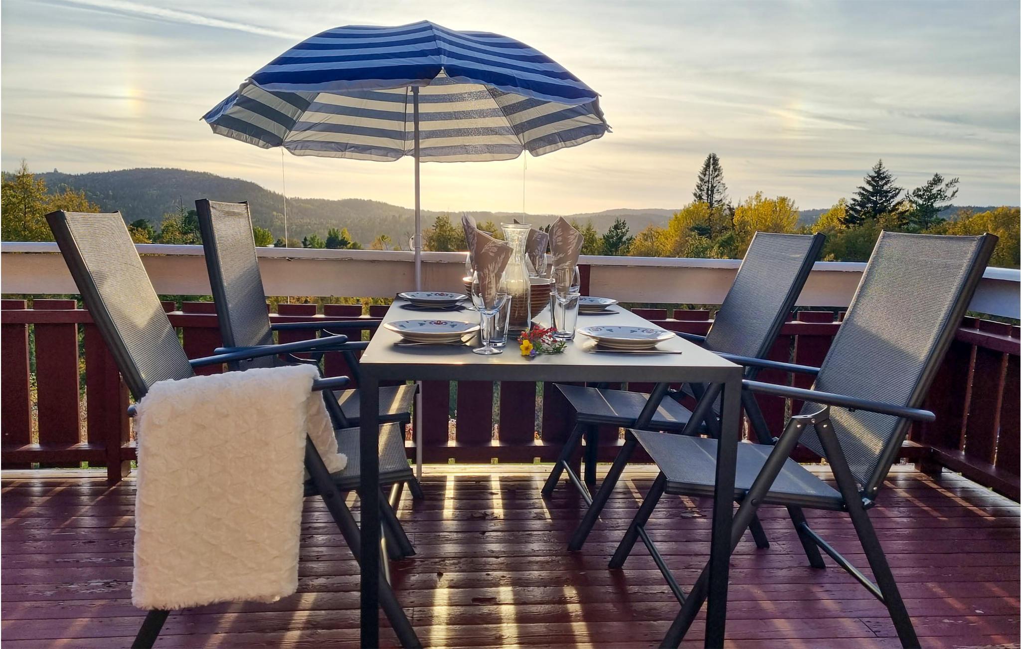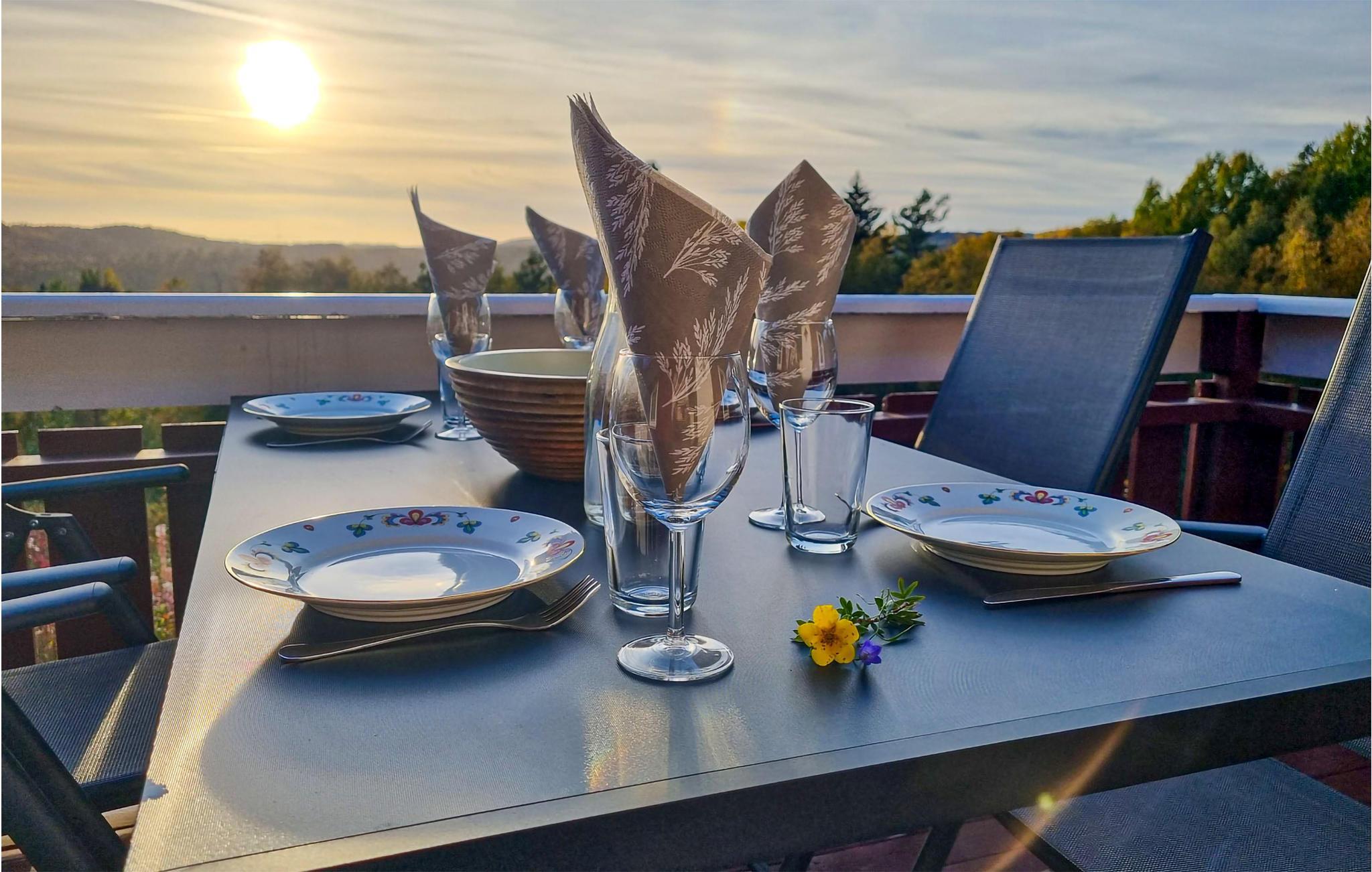 Sie haben Zugang zu einer Terrasse mit Gartenmöbeln. Genießen Sie hier den ersten Kaffee, während Sie den Blick über die Wälder schweifen lassen.