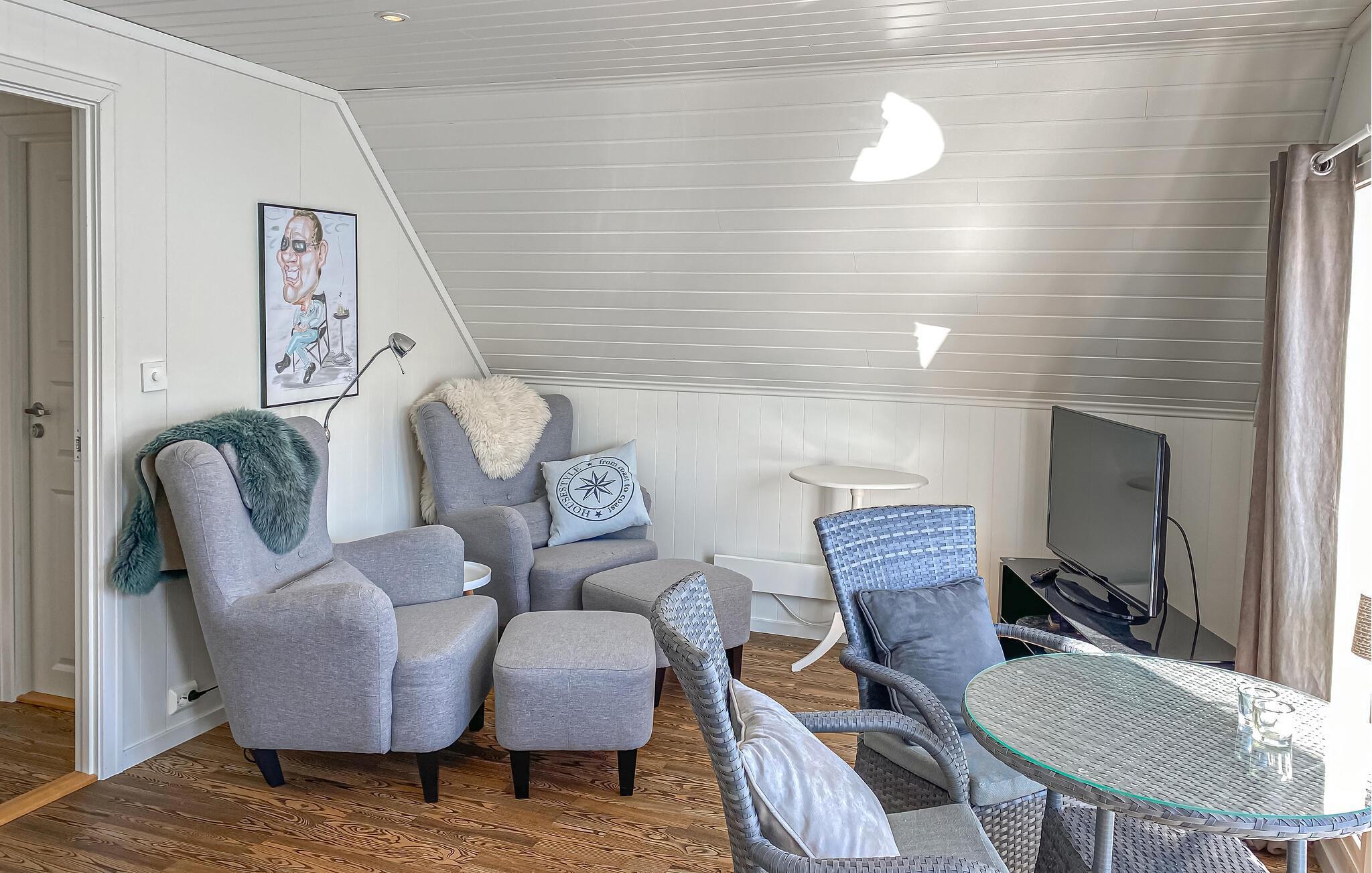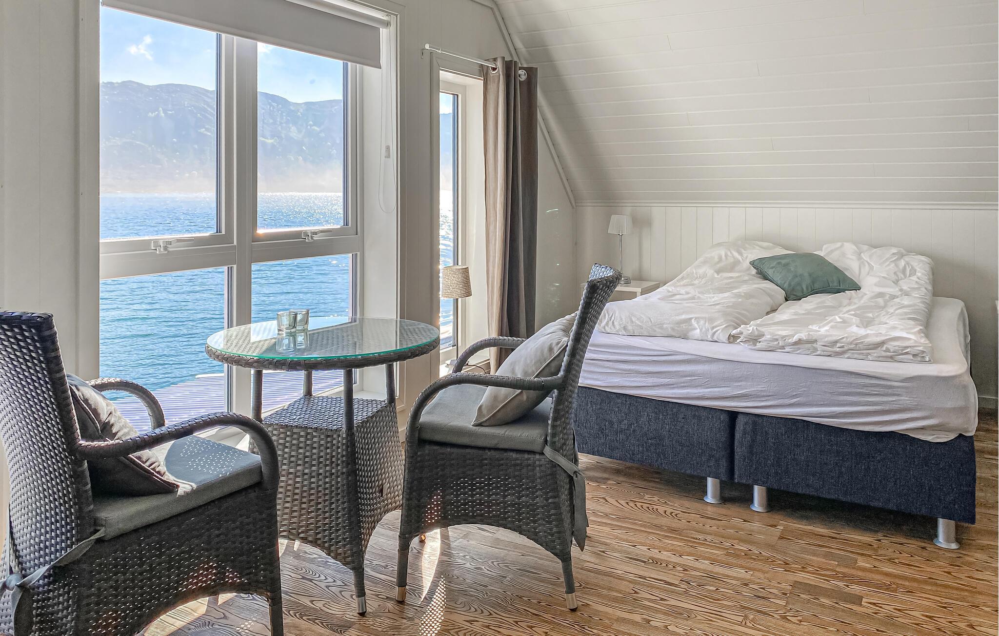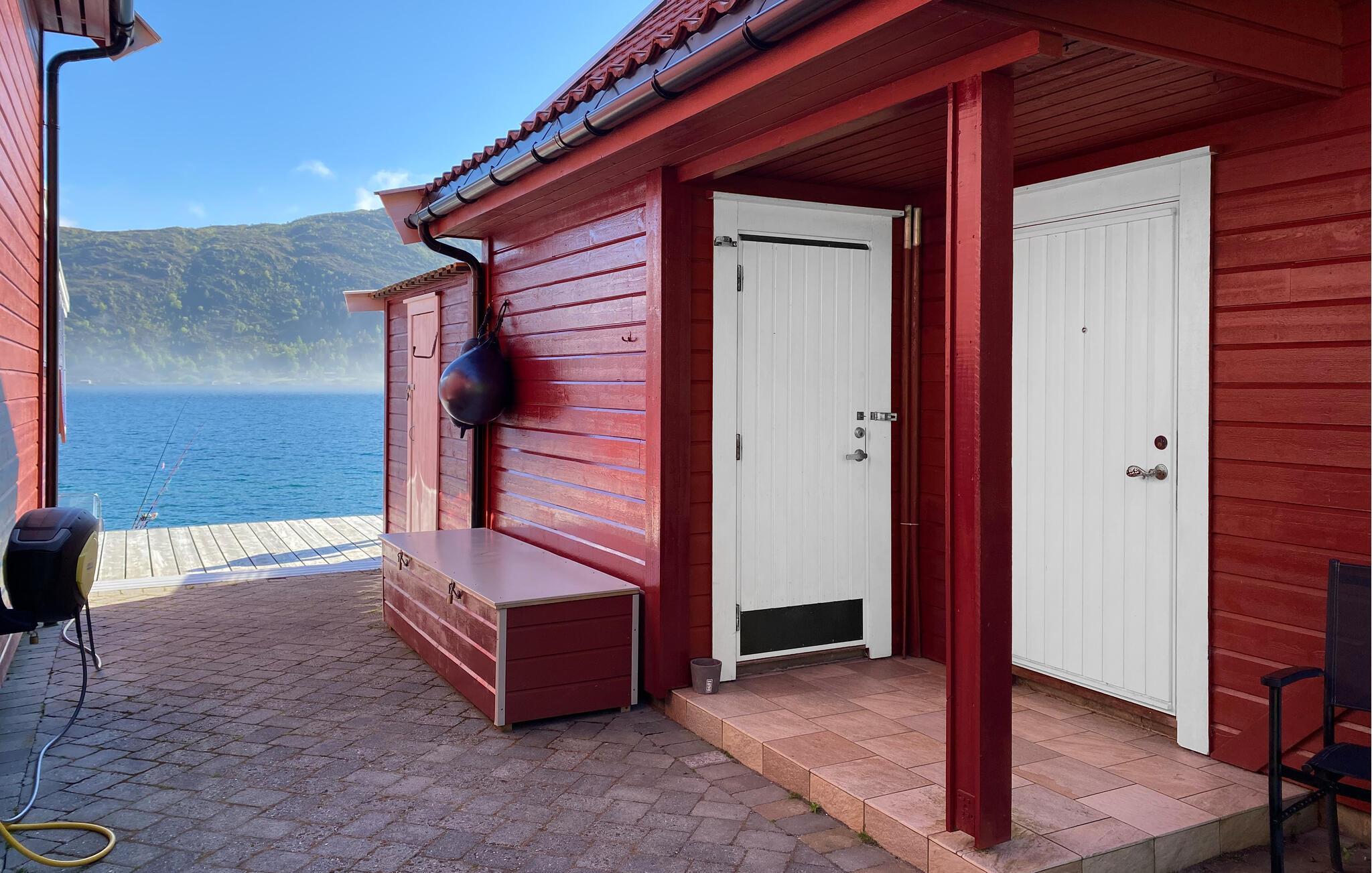 Freuen Sie sich auf einen Urlaub in herrlicher Lage direkt am Fjord. Dieses Ferienhaus bietet ideale Voraussetzungen für Angler, Naturfreunde und alle, die gerne nah am Wasser wohnen. Der freundlich gestaltete Wohnbereich besticht durch eine bequeme Sitzecke, einem großen Fernseher und direktem Zugang zur Terrasse. Genießen Sie den Ausblick auf das Wasser durch die großen Fenster und lassen Sie sich von der hellen, gepflegten Atmosphäre empfangen.
