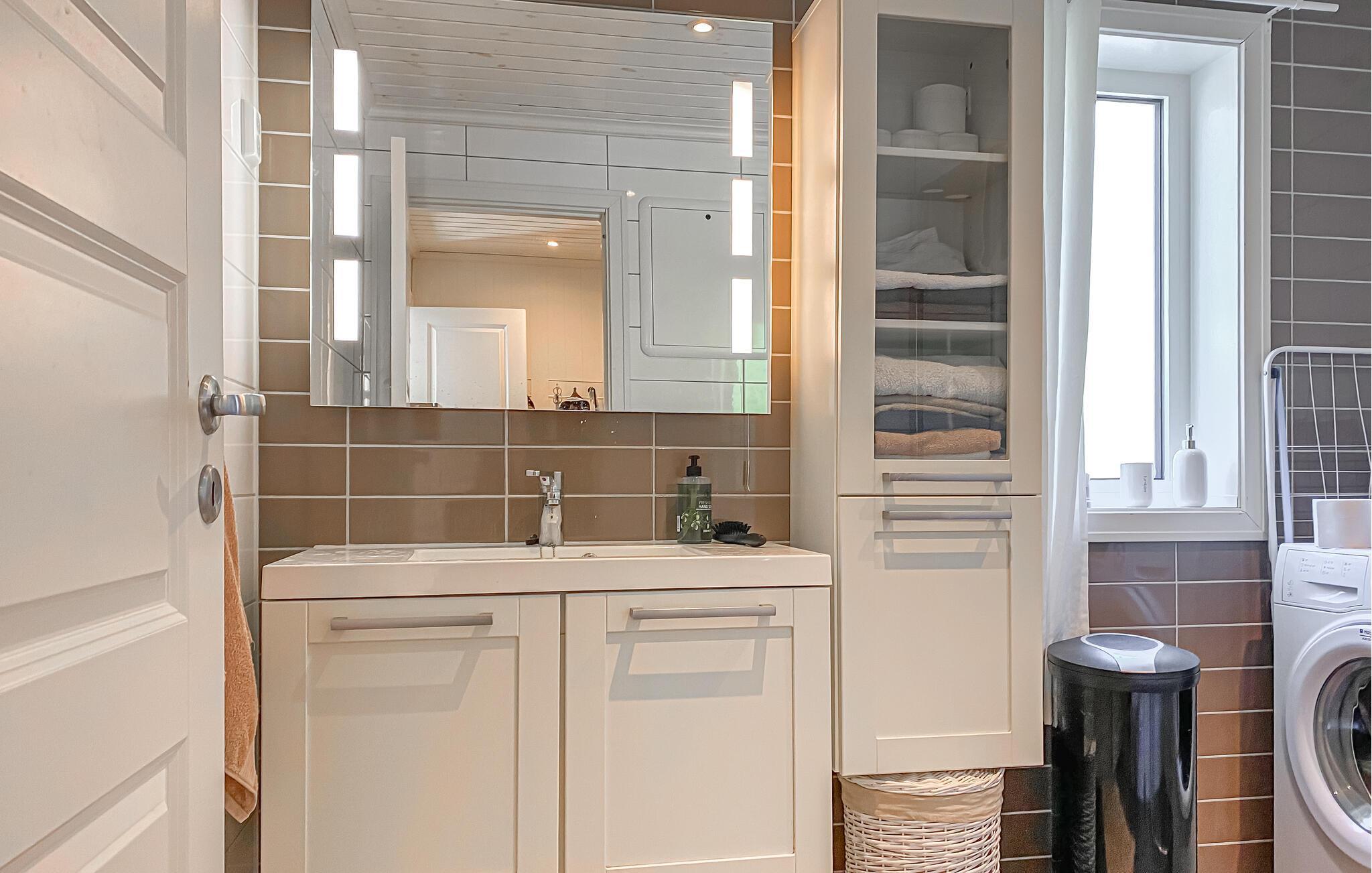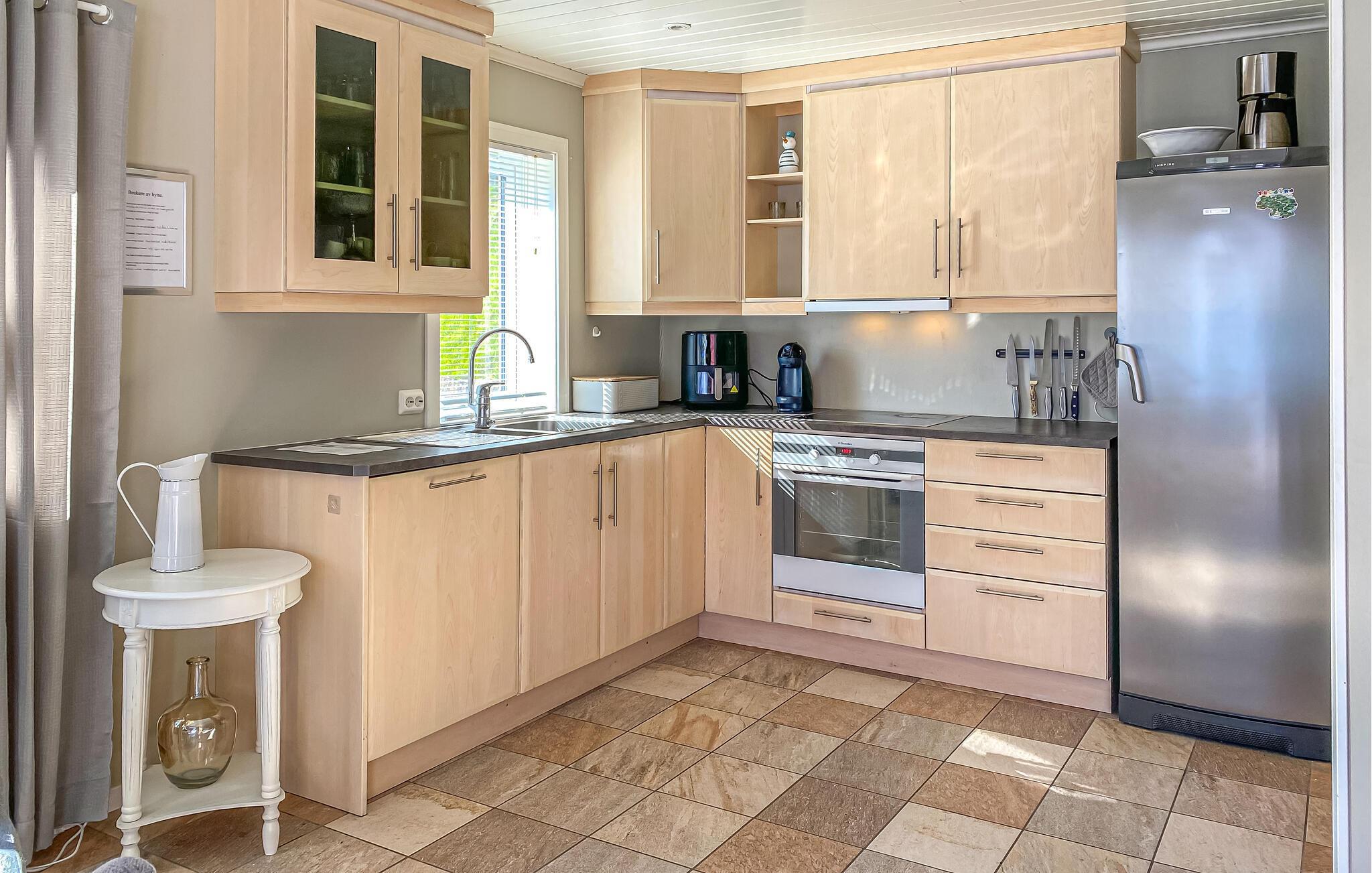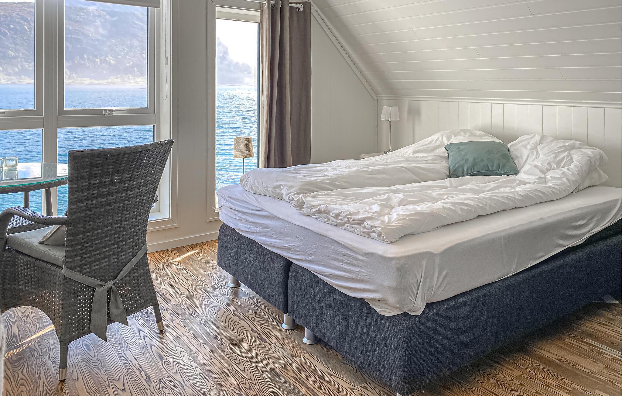 Freuen Sie sich auf einen Urlaub in herrlicher Lage direkt am Fjord. Dieses Ferienhaus bietet ideale Voraussetzungen für Angler, Naturfreunde und alle, die gerne nah am Wasser wohnen. Der freundlich gestaltete Wohnbereich besticht durch eine bequeme Sitzecke, einem großen Fernseher und direktem Zugang zur Terrasse. Genießen Sie den Ausblick auf das Wasser durch die großen Fenster und lassen Sie sich von der hellen, gepflegten Atmosphäre empfangen.