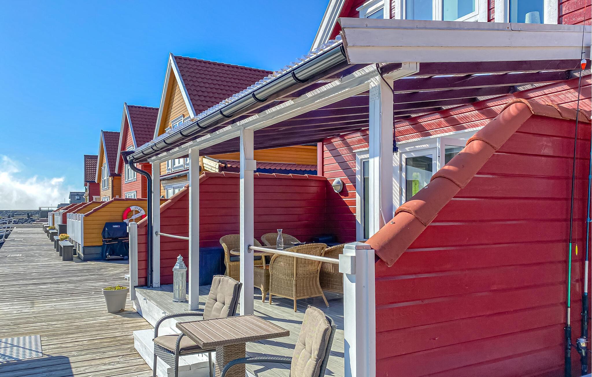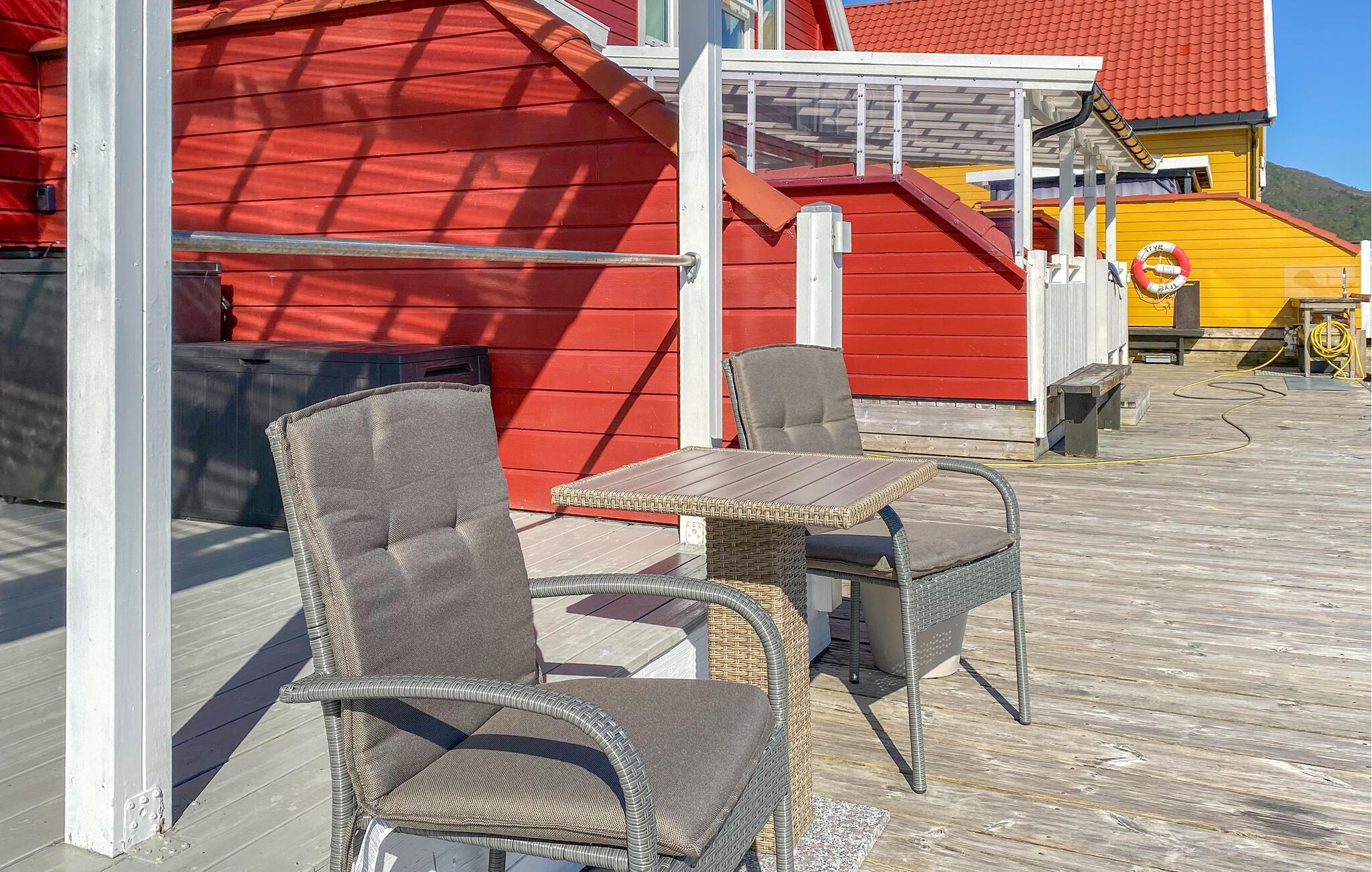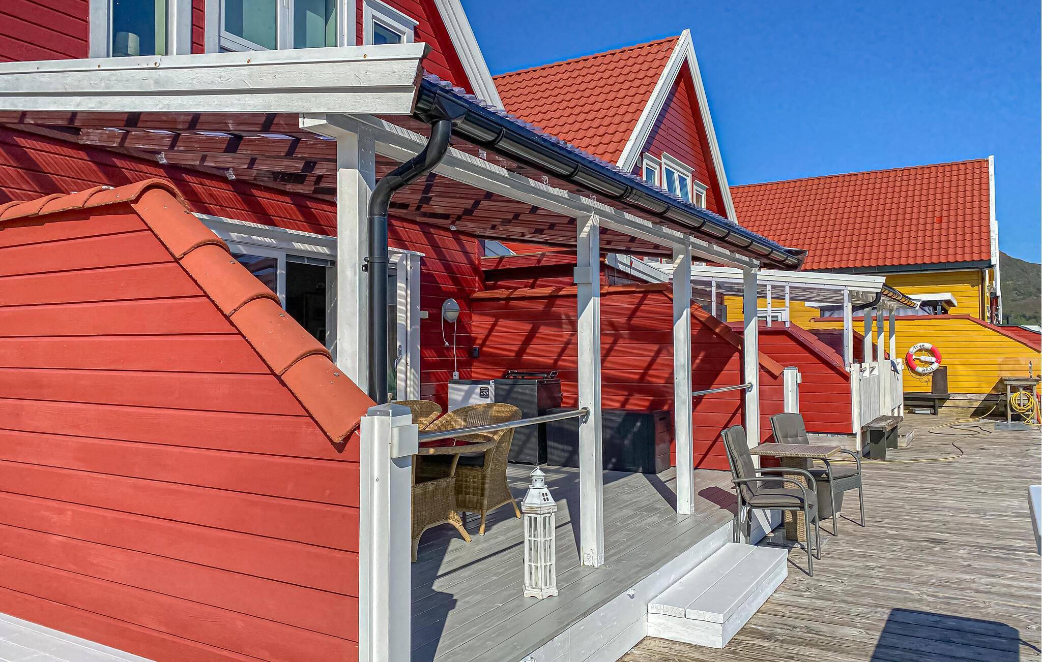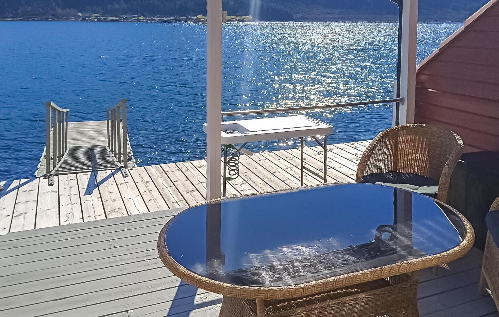Verbringen Sie Zeit auf der überdachten Terrasse mit gemütlicher Sitzgruppe. Frühstücken Sie draußen oder beenden Sie den Tag mit einem Blick über den Fjord. Die große Holzplattform mit Steg führt direkt ans Wasser, ideal zum Angeln, Sonnen oder einfach zum Abschalten.