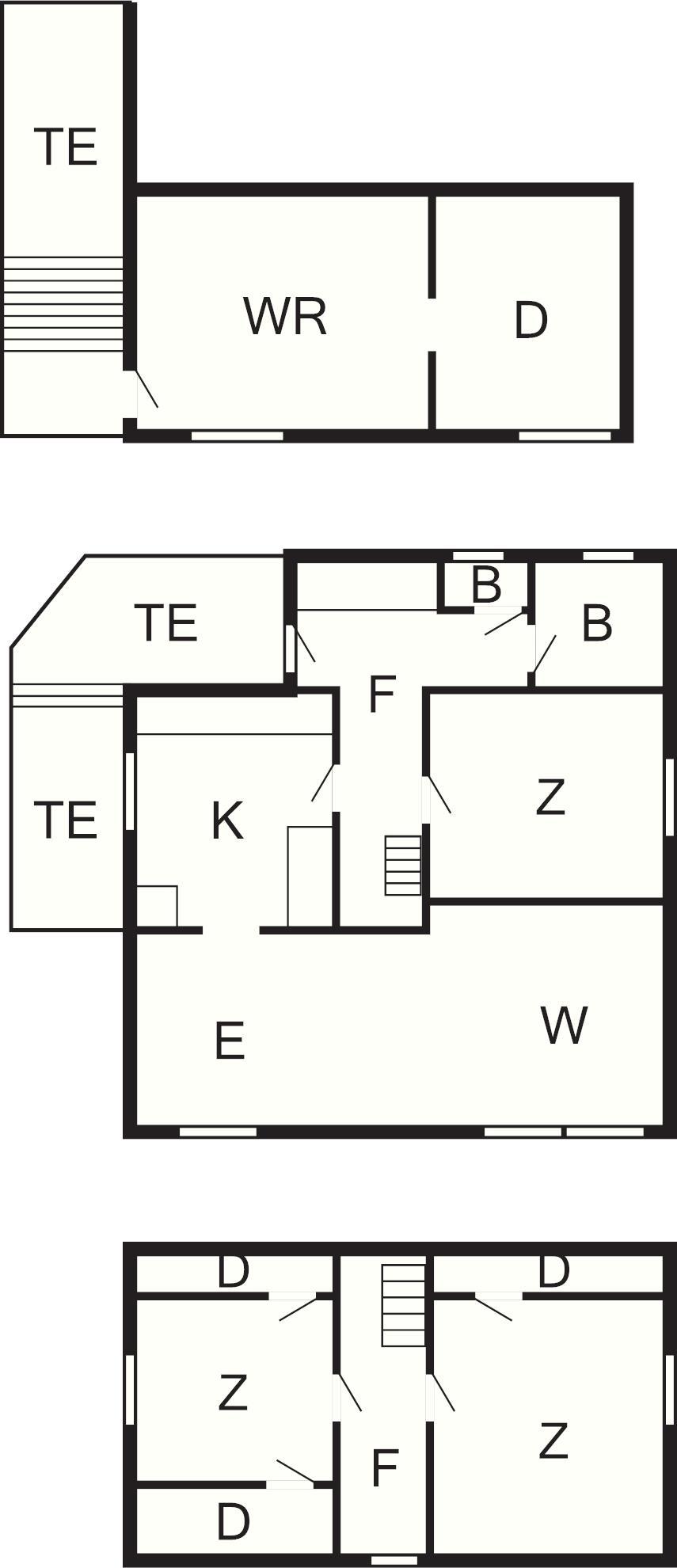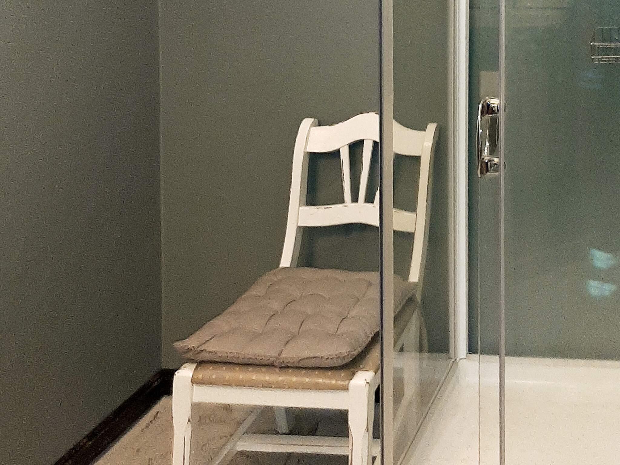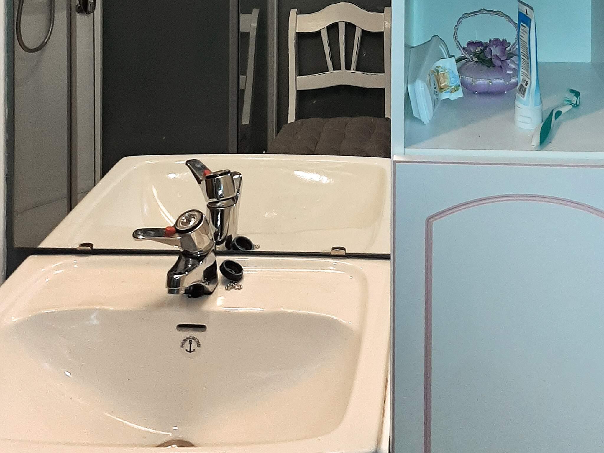 Schmale/steile Treppe mit Handläufen hinauf zu den Schlafzimmern. Teilbares Doppelbett und klappbare Einzelbetten. Badezimmer mit Handwaschbecken und Dusche. Im kleinen Nebenraum gibt es ein WC und Handwaschbecken. Veranda/Terrasse vor der Haustür und der Küche.