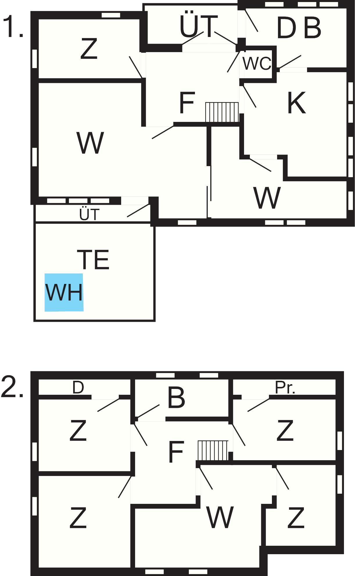 Bad: WC, Waschb., Wanne, Dusche, Dusche, Fußbodenheiz.
