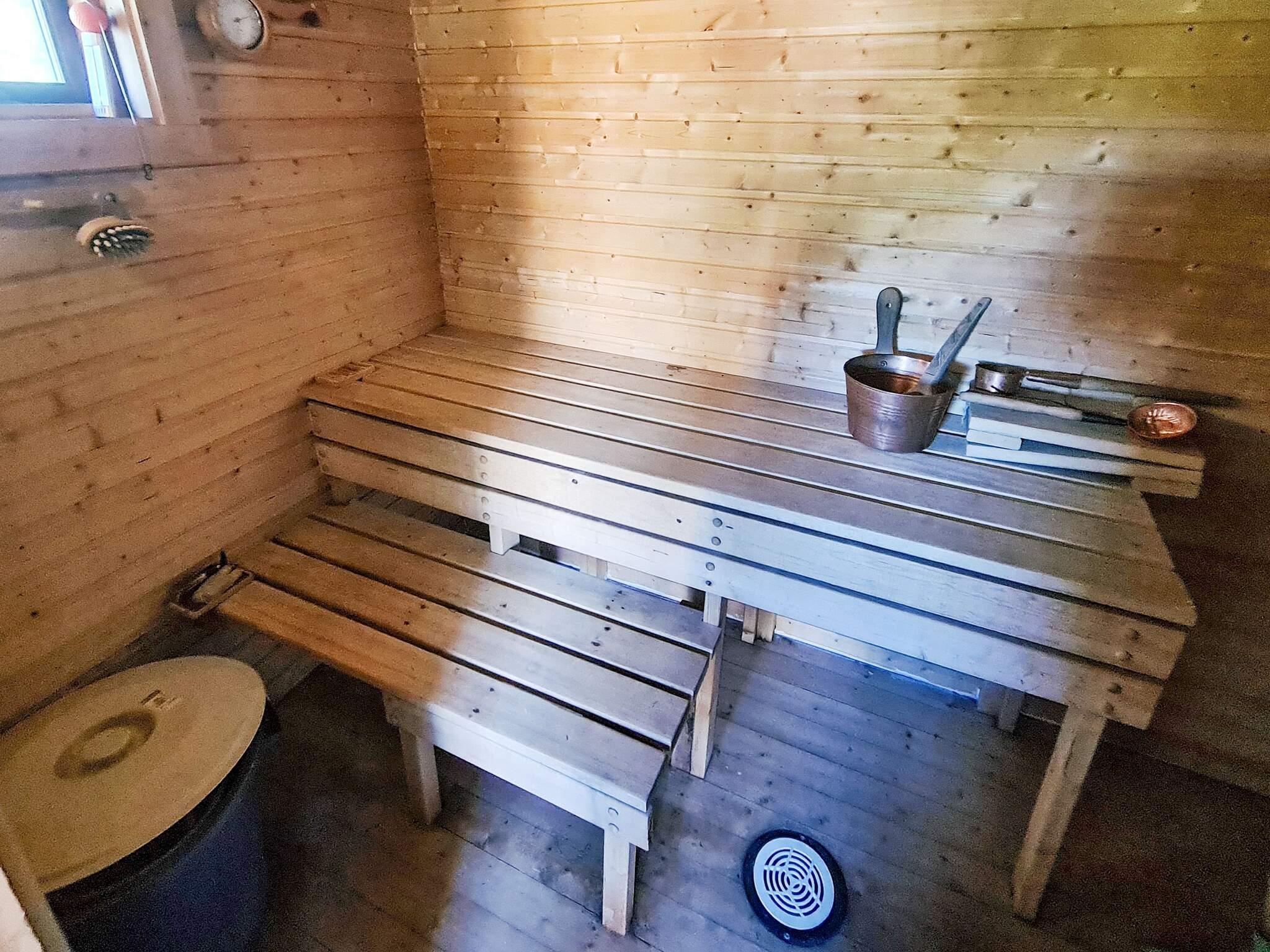 Im winterisolierten Anbau befindet sich auch eine holzbefeuerte Sauna für bis zur fünf Personen sowie ein Ankleide-/Relaxbereich mit Sitzgelegenheiten.