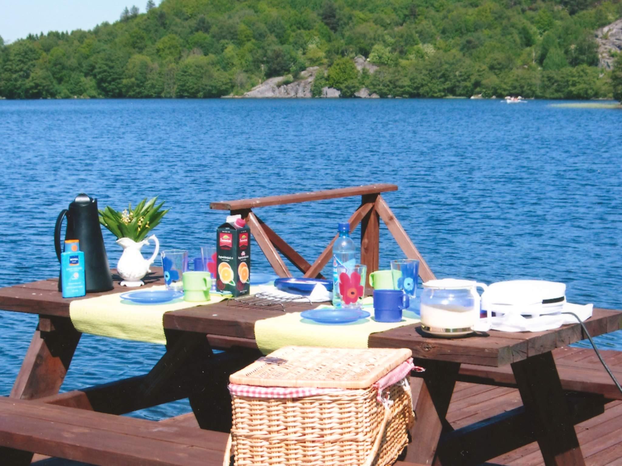 Sonnige Terrasse mit Sitzgelegenheiten. Kinderfreundliches Rasengrundstück mit Bademöglichkeit gleich unterhalb am Seeufer, nur etwa 50 m vom Ferienhaus, wo es einen Steg und eine gemeinschaftliche Sauna gibt (teilen Sie sich mit Haus 29031, das unweit steht).