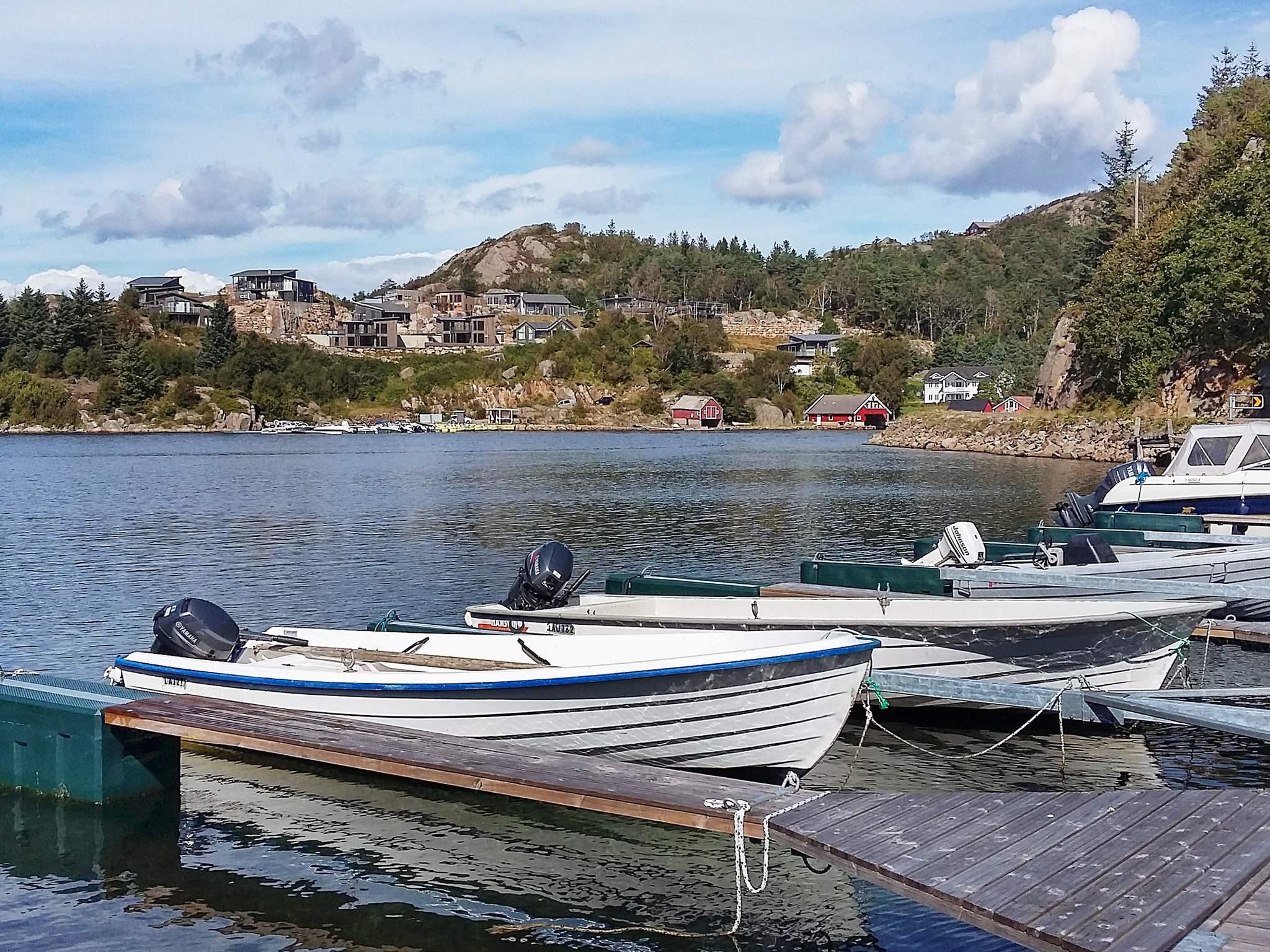 Unten am Fjord, etwa 400 m vom Haus, gibt es einen Anlegesteg mit Platz für die drei mietbaren Boote. Parkplatz in der Nähe des Bootsanlegers. Gratis Nutzung eines 15 Fuß Ruderbootes, das am Steg im See liegt.