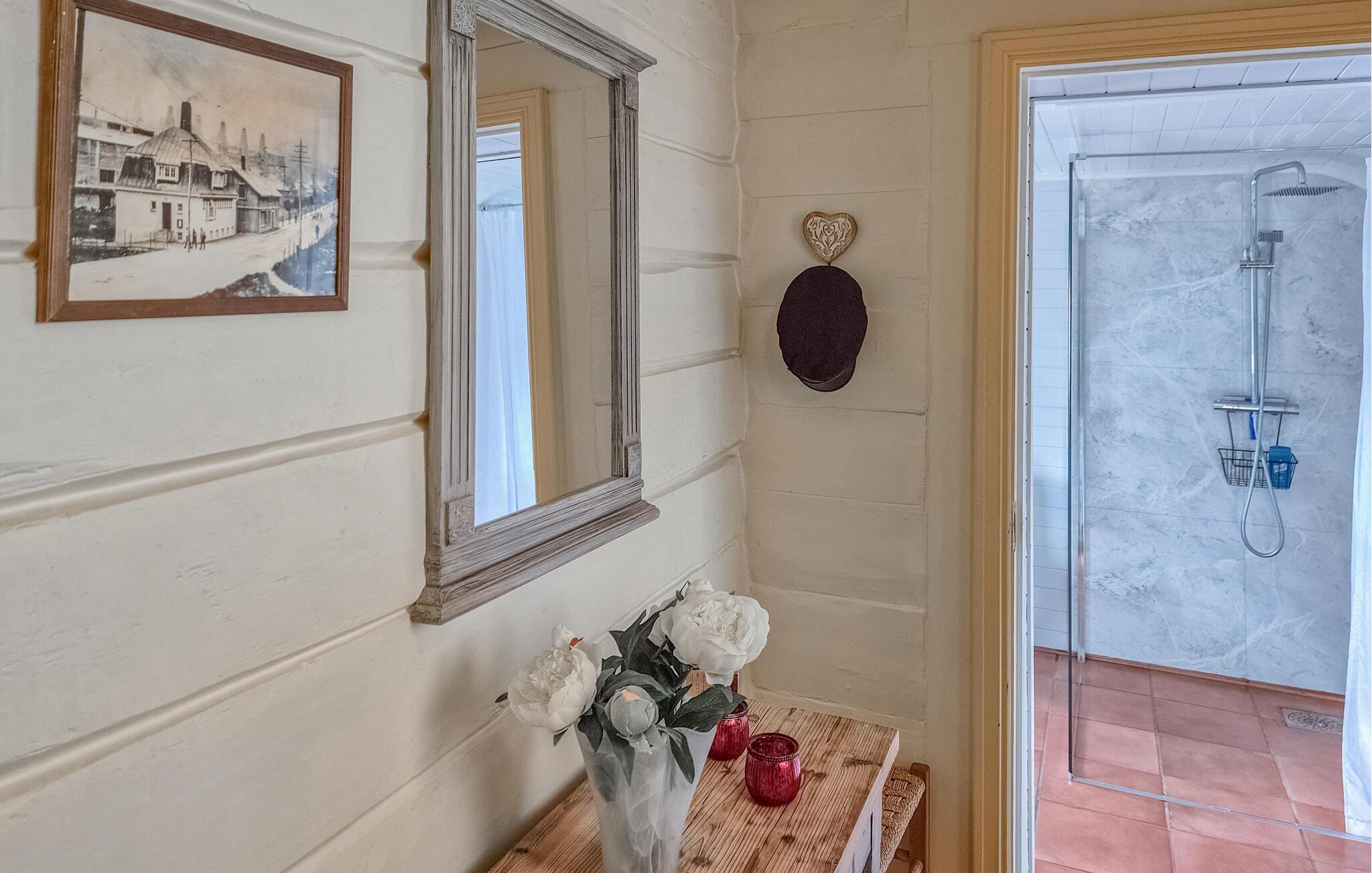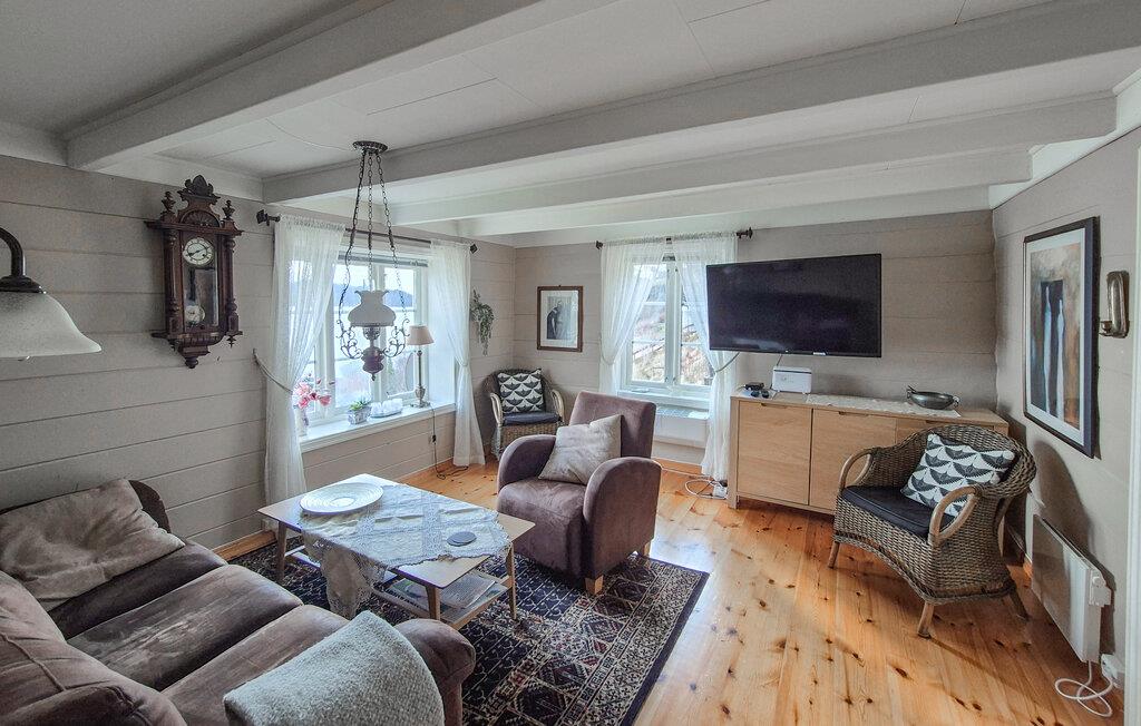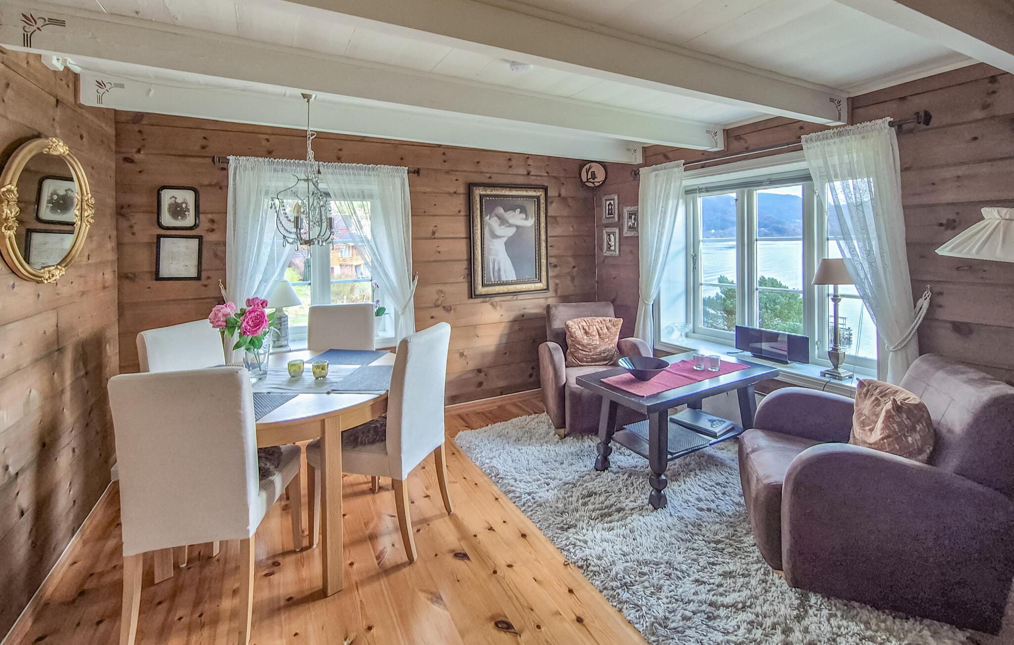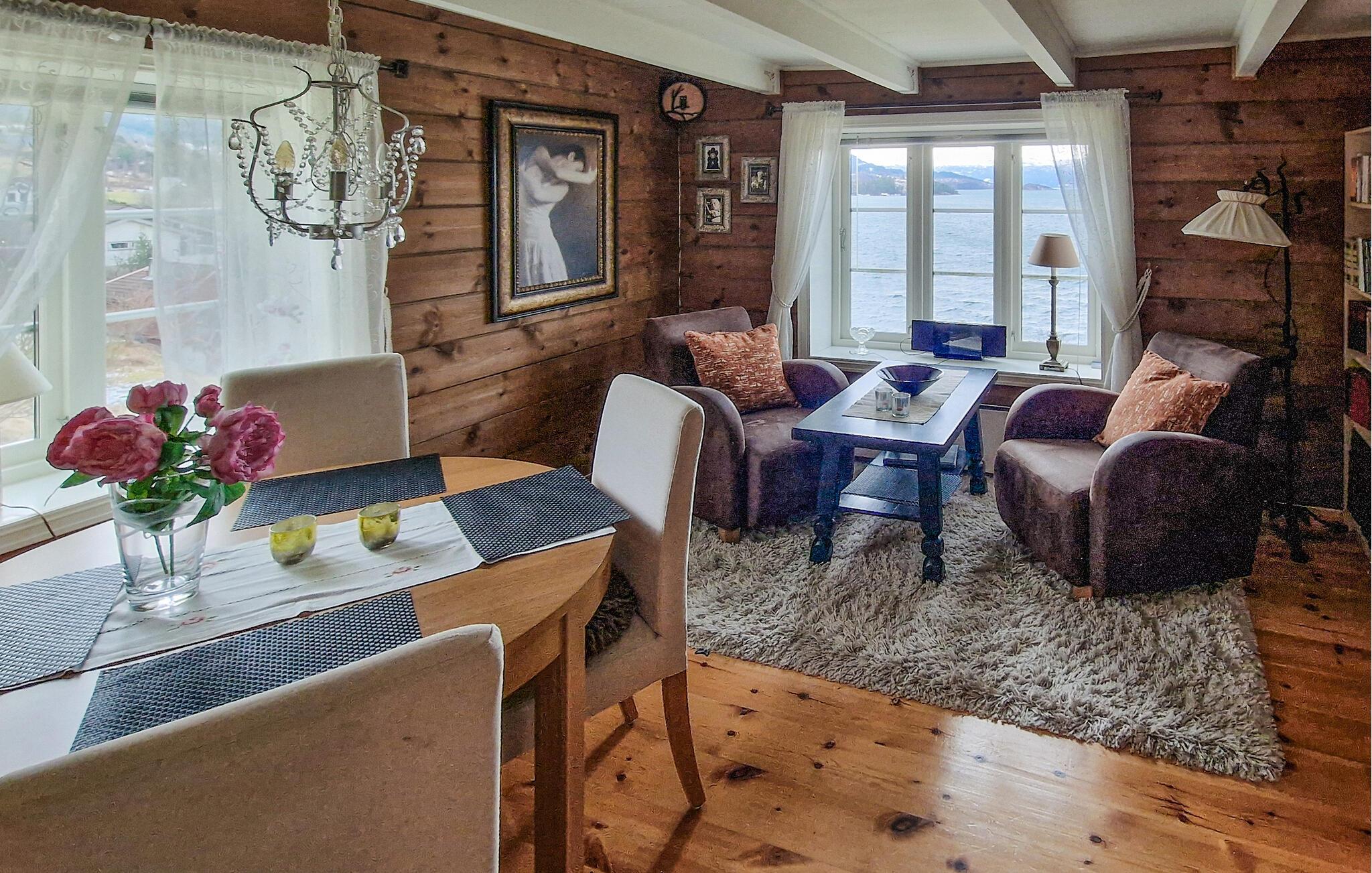 Genießen Sie erholsame Tage in Ihrem modernisierten, aber dennoch authentischen Ferienhaus mit Blick auf den Høylandssundet. Lassen Sie sich von der idyllischen Umgebung verzaubern und genießen Sie die Ruhe und Natur direkt am Fjord. Betreten Sie das gemütliche Wohnzimmer mit seinen warmen Holzwänden und der liebevoll ausgewählten Einrichtung. Machen Sie es sich in der behaglichen Sitzecke bequem oder genießen Sie entspannte Abende bei einem leckeren Dinner vor dem Kamin. Die angrenzende Küche bietet die Möglichkeit, gemeinsam zu kochen.