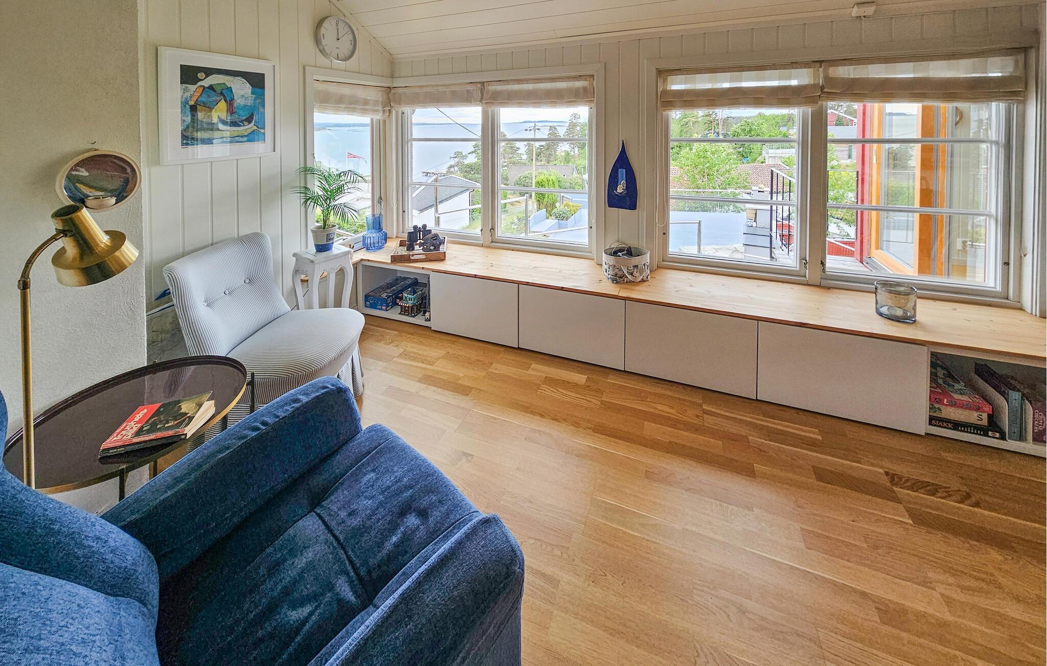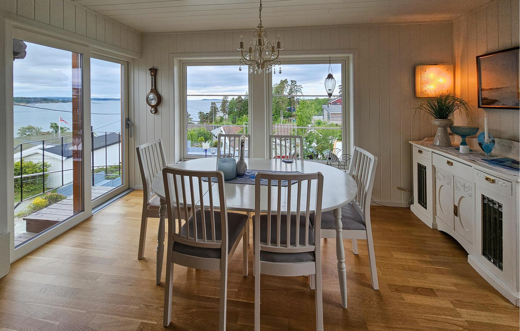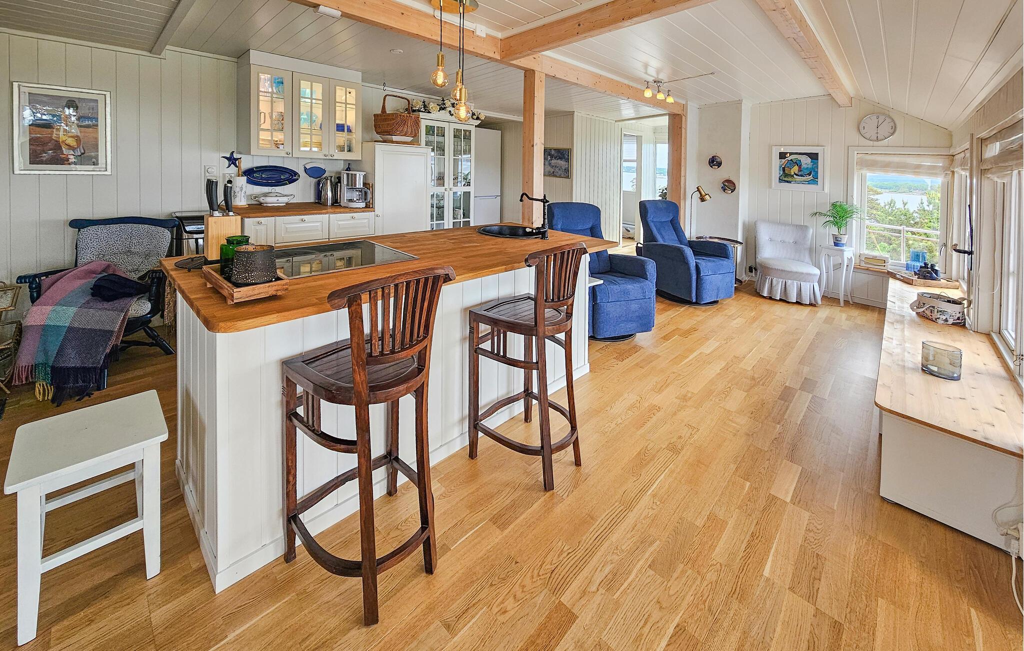 Erleben Sie dieses charmante Ferienhaus, das Ihnen Erholung, Komfort und eine traumhafte Aussicht bietet. Das Haus liegt in einem klassischen Sommerort direkt am Oslofjord, bekannt für seine Strände, Felsen und Freizeitmöglichkeiten. Machen Sie es sich in dem hellen, liebevoll gestalteten Innenraum gemütlich. Der offene Wohnbereich mit Sofa, Sessel, Fernseher und Bücherregal lädt zum Entspannen ein. Genießen Sie die lichtdurchflutete Atmosphäre, die großen Fensterfronten bieten Ihnen auch im Inneren stets den Blick auf das Wasser. Kochen Sie in der schönen, offenen Küche mit Kücheninsel, Barhockern und direktem Zugang zum Essbereich mit Meerblick.