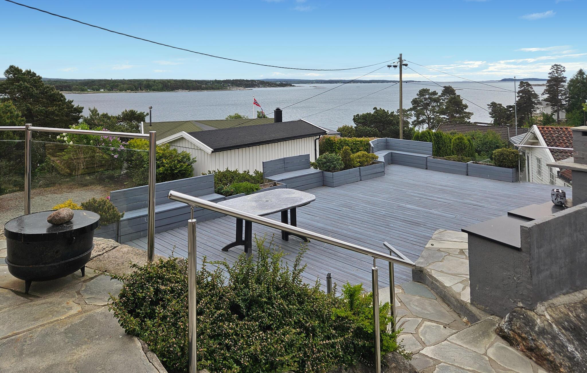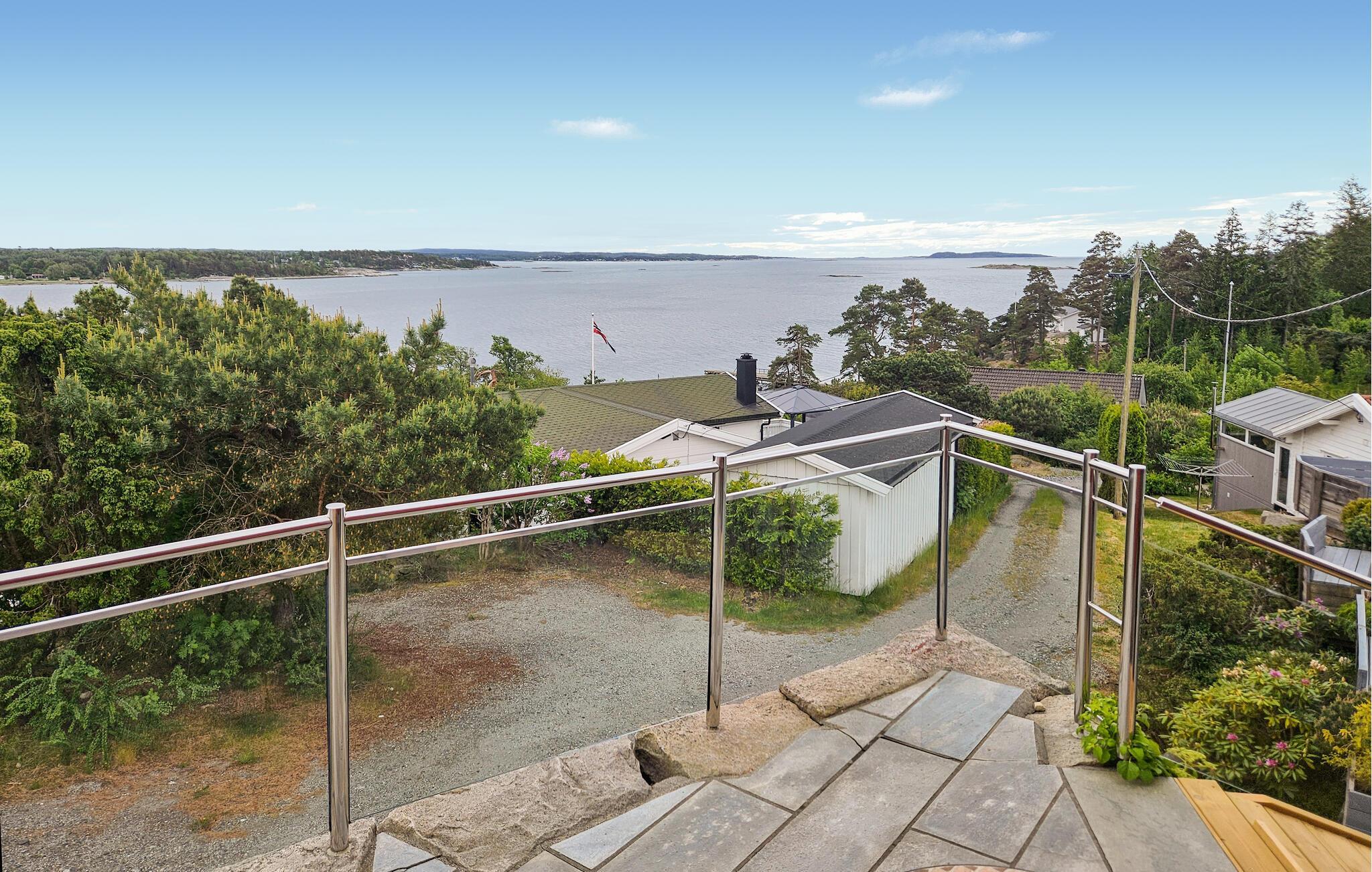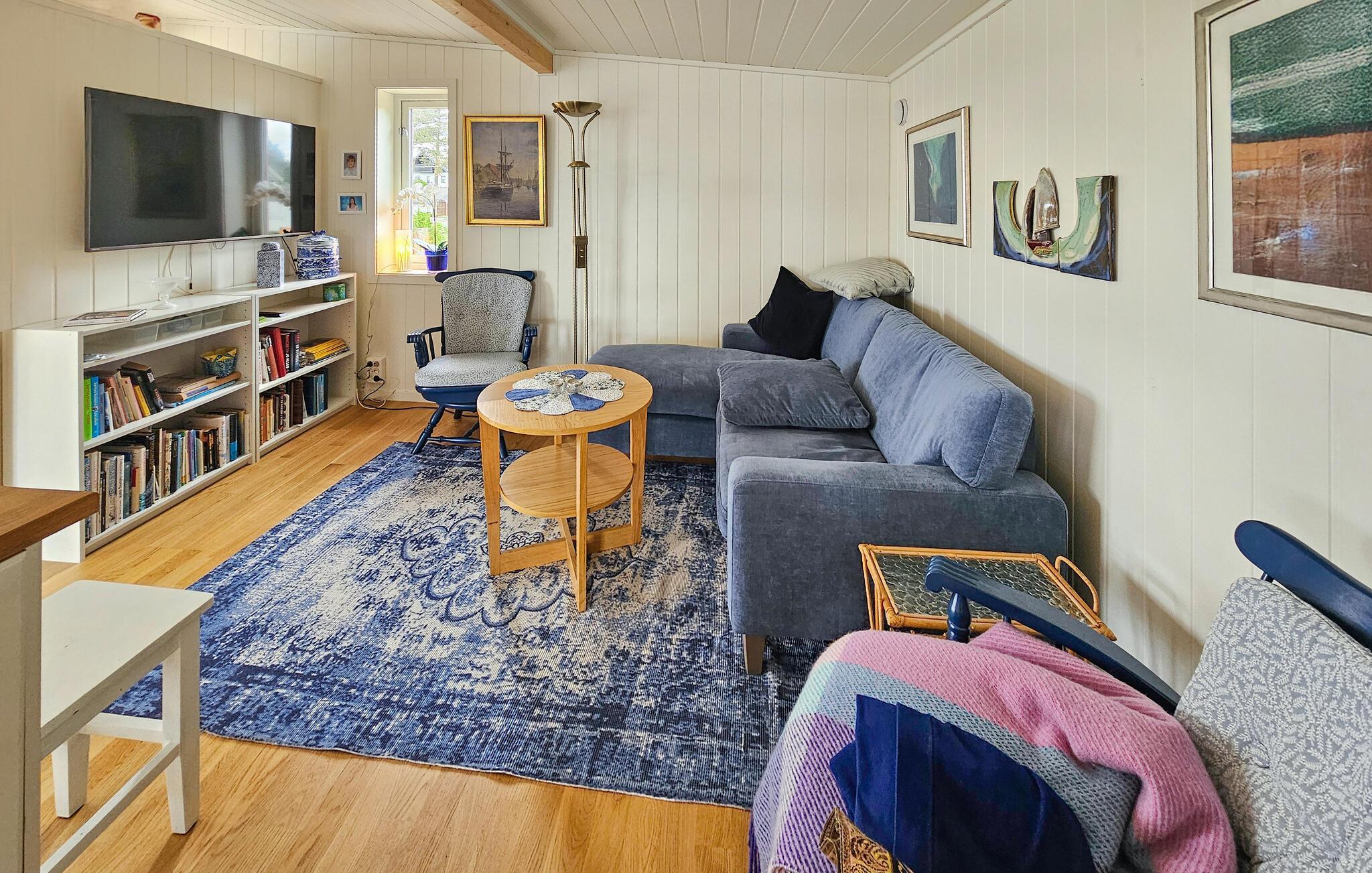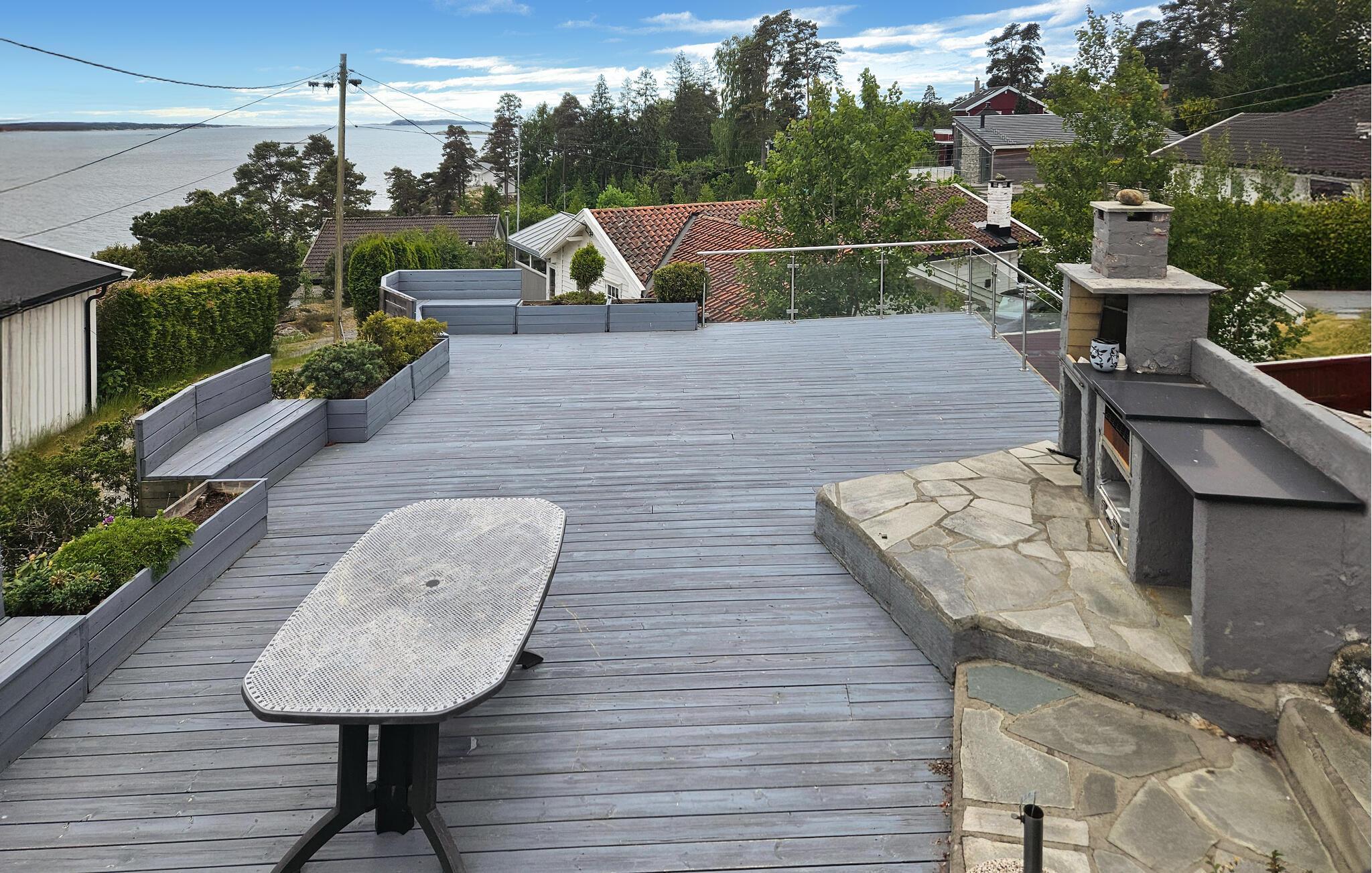 Erleben Sie dieses charmante Ferienhaus, das Ihnen Erholung, Komfort und eine traumhafte Aussicht bietet. Das Haus liegt in einem klassischen Sommerort direkt am Oslofjord, bekannt für seine Strände, Felsen und Freizeitmöglichkeiten. Machen Sie es sich in dem hellen, liebevoll gestalteten Innenraum gemütlich. Der offene Wohnbereich mit Sofa, Sessel, Fernseher und Bücherregal lädt zum Entspannen ein. Genießen Sie die lichtdurchflutete Atmosphäre, die großen Fensterfronten bieten Ihnen auch im Inneren stets den Blick auf das Wasser. Kochen Sie in der schönen, offenen Küche mit Kücheninsel, Barhockern und direktem Zugang zum Essbereich mit Meerblick.