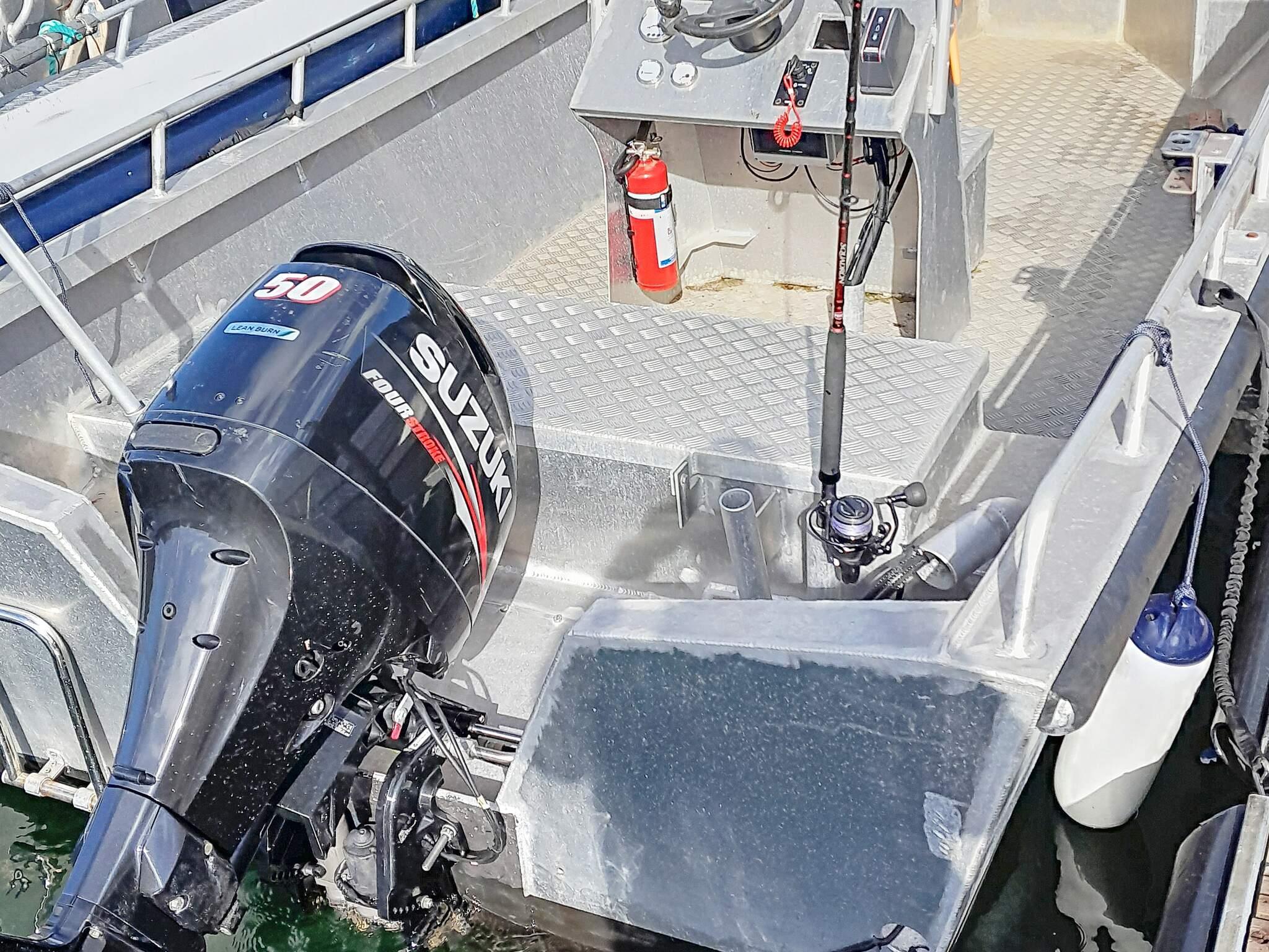 *ein 21 Fuß Boot Typ Quicksilver 640 mit Kabine, selbstlenzendem Deck, 100 PS Mercury Außenborder, Echolot, Kartenplotter, GPS und 10 Rutenhaltern. Eberspächer Dieselheizung in der Kabine.