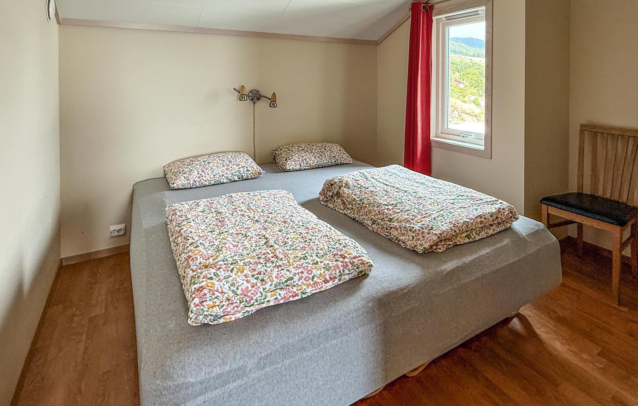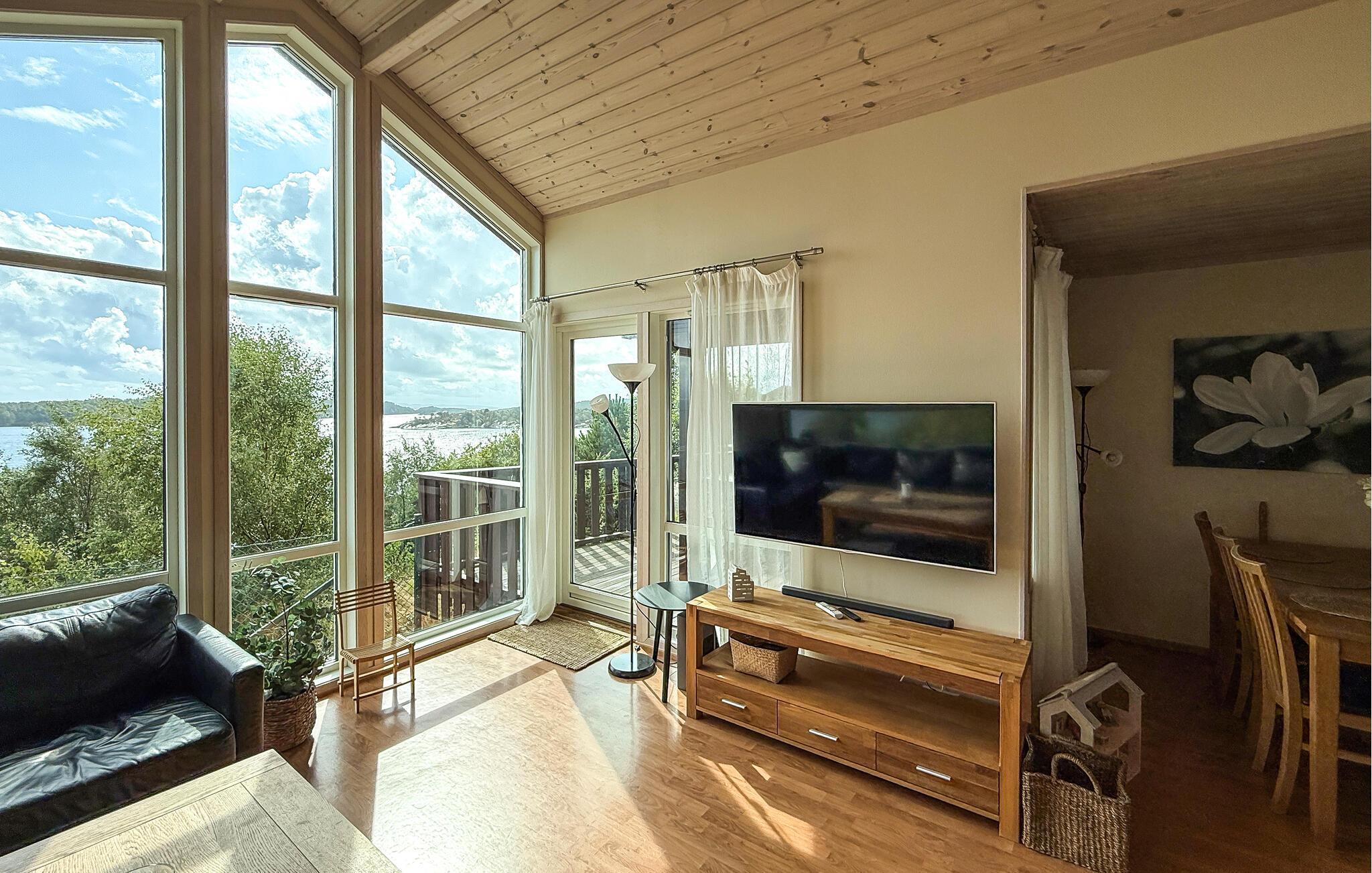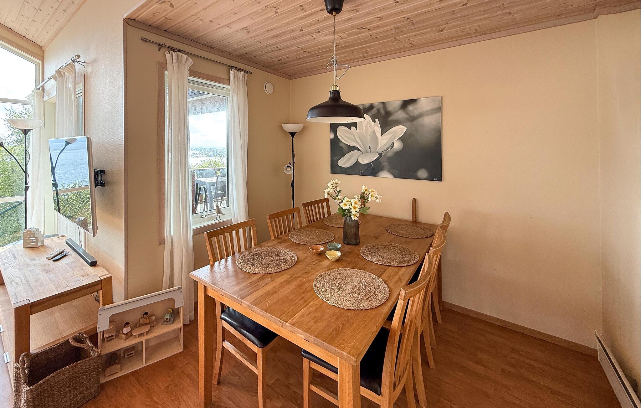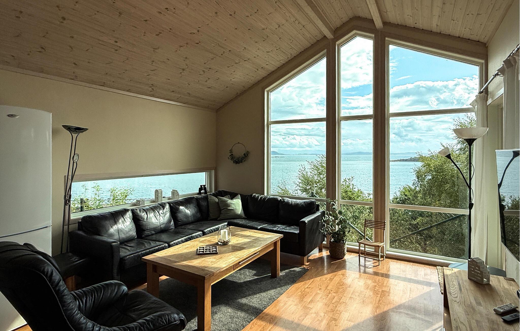 Dieses idyllisch am Fjord gelegene Haus ist der ideale Rückzugsort für eine erholsame Auszeit vom Alltag. Genießen Sie jederzeit die Aussicht durch die großen Panoramafenster, während Sie gemeinsame Stunden auf dem bequemen Sofa verbringen. An kühlen Tagen entzünden Sie den Kaminofen oder entspannen sich bei wohliger Wärme in der Sauna.