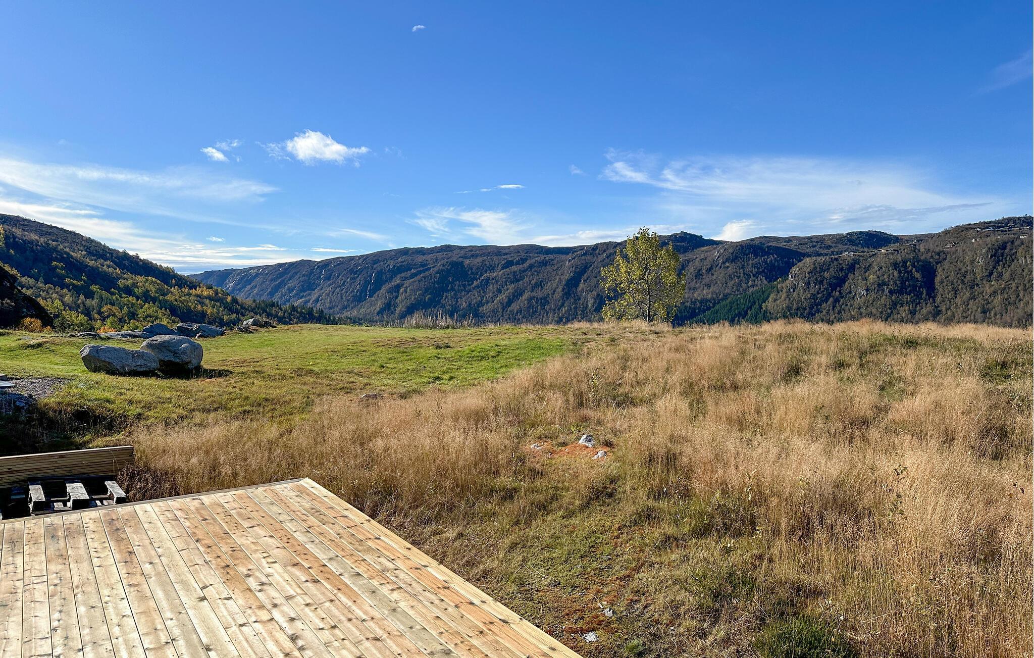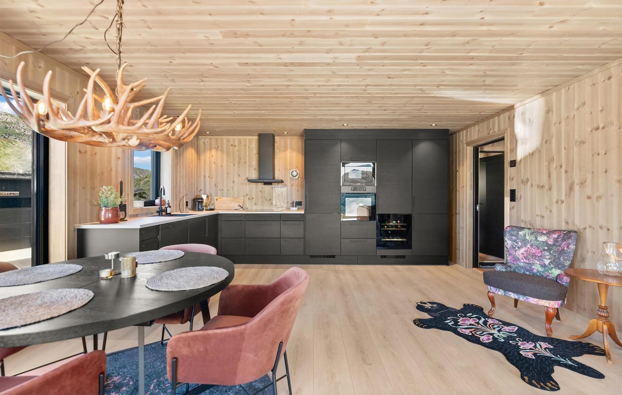 In diesem modernen Ferienhaus in Ljosland erwartet Sie ein erholsamer Urlaub mit herrlichem Blick auf die umliegenden Berge und den See. Die lichtdurchfluteten Räume bieten eine warme und einladende Atmosphäre, in der Sie sich sofort wohlfühlen. Die moderne Einrichtung kombiniert Komfort und Stil, sodass Sie inmitten der Natur entspannte Tage mit der ganzen Familie verbringen können.Das Haus liegt auf der Sonnenseite, sodass Sie vom gemütlichen Wohnzimmer oder der Terrasse aus die wunderschöne Aussicht genießen können.