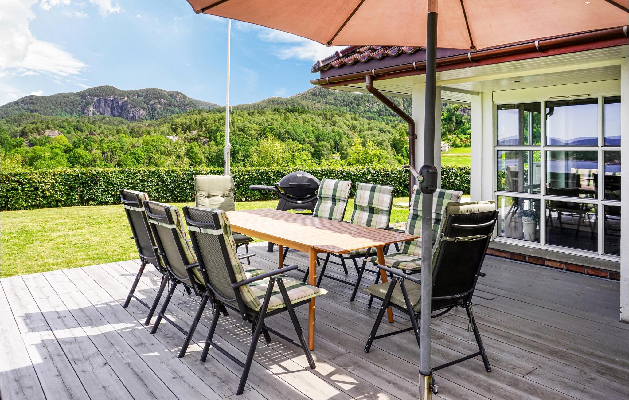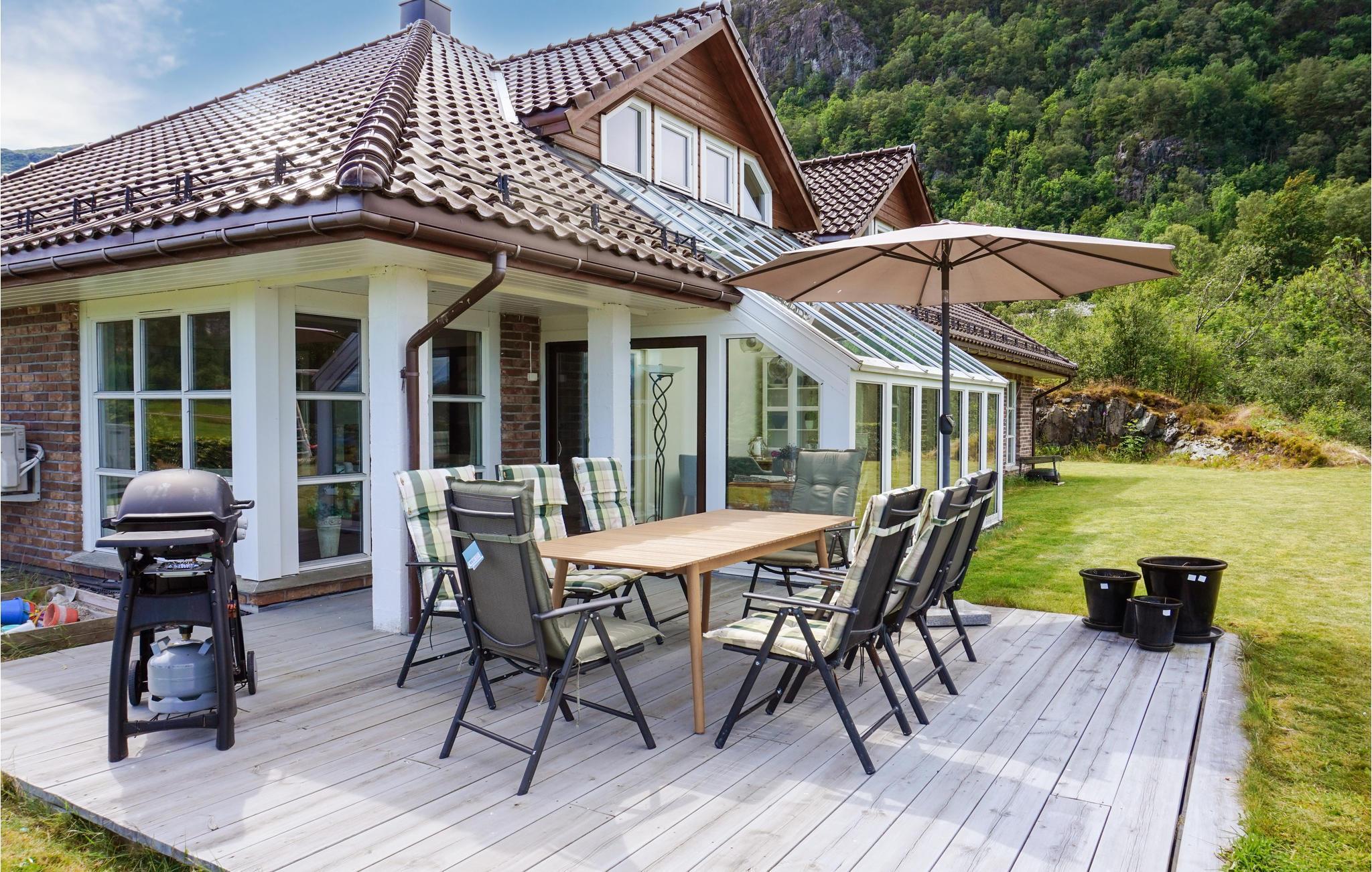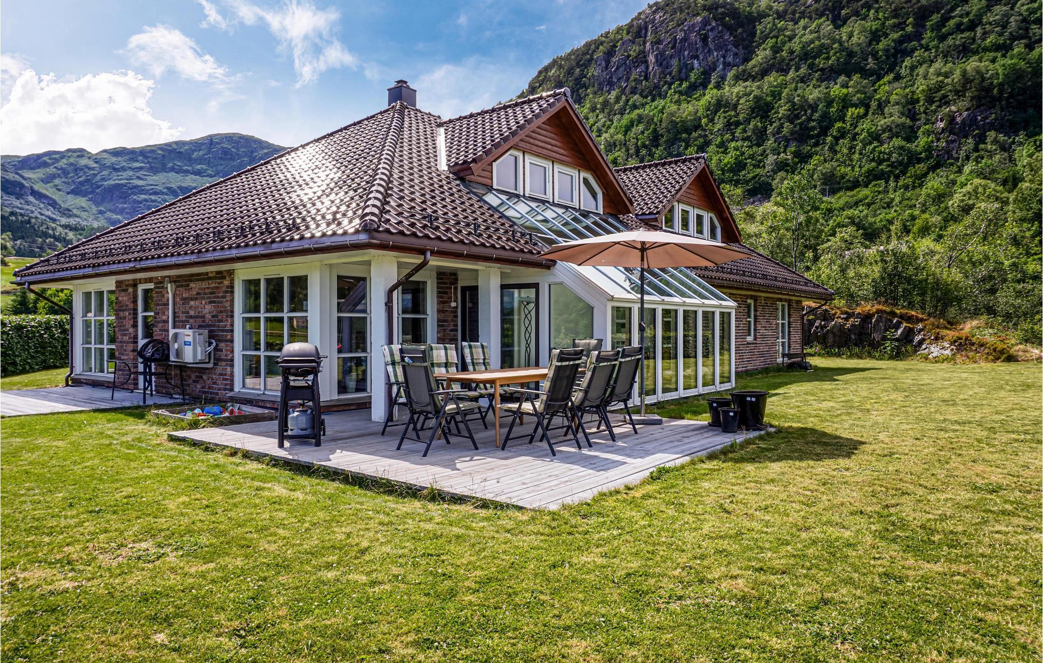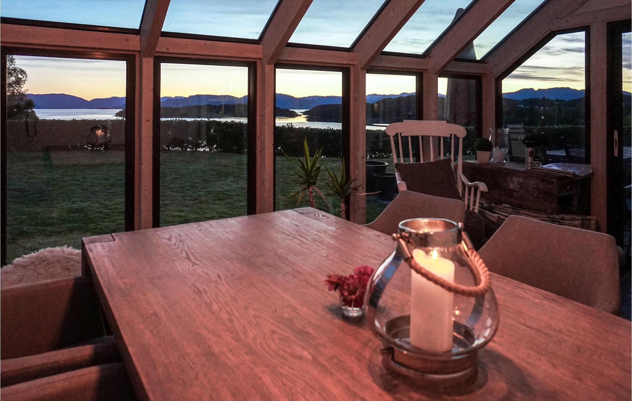 Auf diesem einzigartigen Grund können Sie Ihren Urlaub in aller Ruhe genießen, umgeben von herrlicher Natur mit Inseln, Bergen und Fjord und die Terrasse bietet einen märchenhaften Panoramablick. Im luxuriösen Ferienhaus gibt es auch noch ein Heimkino zur DVD-Vorführung. Sonst ist das Haus prima ausgestattet mit u.a. Herd mit Induktionskochfeldern nebst Einrichtungen zum Frittieren und Grillen, Wasserkocher, Whirlpool und eigenem Kühlraum. Es gibt einen Schuppen, ein eigenes Boot und Fischausnehmeplatz draußen. Das Grundstück liegt auf einem tierreichen Agrargebiet bei der Siedlung Humlevik nah am Ort Lundegrend auf der Insel Tysnes, welche mit der Region Hardanger durch eine Brücke verbunden ist. Våge, ein gemütliches Küstendorf ist das Handelszentrum der Insel und liegt ca. 8 km vom Ferienhaus entfernt. Es spielen seit langem Fisch, Schalentiere und Meeresfrüchte eine wichtige Rolle in der Tysneser Küche. Dank der zentralen Lage ist Tysnes ein prima Ausgangspunkt für Rundfahrten in Westnorwegen; Brückenverbindung nach Hardanger, Schnellboot nach Bergen und Rosendal. Auf Tysnes gibt es einen phantastischen Aussichtspunkt namens 'Tysnes såte', ca. 750 m.ü.NN, von welchem aus man quer über den Hardangerfjord zur Gemeinde Kvinnherad blicken sowie der Nordsee und des auf diesen Gewässern aktiven Schiffverkehres ansichtig werden kann. Die Gemeinde Kvinnherad ist ein beliebtes Wandergebiet mit bekannten Wanderzielen wie dem Gletscher Bondhusbreen und dem Nationalpark Folgefonna. Dies erstklassige Ferienhaus mit seiner toller Lage im Reich der Fjorde ist perfekt für einen aktiven Urlaub mit Angeln, Wandern, Gletscherwanderungen u.v.m. Lassen Sie sich hinreißen und buchen Sie dieses Haus für Ihren nächsten Norwegen-Urlaub.