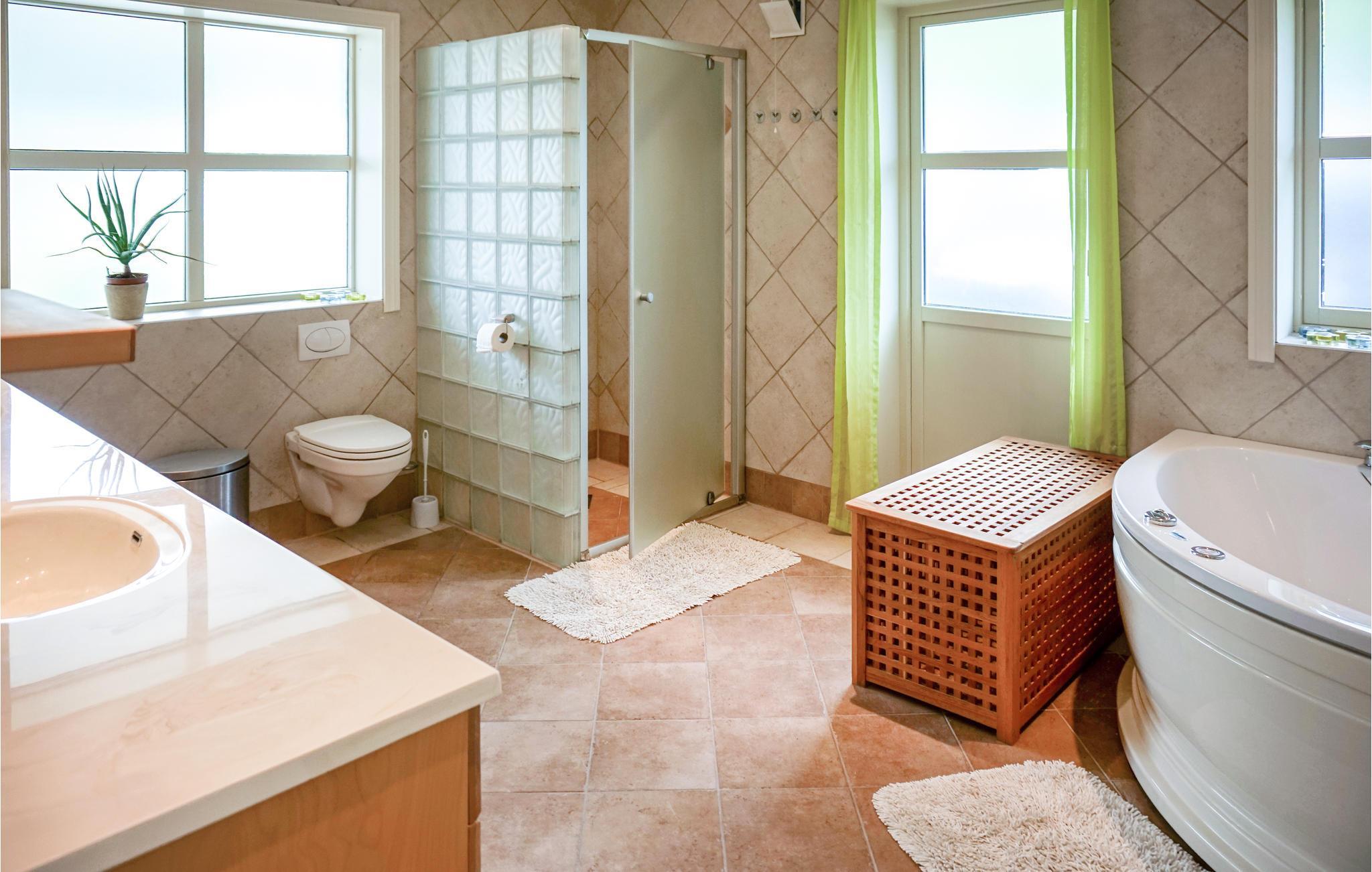 Badezimmer (nr. 1) - WC. Warmes und kaltes Wasser. Dusche und Badewanne