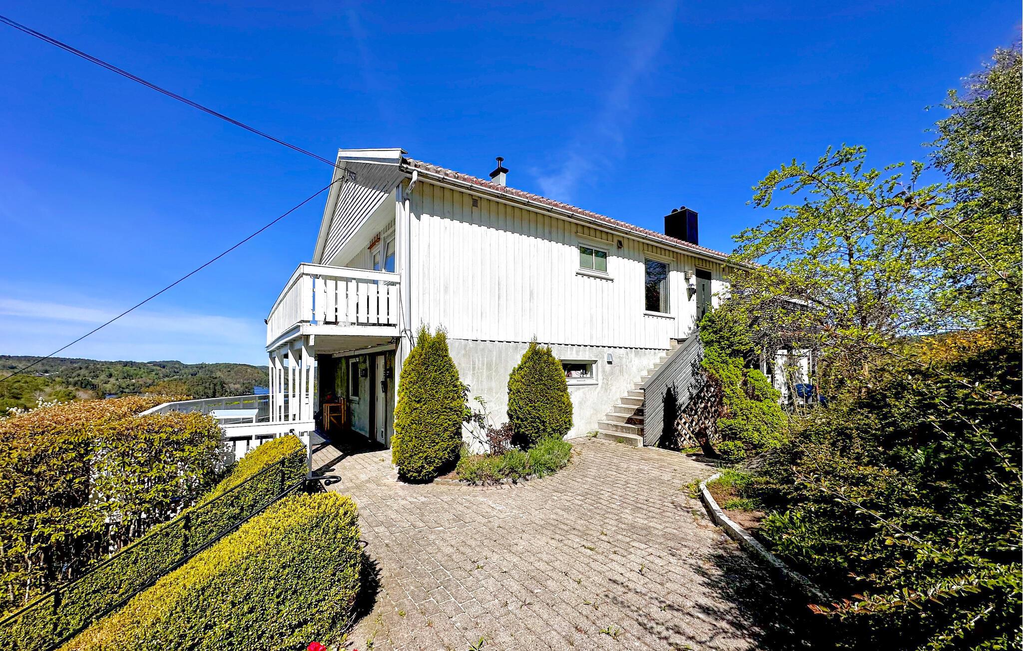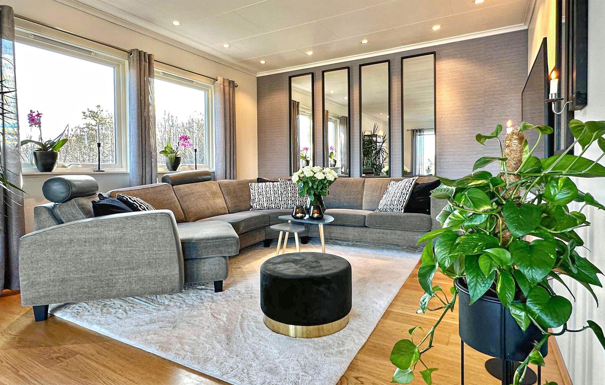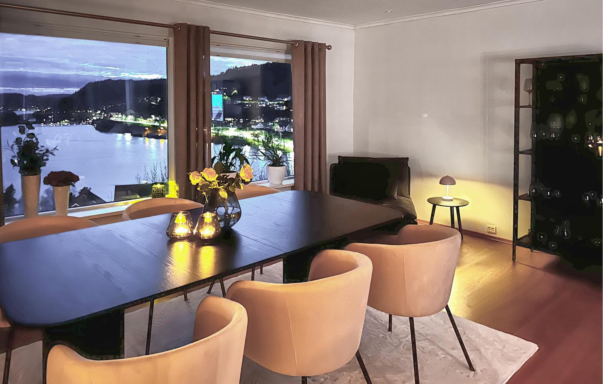 Verbringen Sie erholsame Urlaubstage in diesem stilvoll eingerichteten Ferienhaus, das mit seiner großzügigen Ausstattung und der herrlichen Aussicht zum Verweilen einlädt. Das Haus bietet einen idealen Ausgangspunkt für Erholung und Ausflüge entlang der Südküste Norwegens. Machen Sie es sich im lichtdurchfluteten Wohnzimmer auf dem großen Sofa gemütlich oder genießen Sie die geselligen Mahlzeiten im geschmackvollen Essbereich. Der moderne Einrichtungsstil mit großen Fenstern und edlen Details sorgt für eine warme und zugleich elegante Atmosphäre. Am Abend können Sie den Blick über das Wasser schweifen lassen, während sanftes Licht den Raum erfüllt.