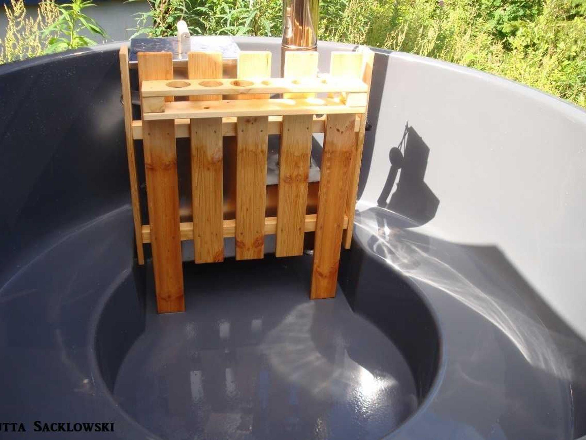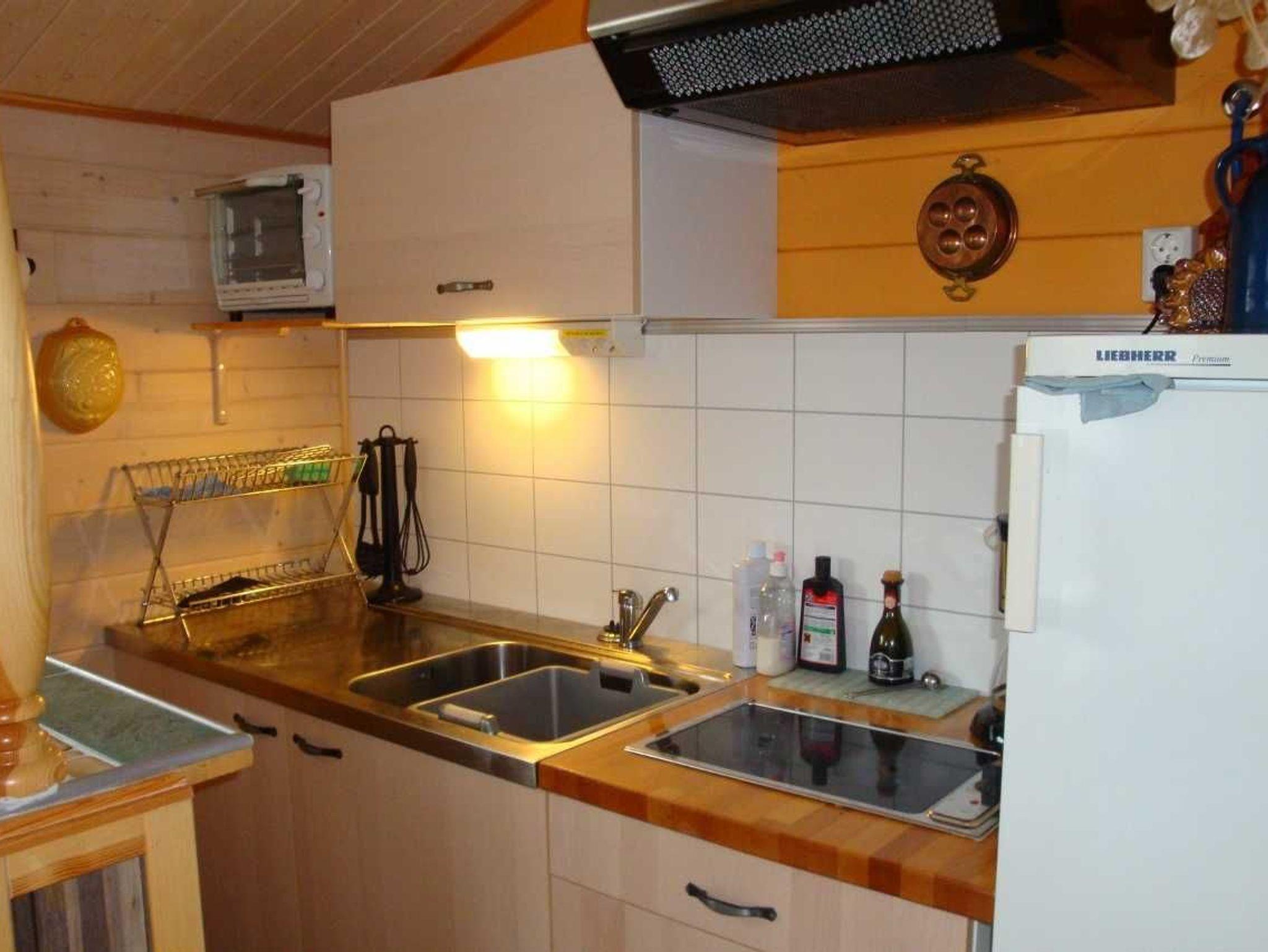 Kleine Hütte (30 Kvm) ,2 Zimmer -ein Wohnraum mit Küchenecke von 16 Kvm ,ein Schlafzimmer von 12 Kvm und ein kleines Bad mit Dusche, Waschbecken und WC.