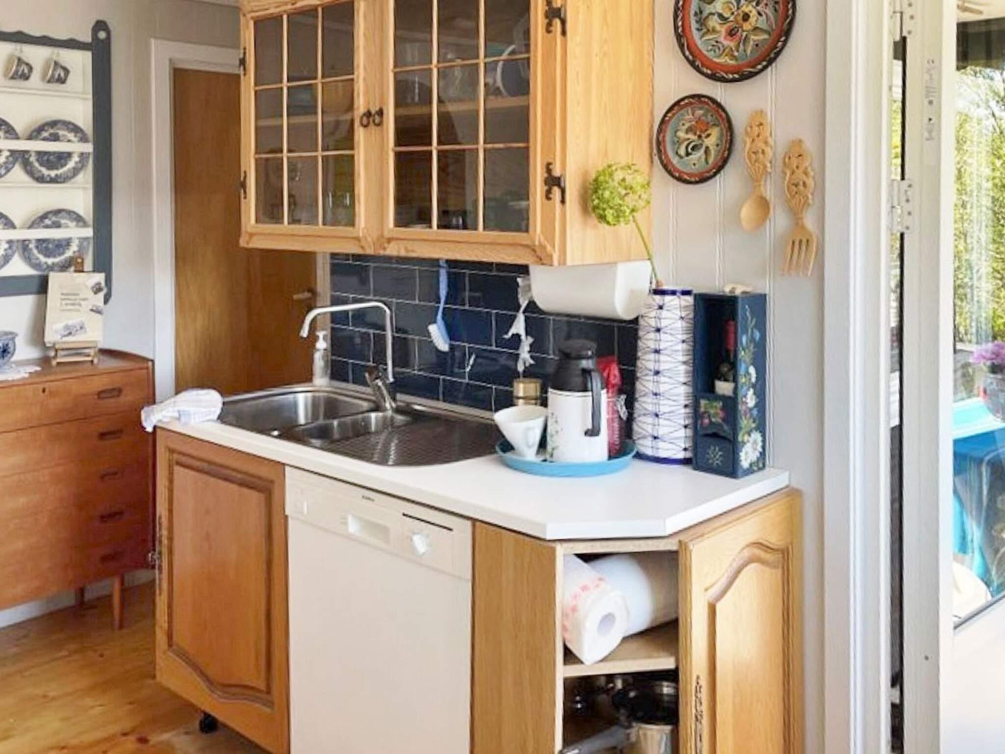 Im Wohnzimmer des Ferienhauses befindet sich u.a. auch ein gemütlicher Holzofen. Offener Küchen-/Wohnbereich für geselliges Beisammensein und mit Zutritt zu Sitzflächen im Außenbereich. Von dem Balkon vor der Küche führen einige Stufen hinunter zur Terrasse.