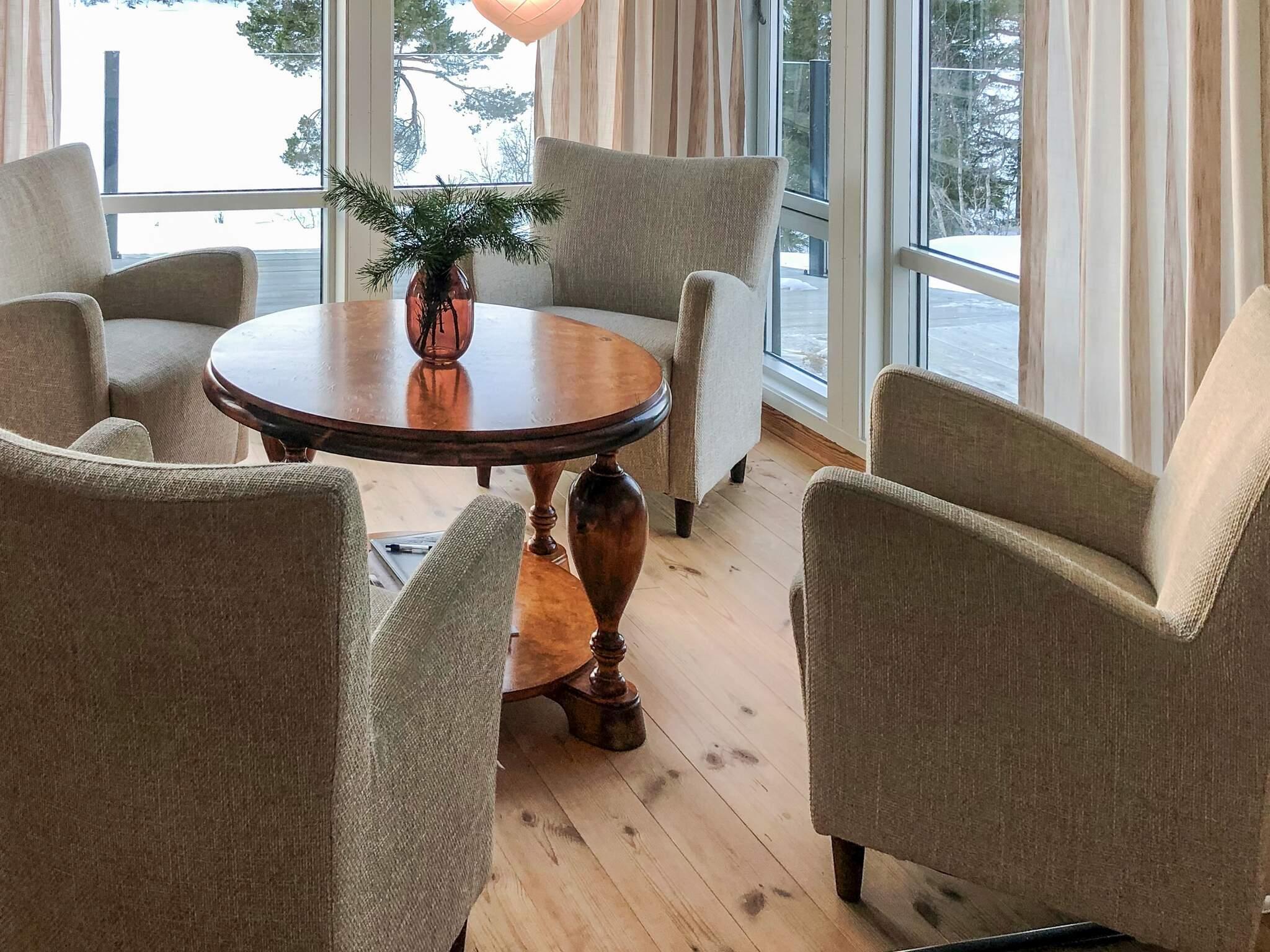 Vom Eingang zum Ferienhaus gelangt man über einen Flur, mit Fußbodenheizung sowie Garderobenregalen und Haken, in einen offenen Raum mit Türen zu 3 Schlafzimmern sowie zum Badezimmer und zur Toilette. Vom offenen Raum aus gelangt man auch weiter zum schönen offenen Wohnraum mit Küche und nach oben in die obere Etage. Vom Wohnzimmer aus gibt es eine Tür zur geräumigen Veranda mit herrlichem Blick auf das Wasser. Auf der oberen Ebene befinden sich die beiden größten Schlafzimmer mit einem Flur dazwischen.