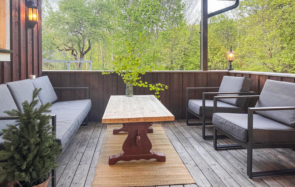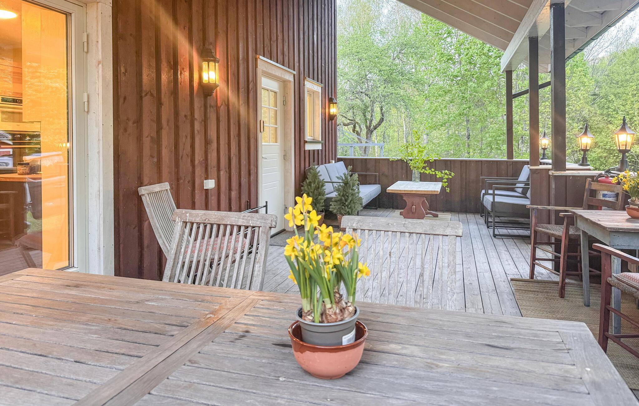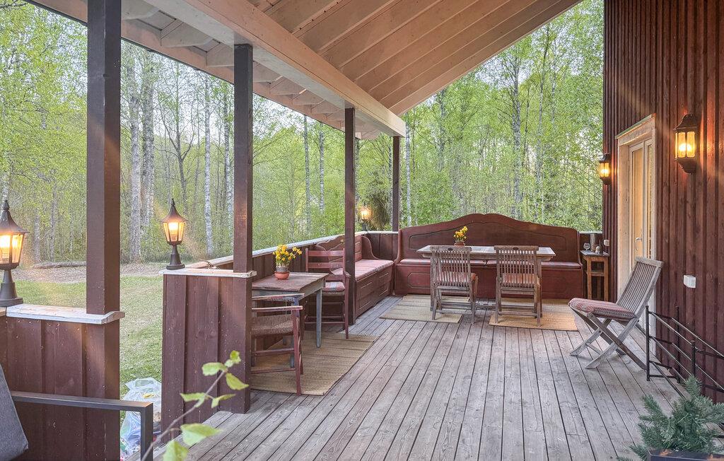 Nehmen Sie Platz auf der großzügigen, überdachten Holzterrasse. Verbringen Sie hier laue Abende bei einem Glas Wein oder beginnen Sie den Tag mit einem Frühstück in der Morgensonne. Der Außenbereich ist mit verschiedenen Sitzgelegenheiten ausgestattet und fügt sich harmonisch in die umliegende Waldlandschaft ein. Direkt vor der Tür beginnen Wanderwege, die Sie tief in die grüne Umgebung führen.