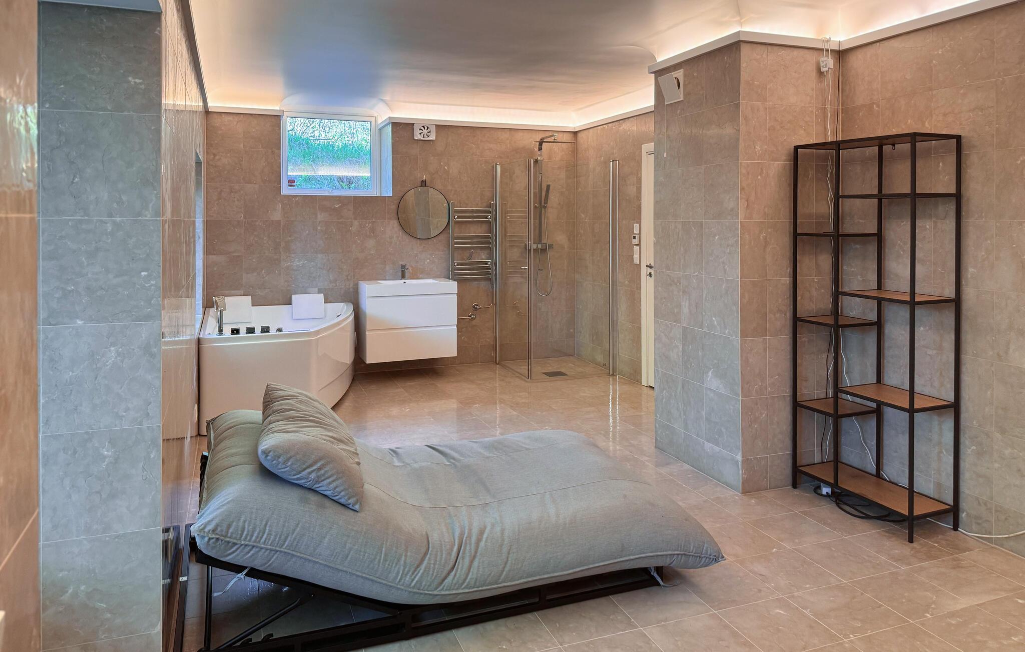Entkommen Sie dem Alltag und finden Sie Ruhe in Ihrem geschmackvoll eingerichteten Haus, das modernen Komfort mit ländlichem Charme verbindet. Die Umgebung lädt zu Aktivitäten an der frischen Luft ein und verspricht Erholung in jeder Jahreszeit. Der liebevoll gestaltete Wohnbereich empfängt Sie mit einer bequemen Eckcouch, Holzfußboden und stilvoller Dekoration. Genießen Sie einen Filmabend am Fernseher oder verbringen Sie gesellige Stunden im angrenzenden Esszimmer mit großem Tisch und warmem Licht. Voll und ganz relaxen können Sie im Whirlpool des Hauses.