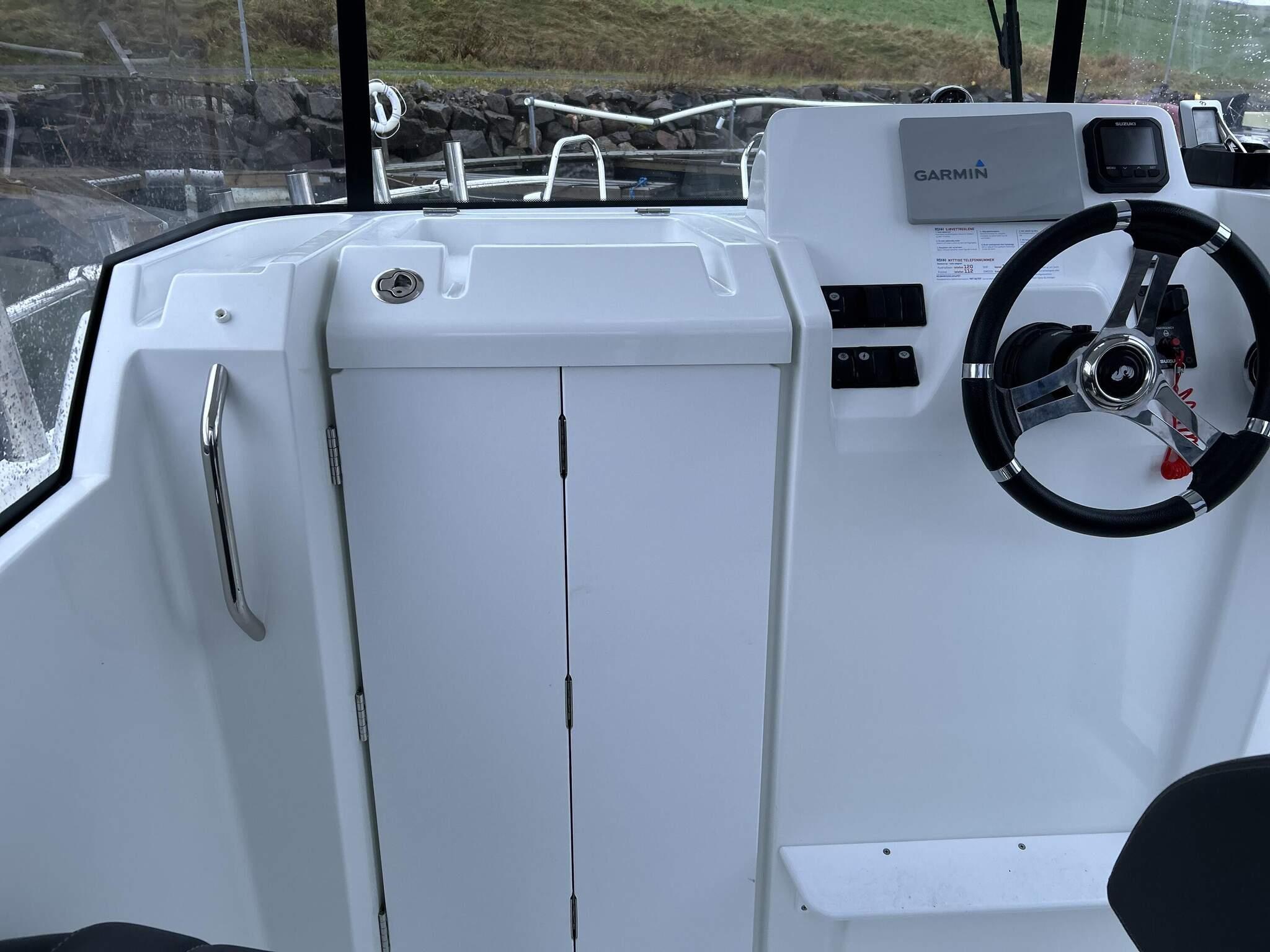 - *ein 23 Fuß Boot (Typ Dolmøy Fiskar) mit 80 PS Yamaha Motor, Kabine, GPS/Kartenplotter/Echolot und 6 Rutenhaltern.