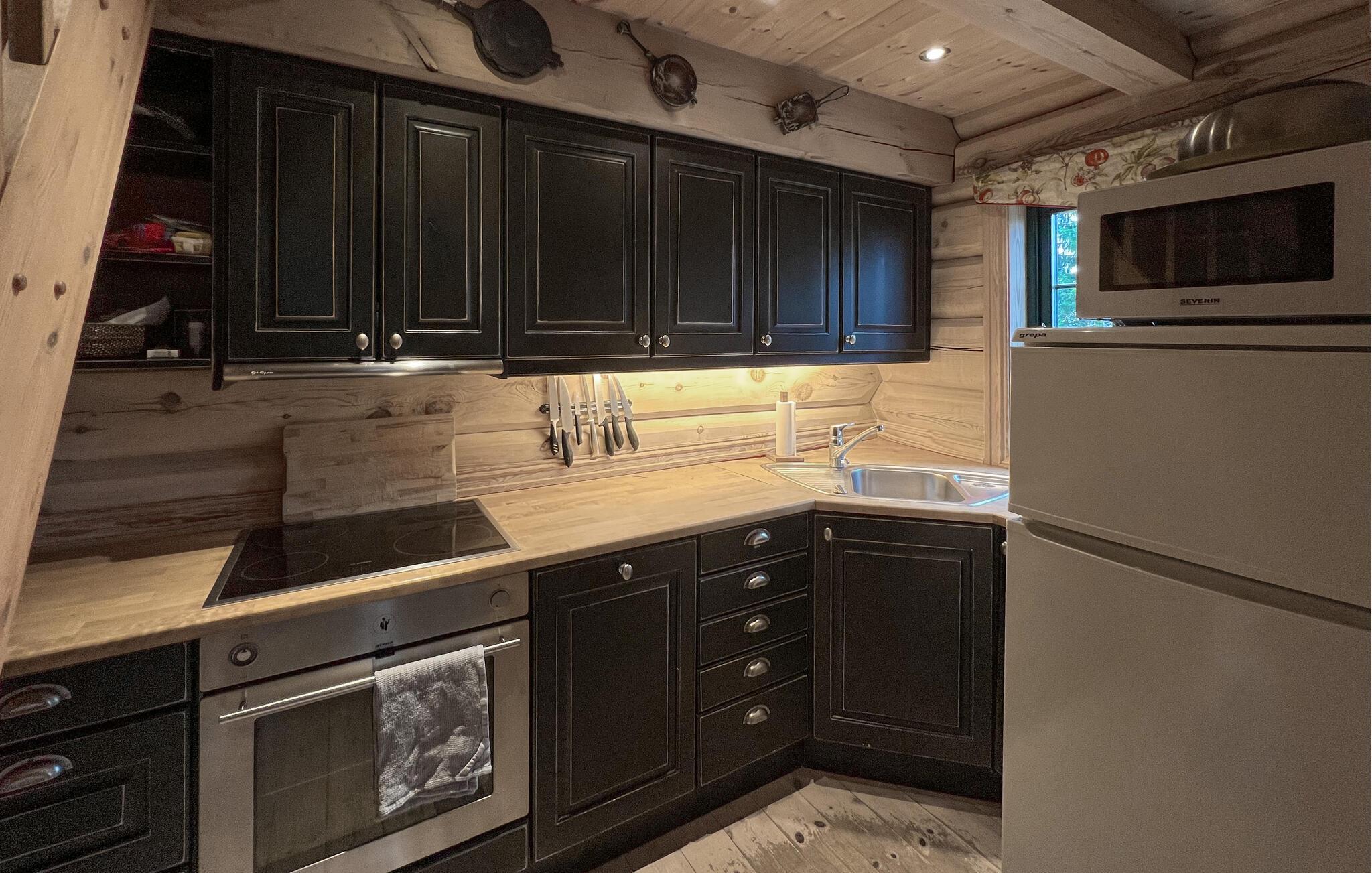 Genießen Sie Ruhe, Komfort und norwegisches Hüttenflair in dieser traditionellen Blockhütte, die sich mit ihrem Naturdach harmonisch in die Landschaft einfügt. Umgeben von Wäldern und Wiesen finden Sie hier den idealen Ort, um dem Alltag zu entfliehen und neue Energie zu tanken. Der Wohnbereich mit sichtbaren Deckenbalken und großen Fenstern strahlt Gemütlichkeit aus. Entspannen Sie in der Sofaecke oder genießen Sie gemeinsame Mahlzeiten am langen Esstisch, während das Feuer im Kaminofen leise knistert. Die Küche mit moderner Ausstattung lädt zum Kochen und Verweilen ein. Nach einem Tag an der frischen Luft sorgt die Sauna für wohlige Entspannung und Erholung. Im Obergeschoss erwartet Sie ein weiterer Wohnraum – ideal zum Lesen, Spielen oder Fernsehen.