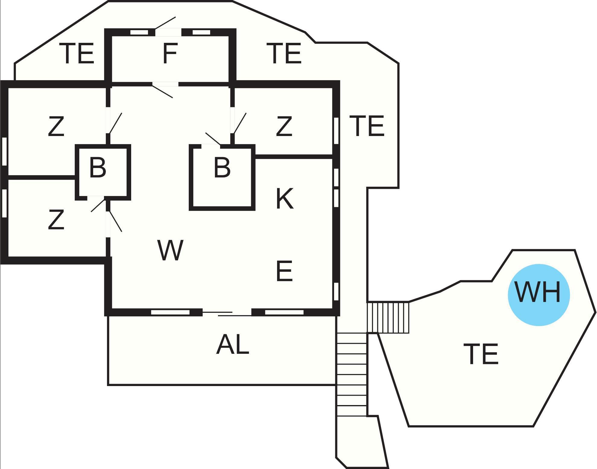 Zwei Badezimmer (eines mit Regendusche) und drei schöne Schlafzimmer; Einzelbett 80 cm breit, Etagenbett mit unten 120 cm + oben drüber 90 cm Koje. Wohnzimmer im Untergeschoss mit Küche, Kamin, langem Tisch, Fernseher und Kinoleinwand mit Projektor.