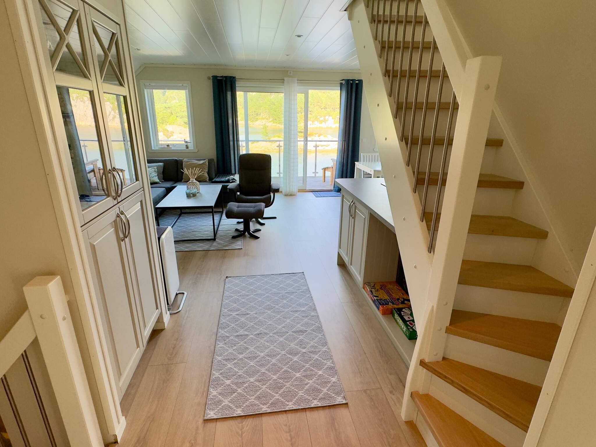 Helles, modernes Ferienhaus im eleganten, maritimen Rorbu-Stil direkt am Wasser. Innen mit hoher Qualität. Maritime Umgebung und kurze Entfernung zu schönen Angelplätzen.