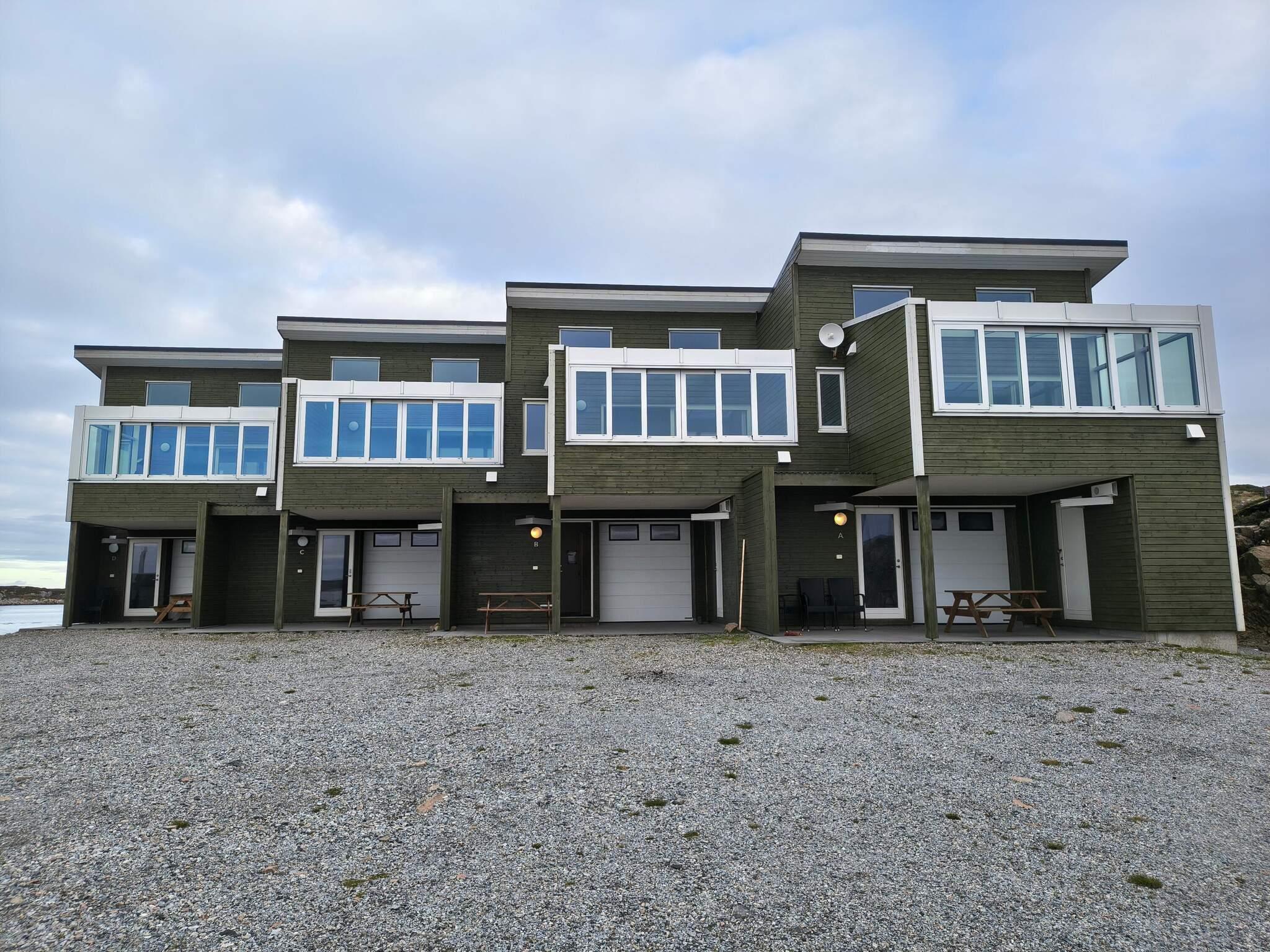 Sie bewohnen hier das eine von vor Ort vier baugleichen Reihenhäusern im Rorbu-Stil. Dieses Objekt steht als 3. von der Seeseite aus gesehen. Zutritt vom Wohnbereich zur verglasten Veranda, mit Sonne ab dem Vormittag und bis in die Abendstunden, vom Wohnbereich aus. Die Fenster der Veranda können weit geöffnet werden. Am Eingang des Hauses gibt es zudem eine überdachte Terrassenfläche.