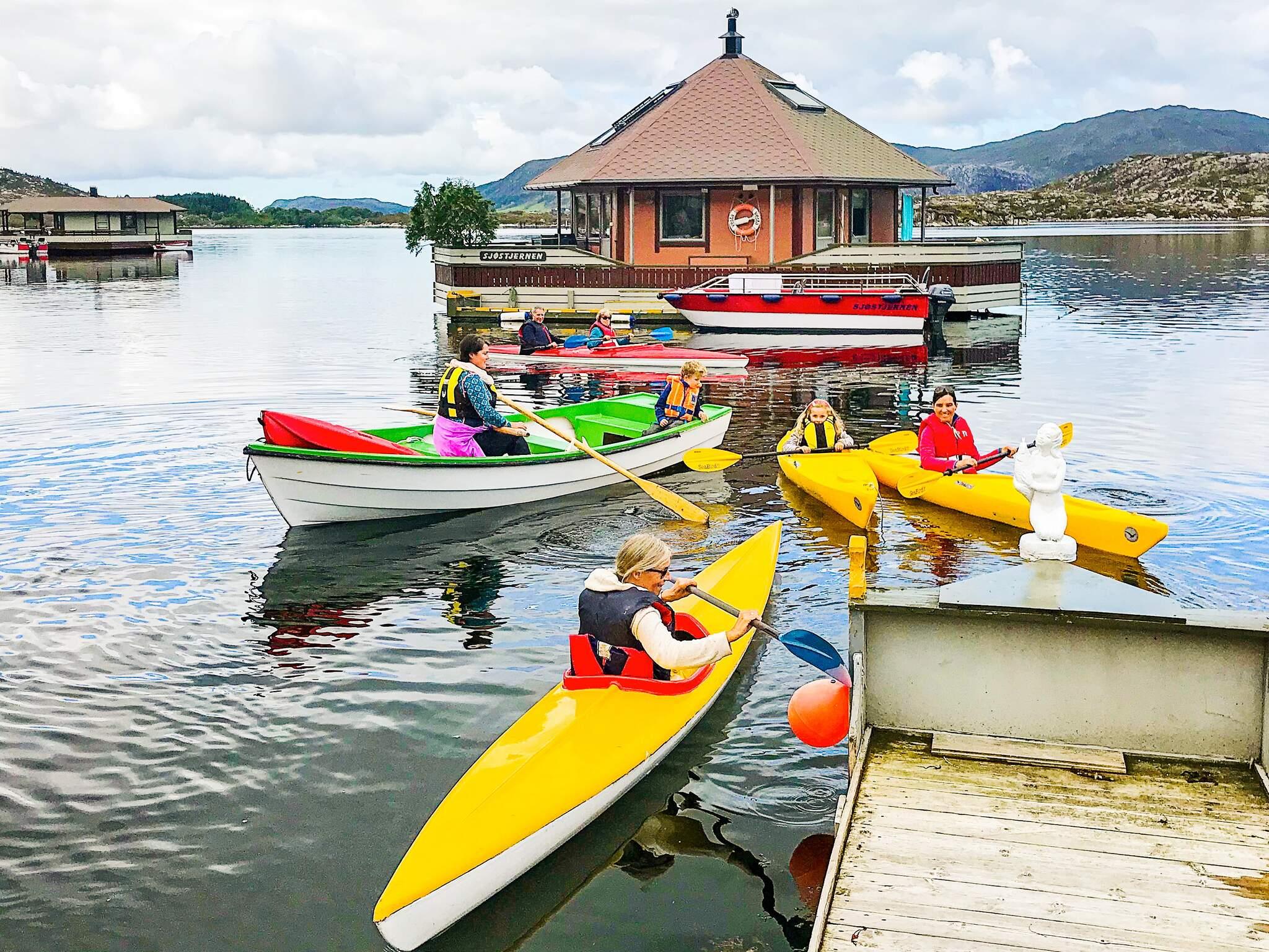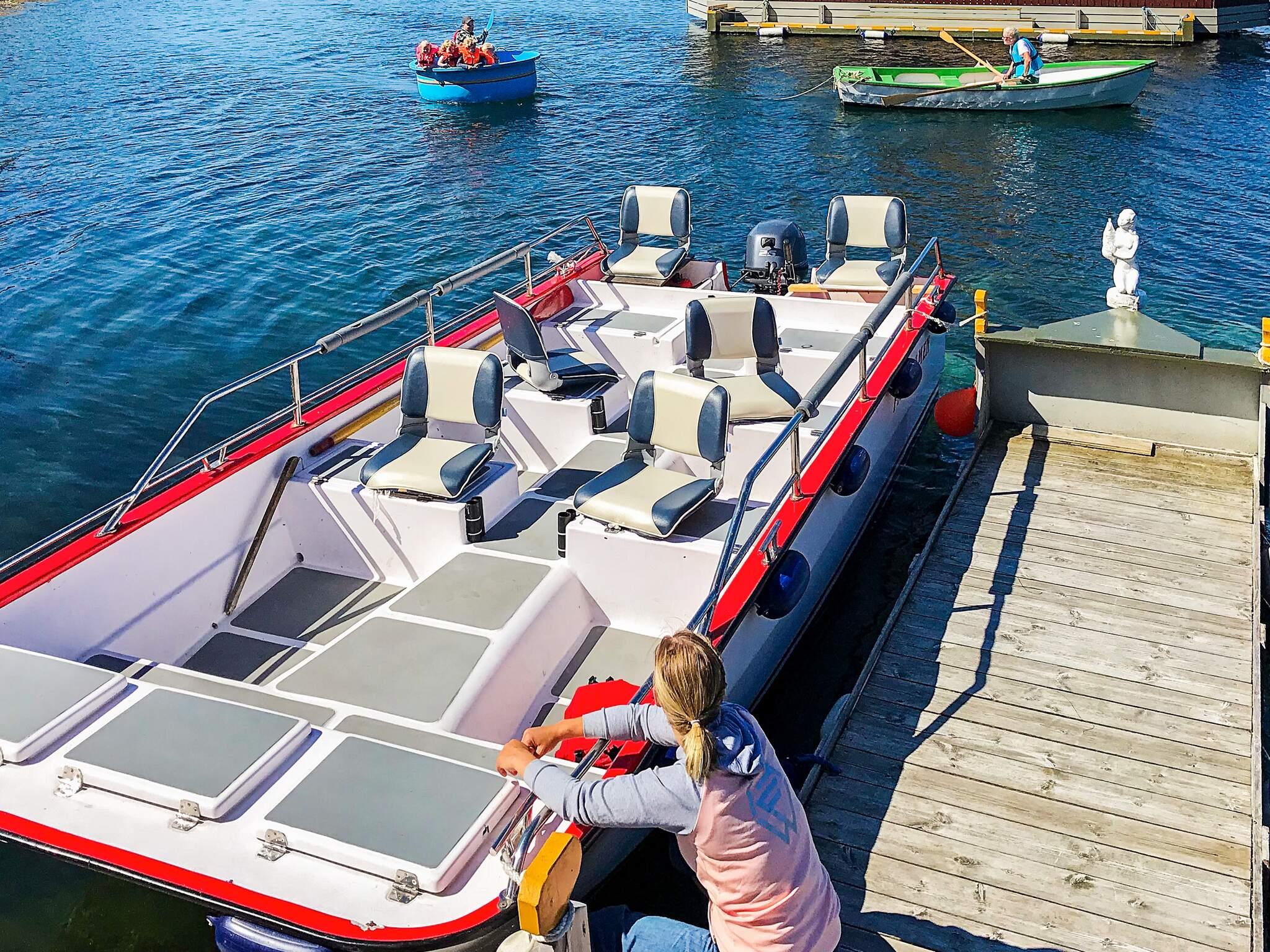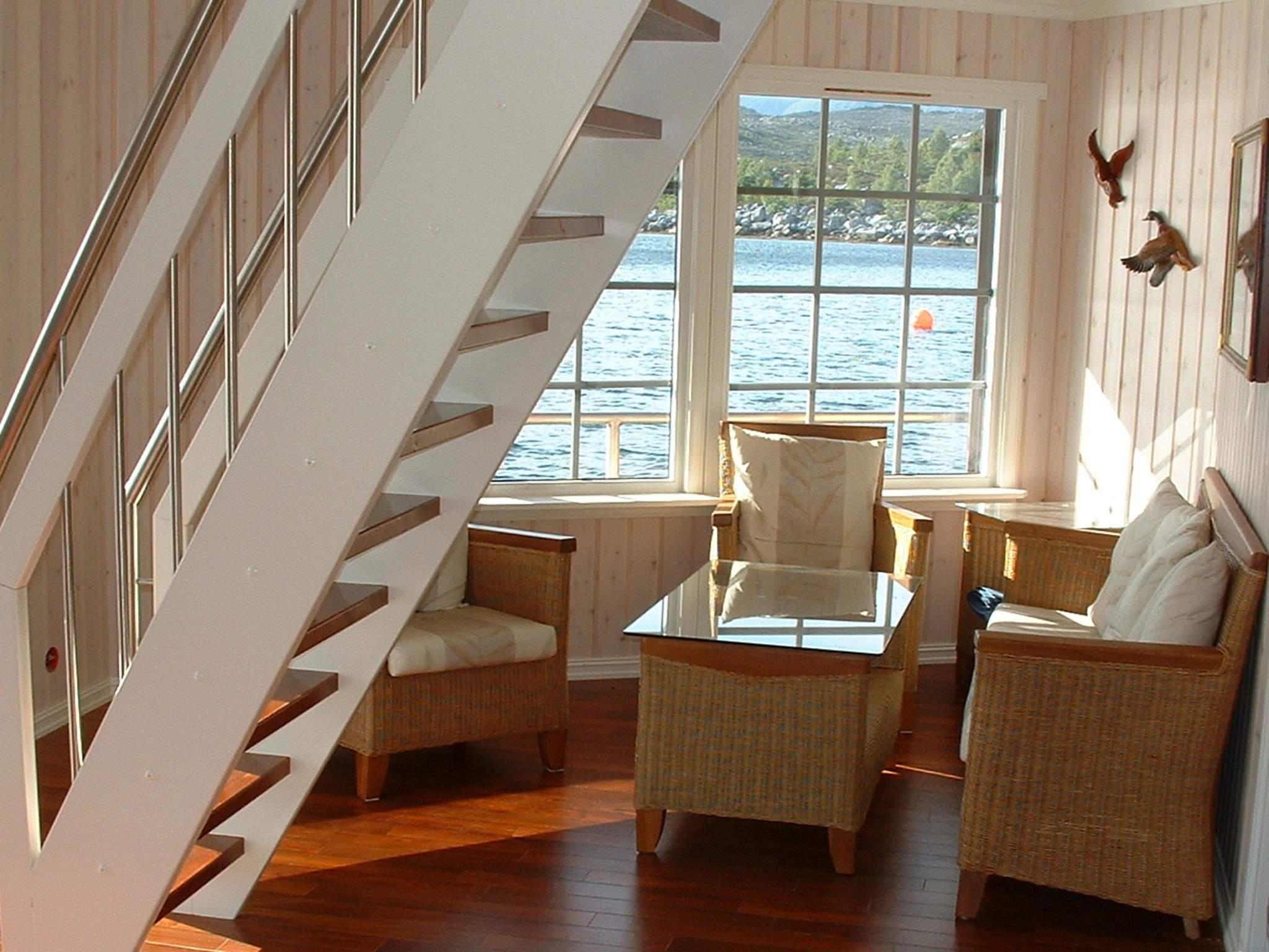 Das Haus hat insgesamt 50 m² offene Verandafläche, verteilt auf 3 Hausecken, die durch überdachte Passagen untereinander verbunden sind. An der einen Hausseite wurde, um den Zugang zu den Booten zu erleichtern, ein Schwimmsteg errichtet. Das Haus ist umweltfreundlich und verursacht keine Eingriffe in die Natur. Alle Zimmertüren wurden passenderweise mit Bullaugen ausgestattet. Sogar vom Bad aus Zugang zur Veranda. Zeitgemäße Küchenausstattung, darunter Gasherd mit Backofen. Die Wärmepumpe kann im Sommer auch als Klimaanlage genutzt werden. Geschmackvoll eingerichtet und mit herrlichem Ausblick durch die großen Fenster. Der gasbefeuerte Kamin sorgt an kühleren Tagen für wohlige Wärme. TV m. 20 norw./engl. Sendern zur Auswahl, außerdem 100 MB zum Streamen eigener Anbieter. Ein Schlafzimmer mit Fenster zur Veranda.