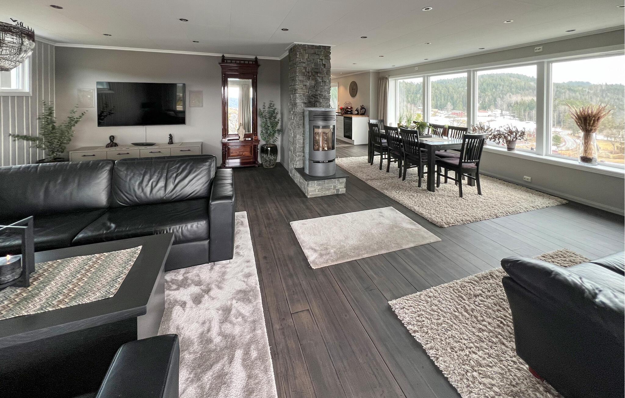 Dieses großzügige Ferienhaus bietet den idealen Rahmen für entspannte Tage inmitten der bezaubernden norwegischen Natur. Genießen Sie modernes Wohnen mit weitem Panoramablick, stilvollem Interieur und direktem Zugang zum See. Machen Sie es sich in dem weitläufigen Wohnbereich mit großen Fenstern, Kaminofen und gemütlichen Sofas bequem. Schauen Sie gemeinsam Filme, entspannen Sie bei einem Buch oder verbringen Sie gesellige Abende am Esstisch. Die offene Küche mit Kochinsel und ausreichend Platz lädt zu gemeinsamen Kochmomenten ein. Starten Sie den Tag mit einem Frühstück in der hellen Sitzecke und lassen Sie ihn in der privaten Sauna ausklingen.