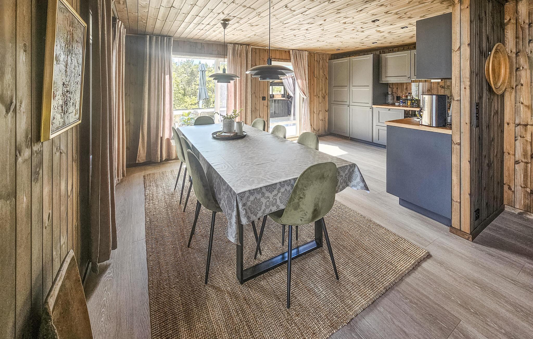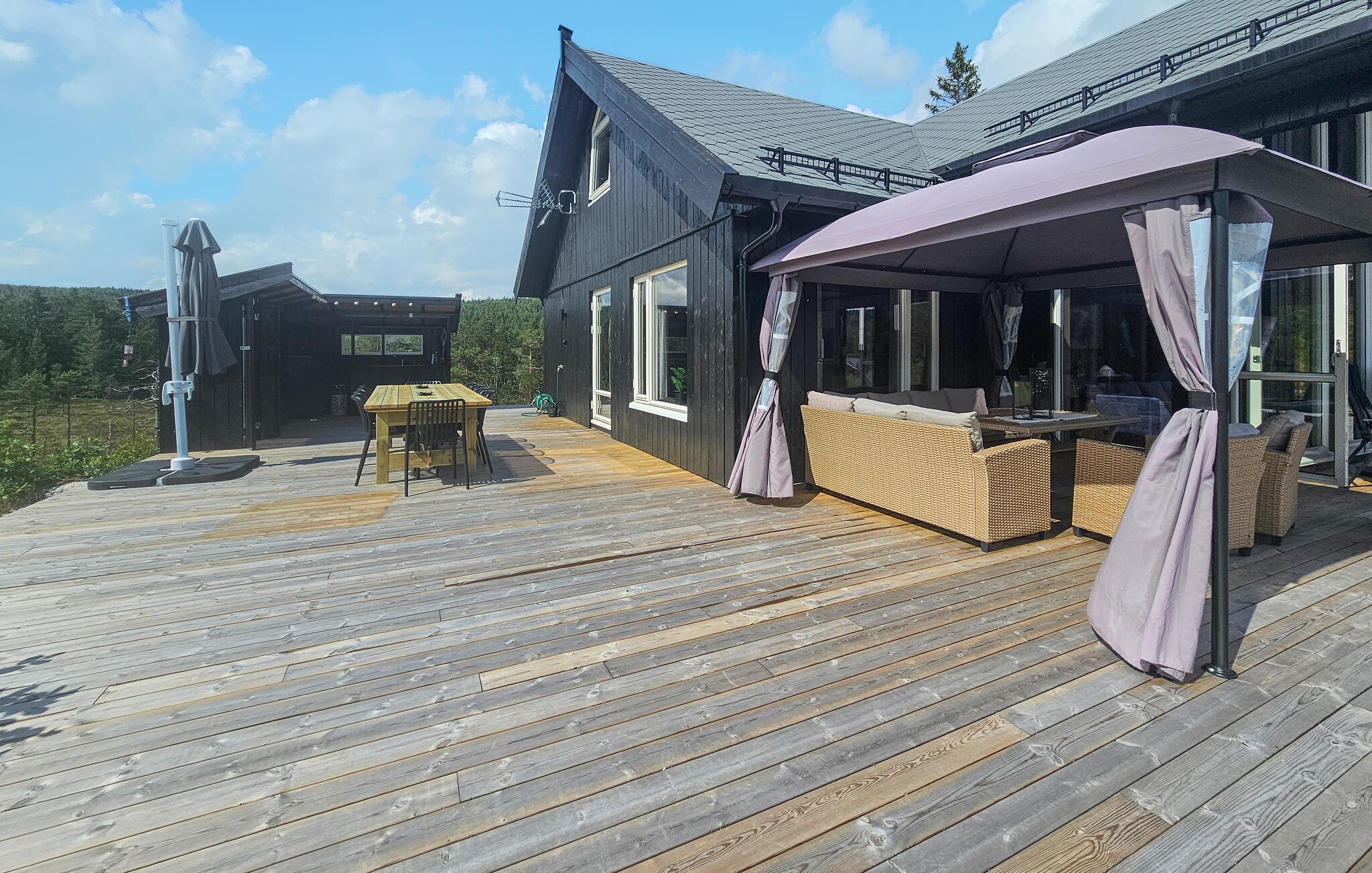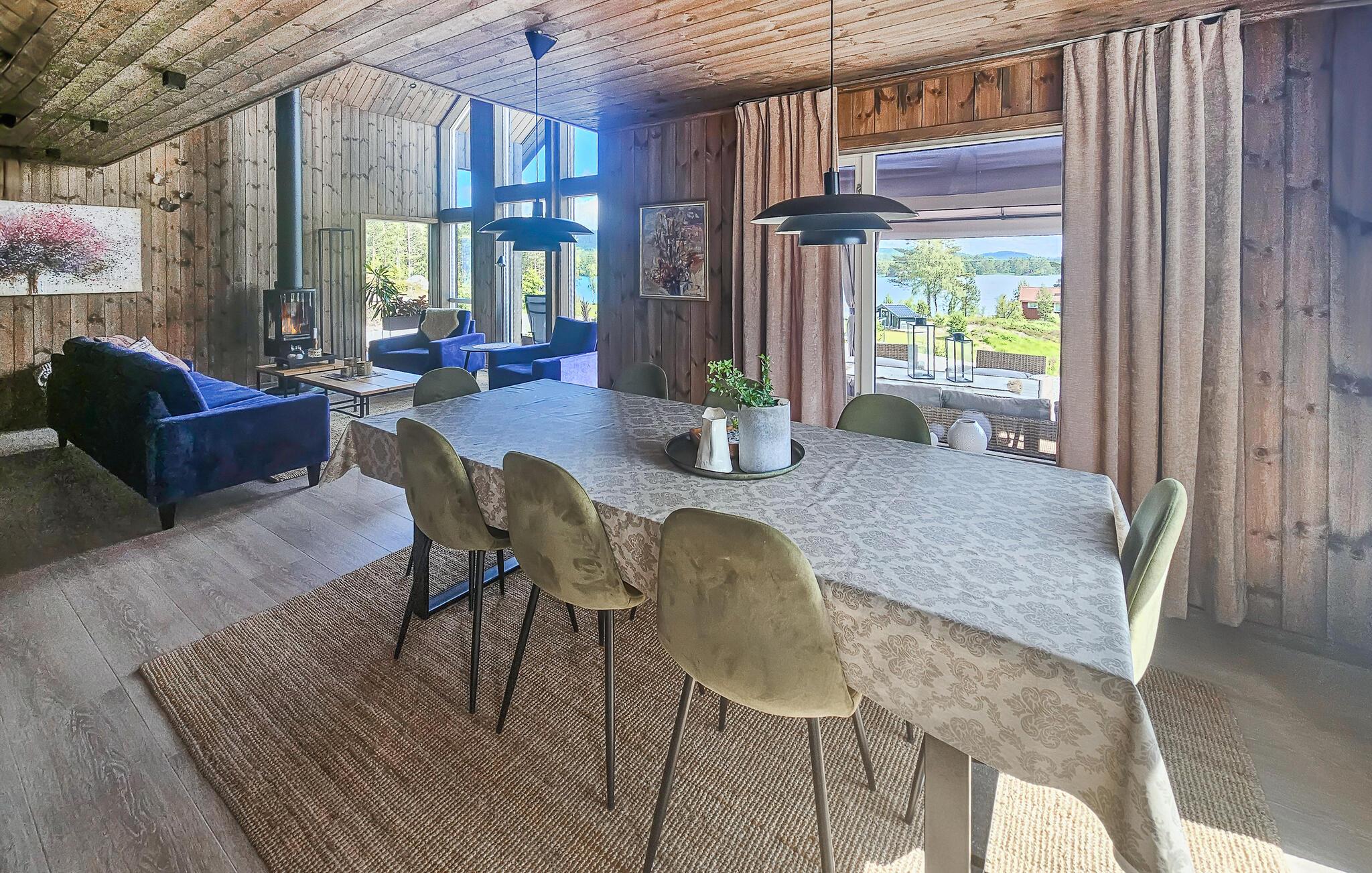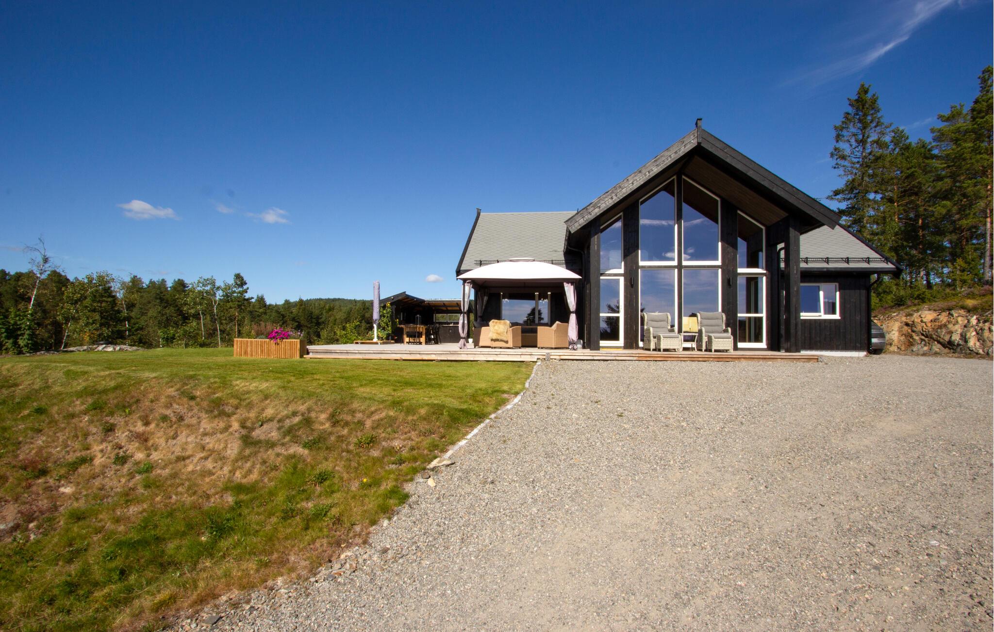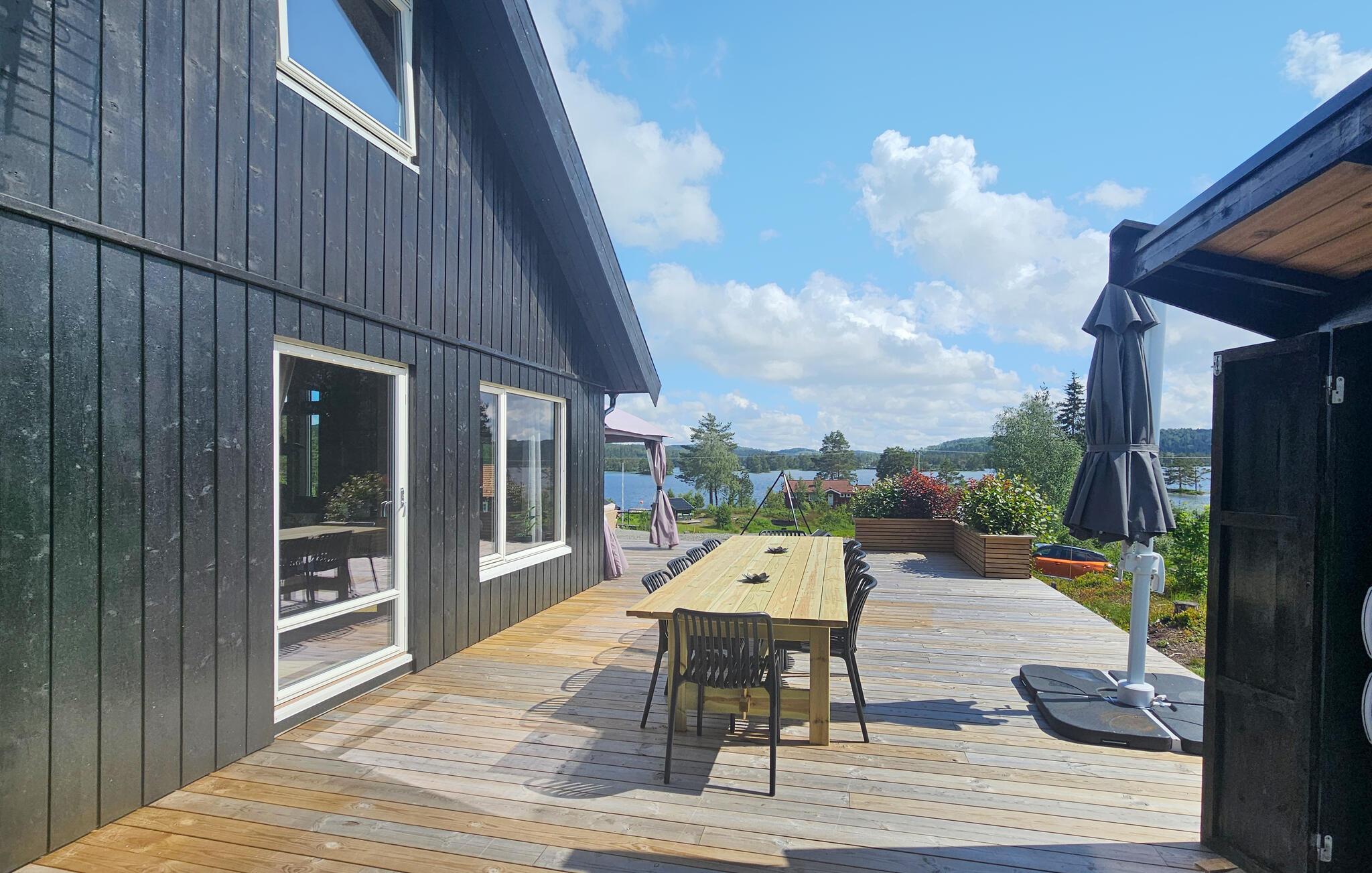 Direkt am malerischen See Sørfjorden gelegen, erwartet Sie dieses traumhafte Ferienhaus in Vegårshei zu einem erholsamen Norwegen-Urlaub. Ihr modernes und stilvolles Haus bietet Ihnen einen schönen Blick auf den See und eine ansprechende Innenausstattung. Beginnen Sie Ihren Tag mit einem Frühstück auf der großzügigen Terrasse, von der aus Sie den weiten Blick über den See und die umliegende Natur genießen können. Die Außenküche mit Grill bietet die Gelegenheit, Ihre Mahlzeiten im Freien zuzubereiten und an der frischen Luft zu genießen. Die gemütlichen Sitzgelegenheiten laden dazu ein, den Tag in Ruhe ausklingen zu lassen.