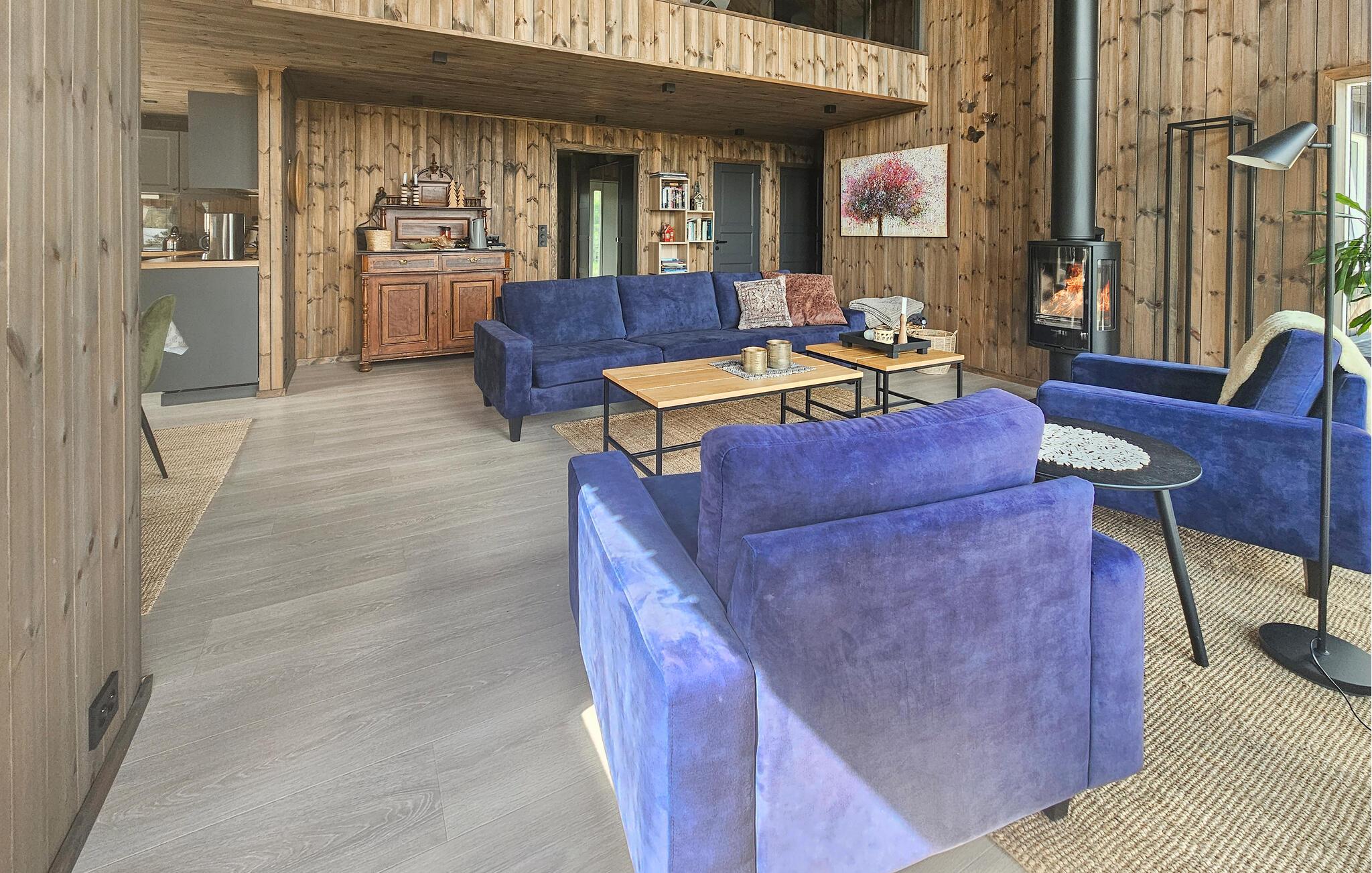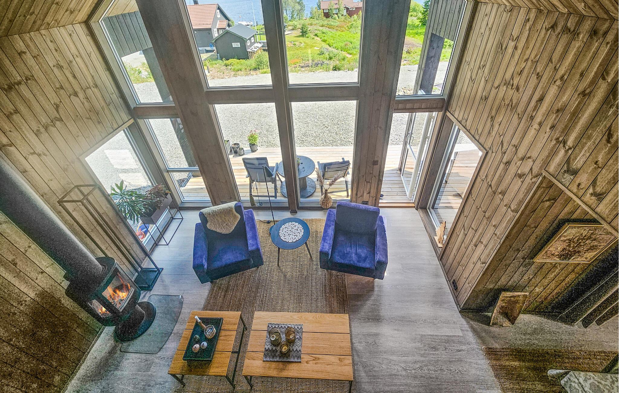 Im Inneren des Hauses erwartet Sie ein lichtdurchfluteter Wohnbereich mit Panoramafenstern, die einen herrlichen Ausblick auf den See bieten. Die bequemen Sofas und der stilvolle Kamin schaffen eine einladende Atmosphäre, ideal für entspannte Abende. Die schöne Küche, die offen zum Essbereich hin gestaltet ist, lädt zu gemeinsamen Kochabenden ein.