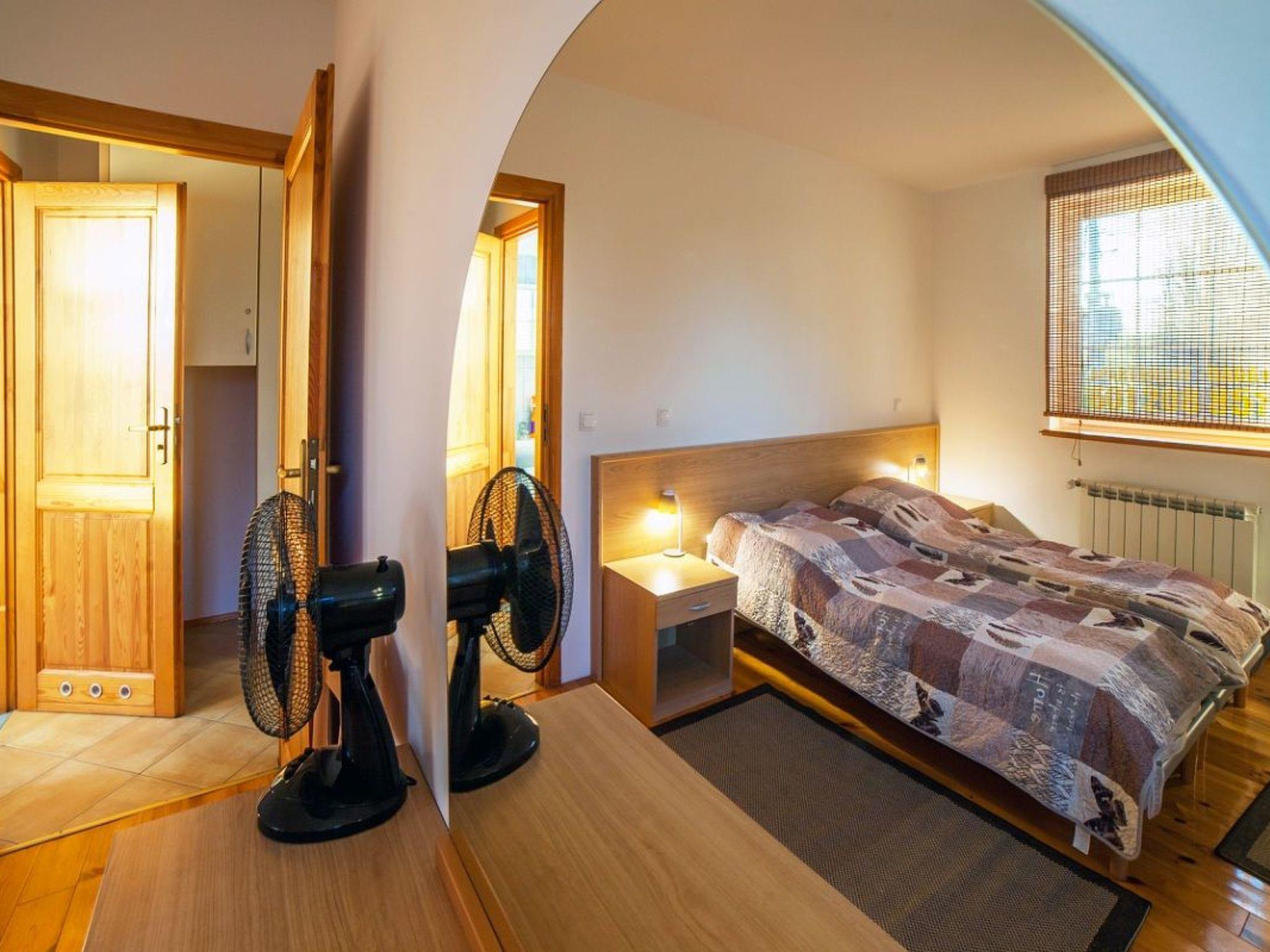 Die Ferienwohnung liegt auf der ersten Etage und bietet fünf Personen Platz. Das Schlafzimmer verfügt über ein großes Doppelbett, ein Einzelbett, einen Kleiderschrank, eine Kommode und zwei Stühle. Das Badezimmer besteht aus einer Dusche, Waschbecken und Toilette. Das Wohn- und Esszimmer mit der offenen Küche bietet eine Schlafcouch für zwei Personen, einen Flachbildfernseher sowie einen Esstisch mit vier Stühlen. Die Küchenzeile ist mit Gasherd, Kühlschrank mit Gefrierfach und Wasserkocher ausgestattet.