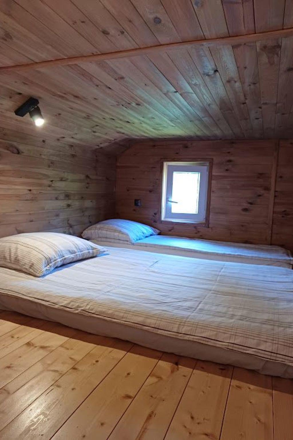 Im Inneren befindet sich ein gemütlicher Wohnbereich mit einem Schlafsofa, kombiniert mit einer Küchenzeile, die mit den wichtigsten Annehmlichkeiten wie einem Gasherd und einem Kühlschrank ausgestattet ist. Ein separates Schlafzimmer mit einem Doppelbett bietet Privatsphäre und eine komfortable Erholung, während ein zusätzlicher Schlafbereich im Zwischengeschoss, der über eine Dachbodentreppe erreichbar ist, zum Lieblingsplatz für jedes Kind wird. Das Badezimmer des Hauses ist mit einer Dusche und einem Bidet ausgestattet, was die Funktionalität und den Komfort des Aufenthalts noch erhöht.