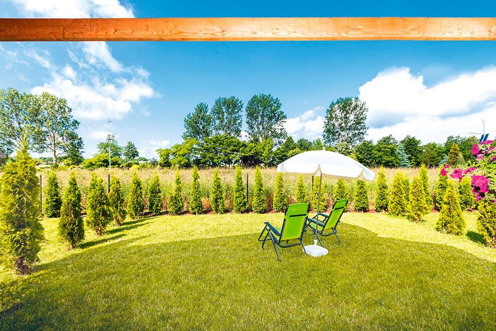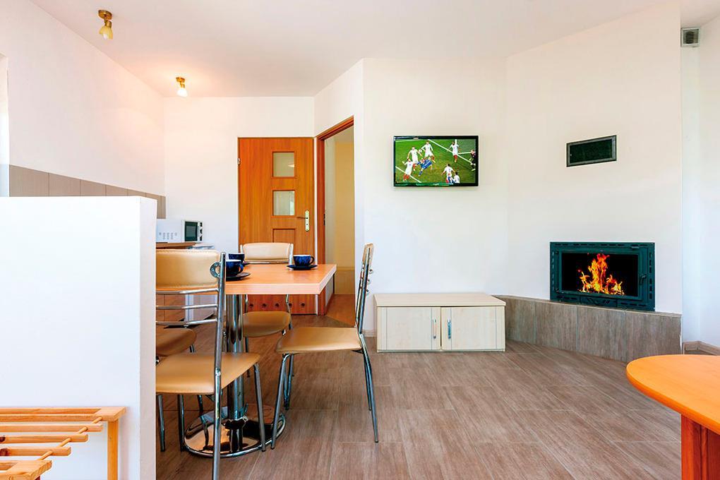 PL 38.75 Ferienhaus 2-4 Pers.: 2-Zimmerhaus mit 35 qm Wohnfläche. Wohn-/Essraum mit Kamin, Sofa (Schlafcouch 2 Pers.), Sat-TV mit deutschen Programmen, Esstisch, Küchenzeile (Ceranfeld 2 Pl., Mikrowelle, Spülmaschine). Doppelzimmer. Bad/WC. Überdachte Terrasse mit Sitzmöbeln, Grill und anschließender Rasenfläche.